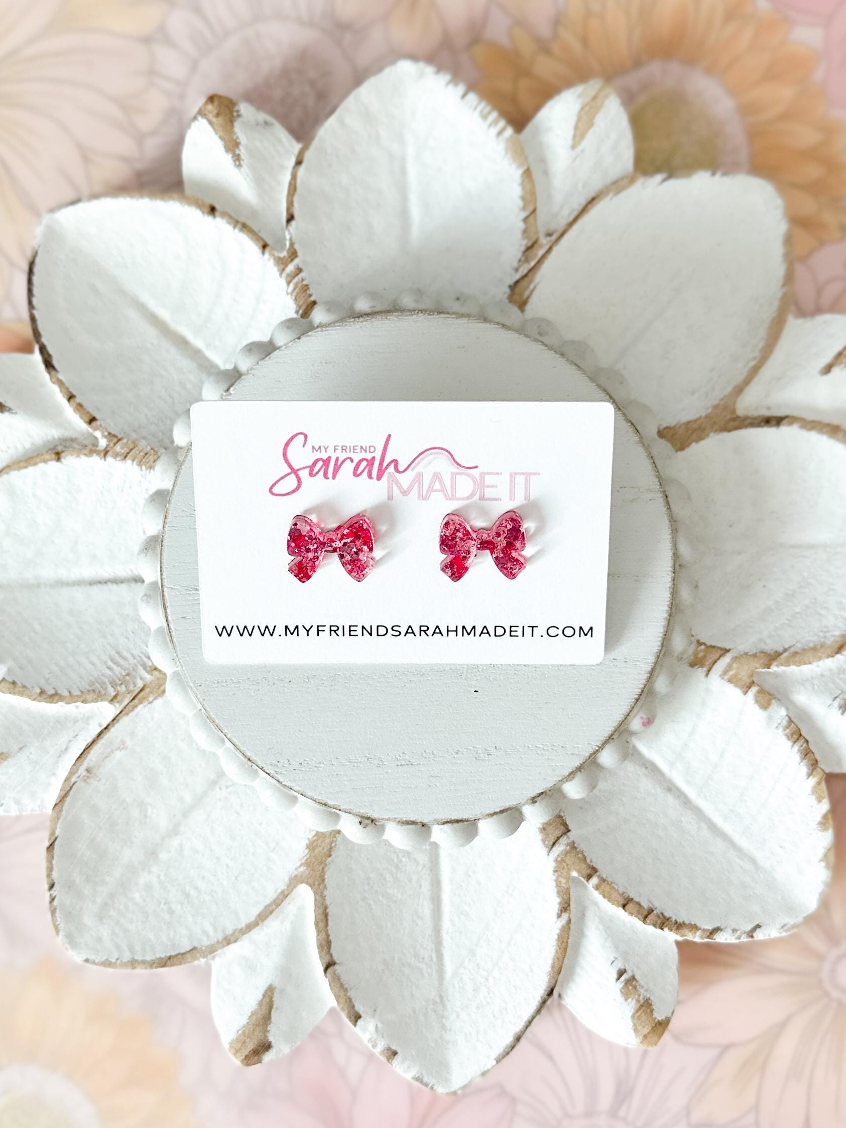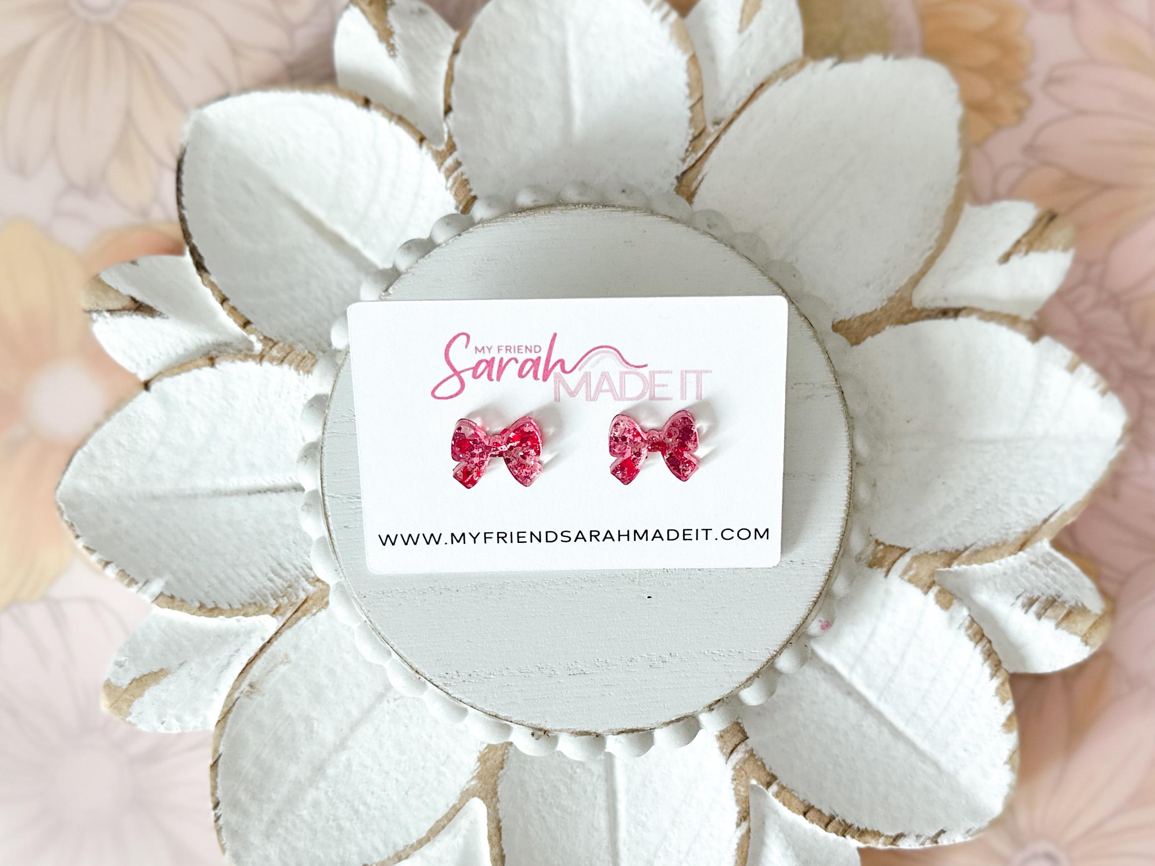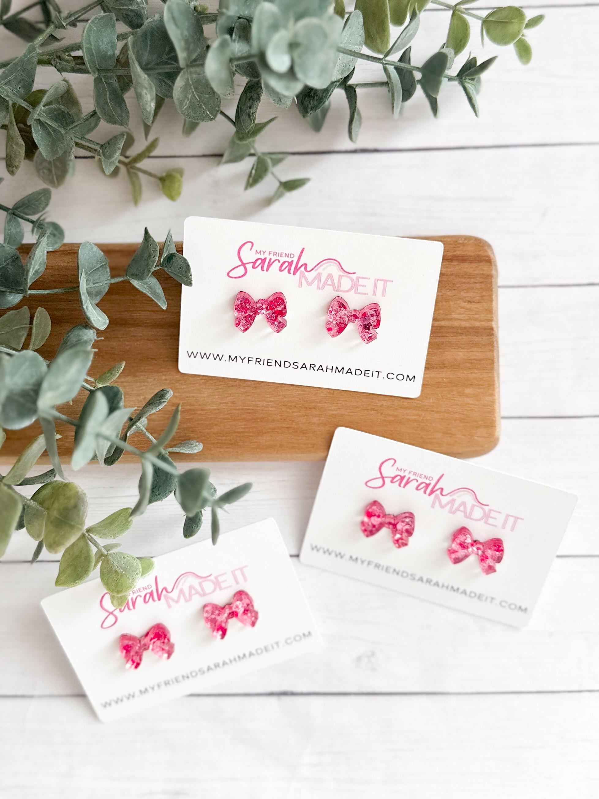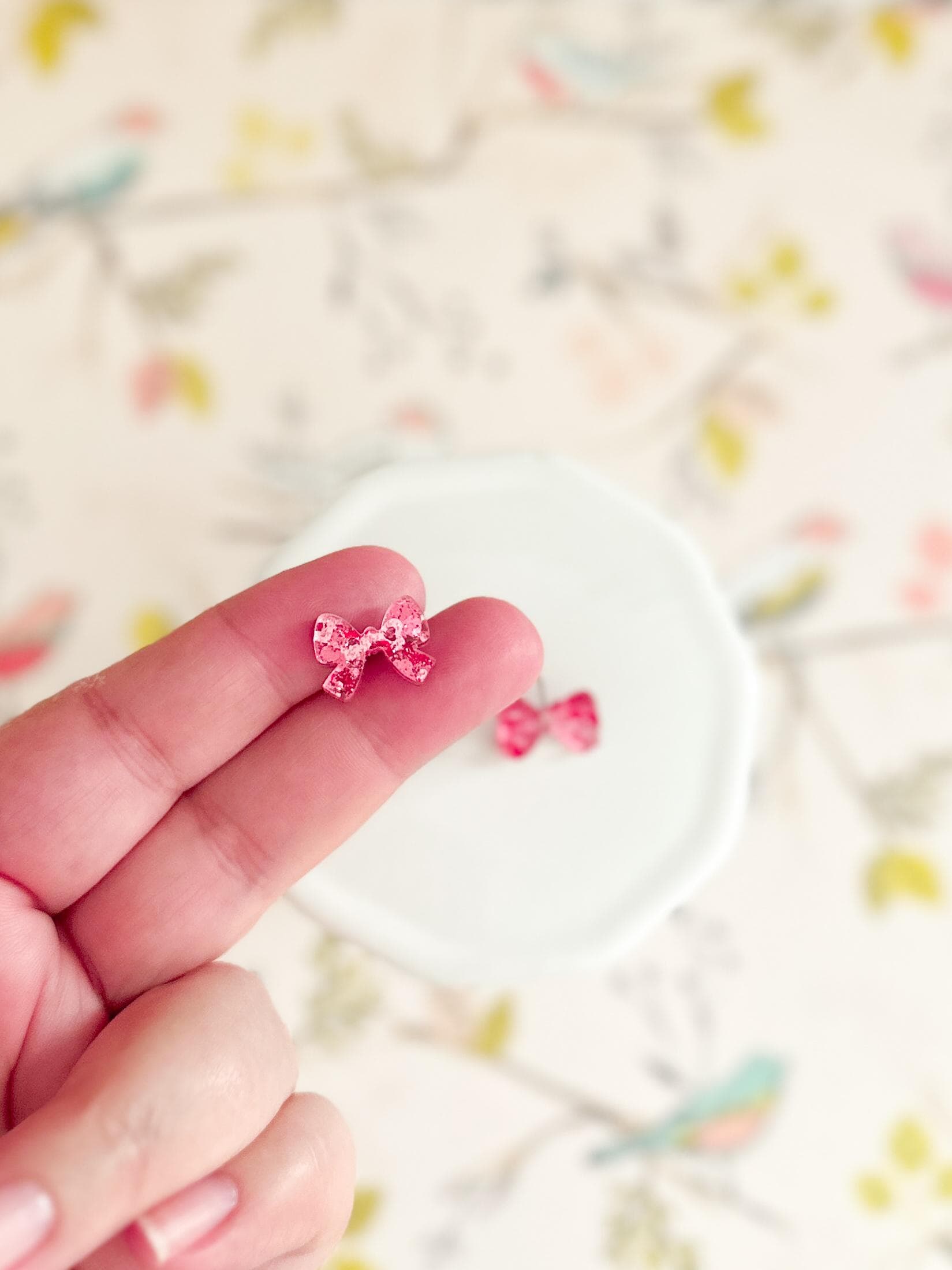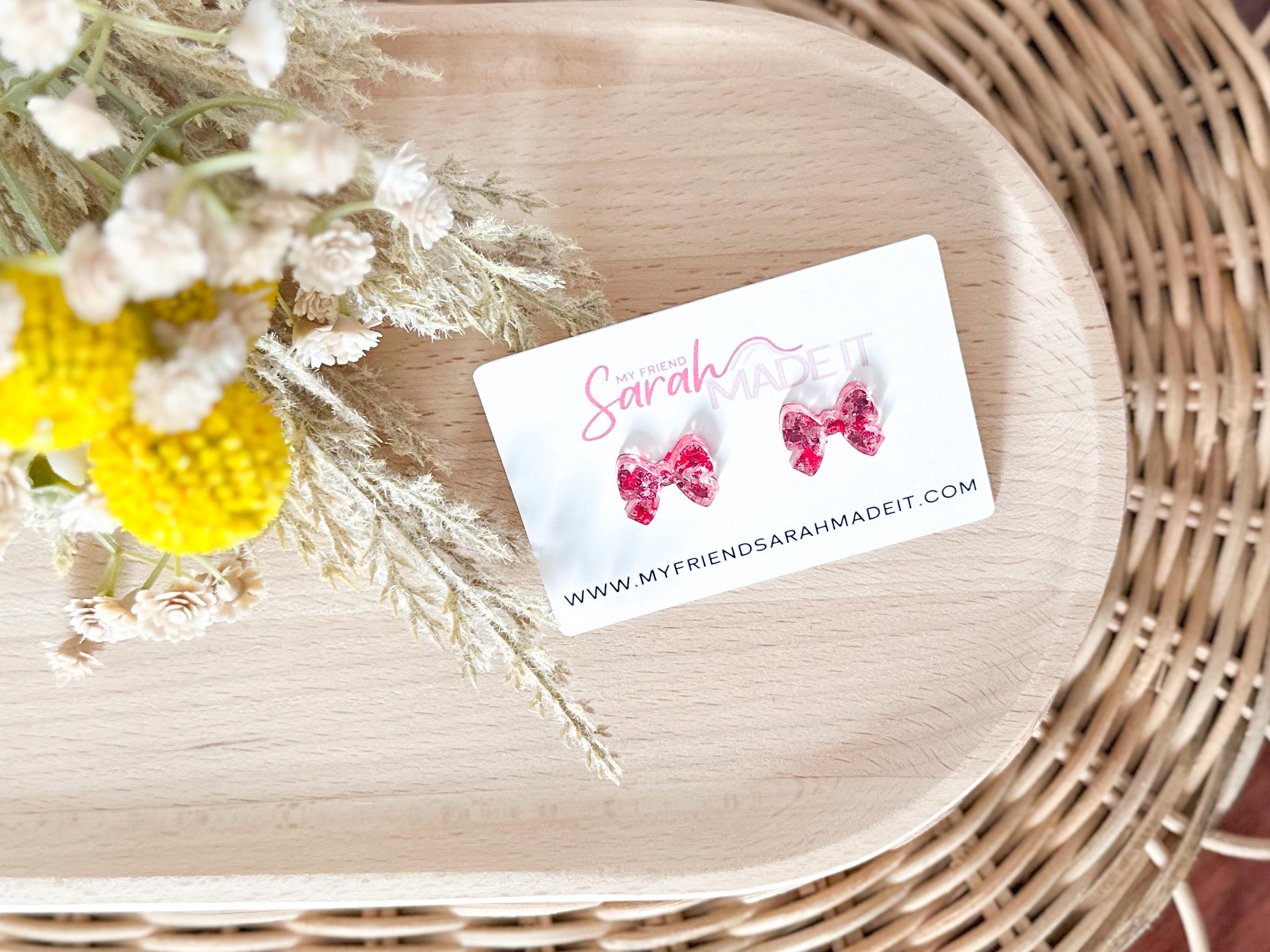 These clear acrylic bows are bursting with pink heart confetti - laser cut and finished with resin-set posts for a comfy, secure hold. A fun little way to finish off your Valentine look with a sparkle!