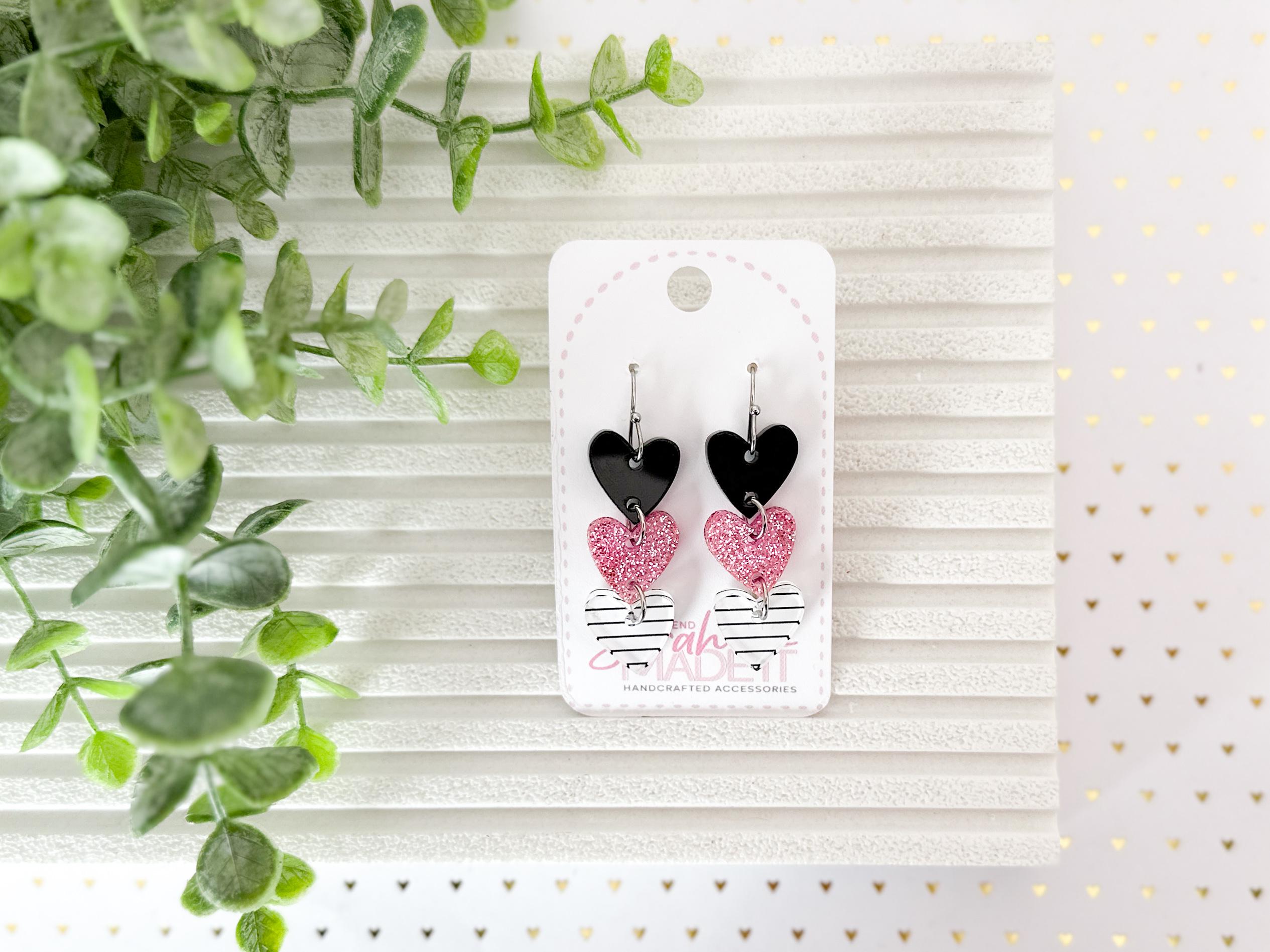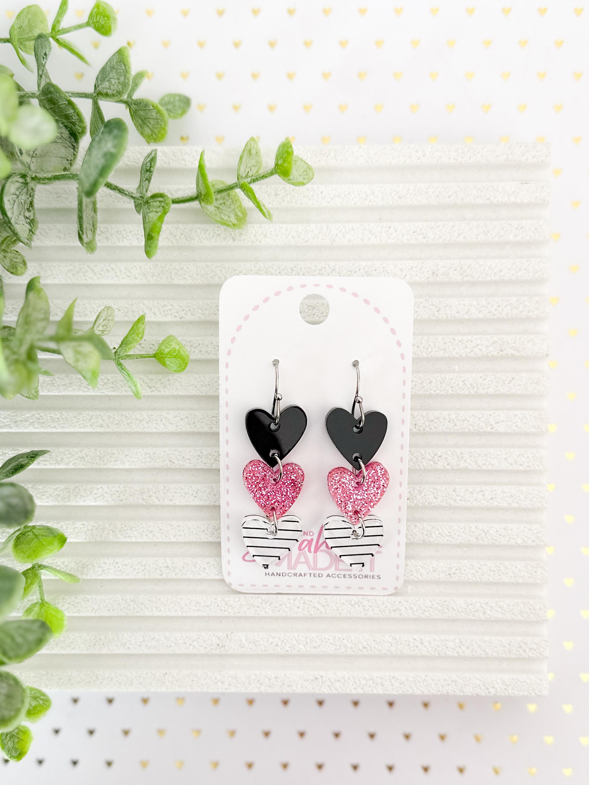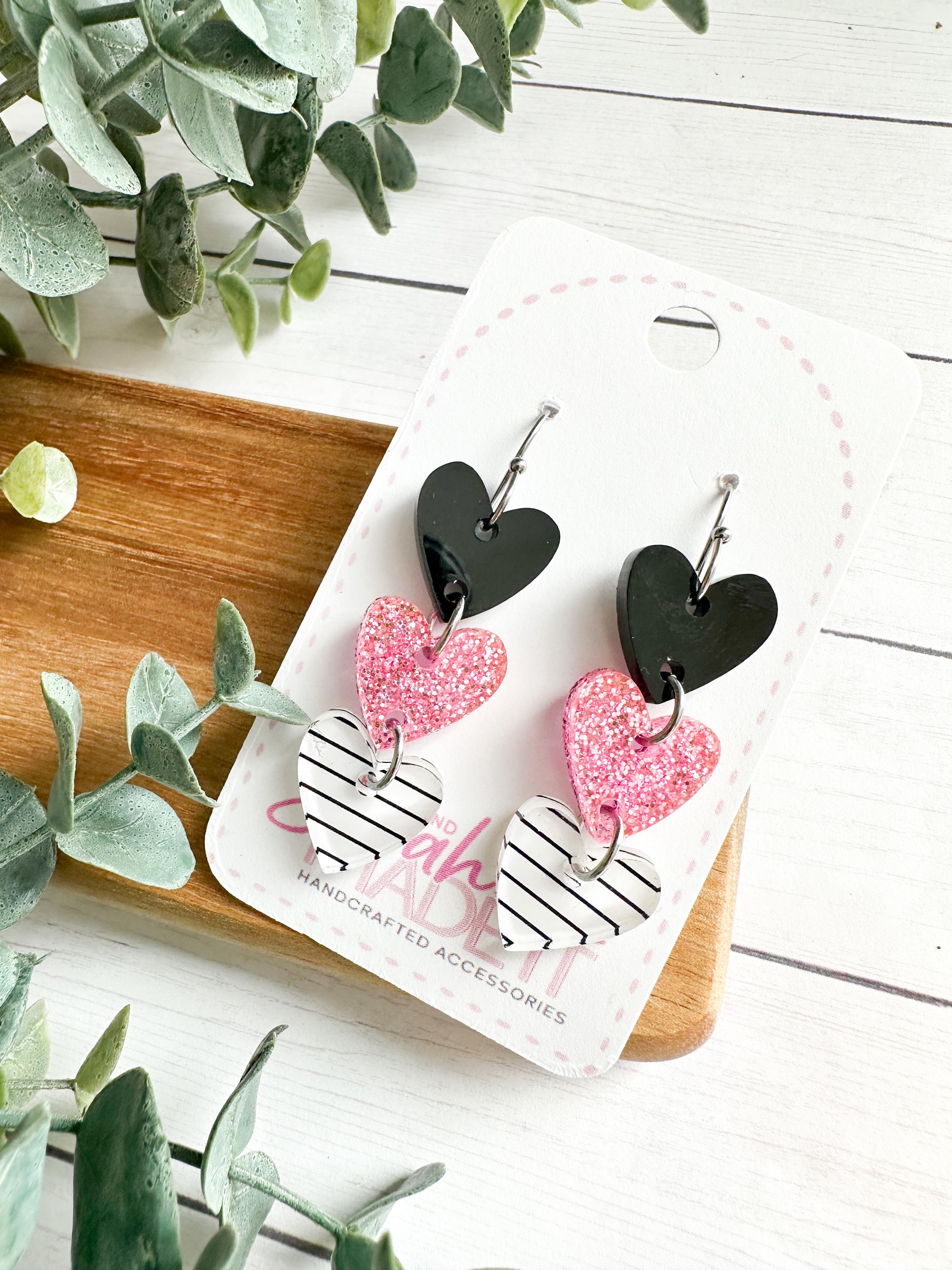 A fun, whimsical heart stack in three unique acrylic shades. Starting at the top with a bold black heart, a shiny rose pink glitter heart, and finally a white heart with thin black pin-striping. These are adorable, they're lightweight, they're such a fun choice for Valentine's day or to add a touch of sweetness to your overall look.