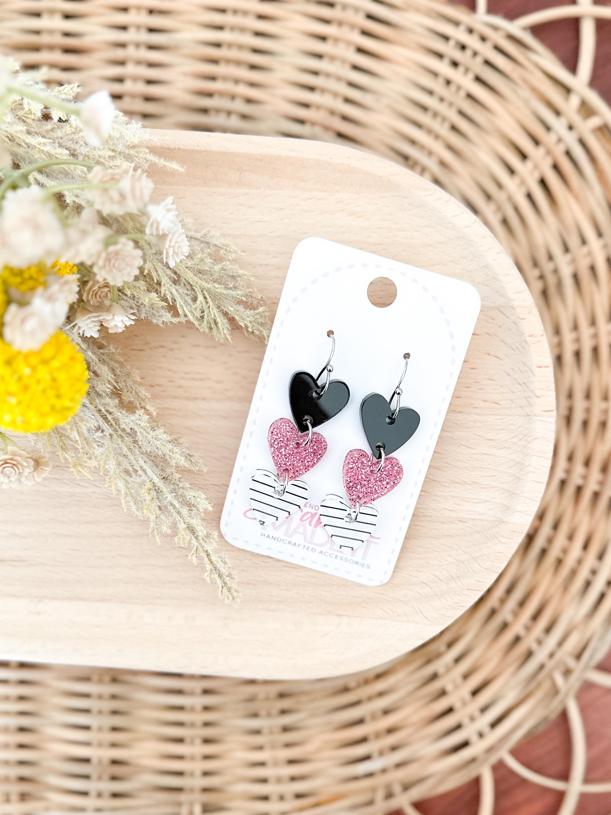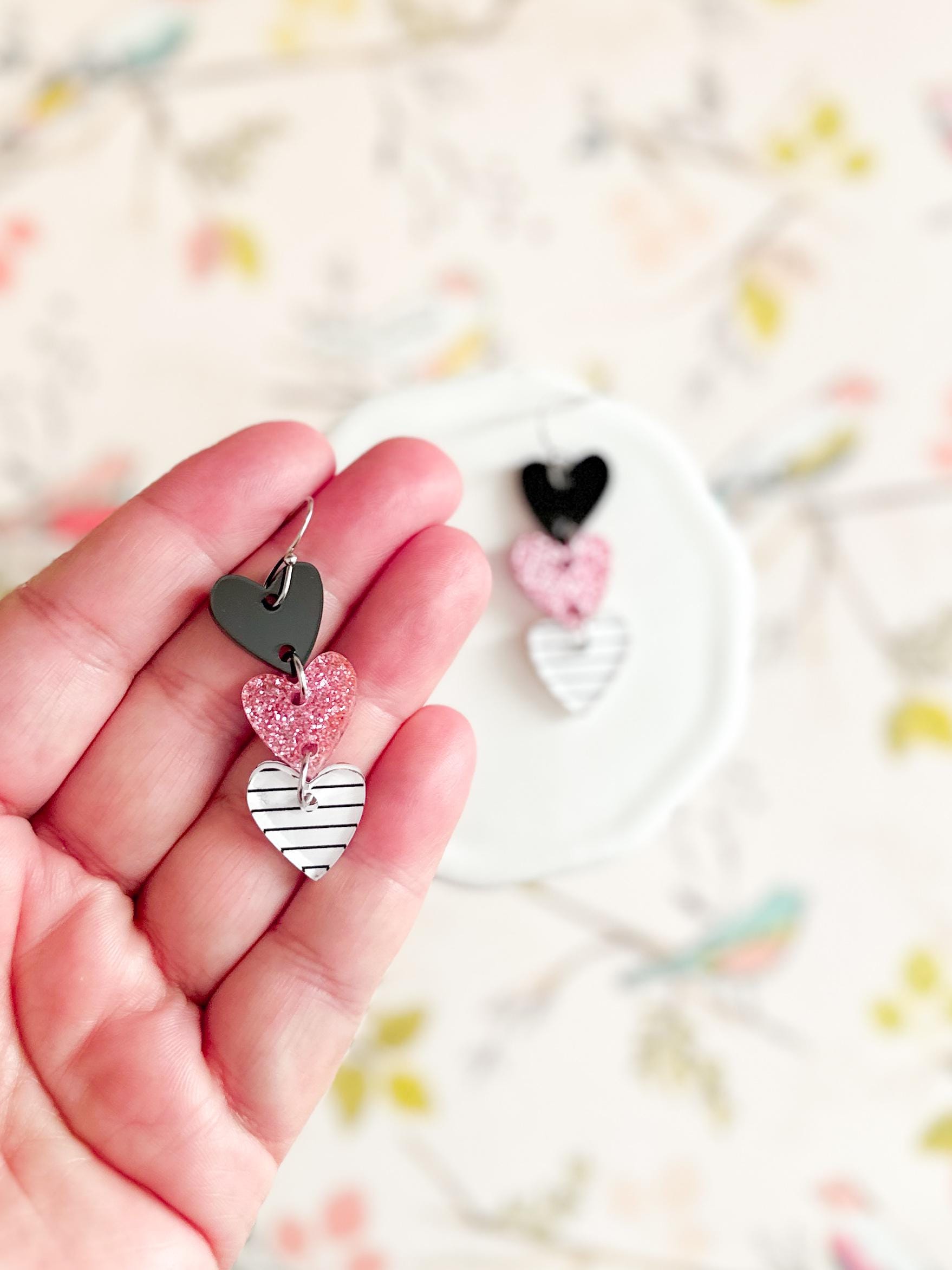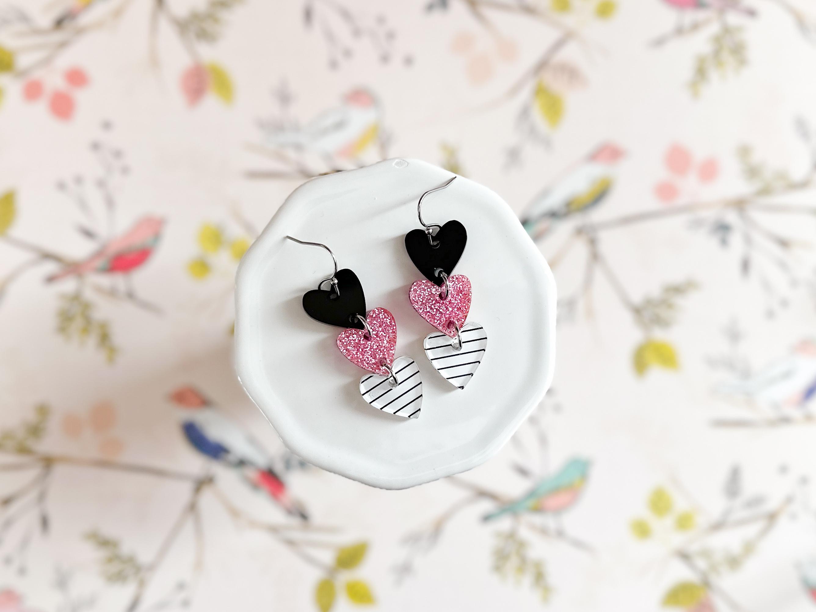 A fun, whimsical heart stack in three unique acrylic shades. Starting at the top with a bold black heart, a shiny rose pink glitter heart, and finally a white heart with thin black pin-striping. These are adorable, they're lightweight, they're such a fun choice for Valentine's day or to add a touch of sweetness to your overall look.