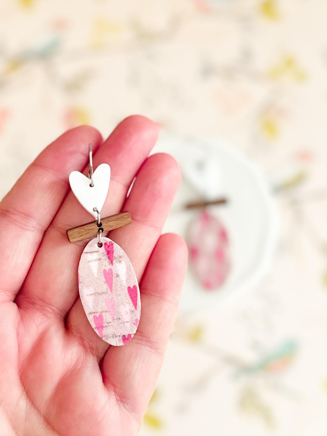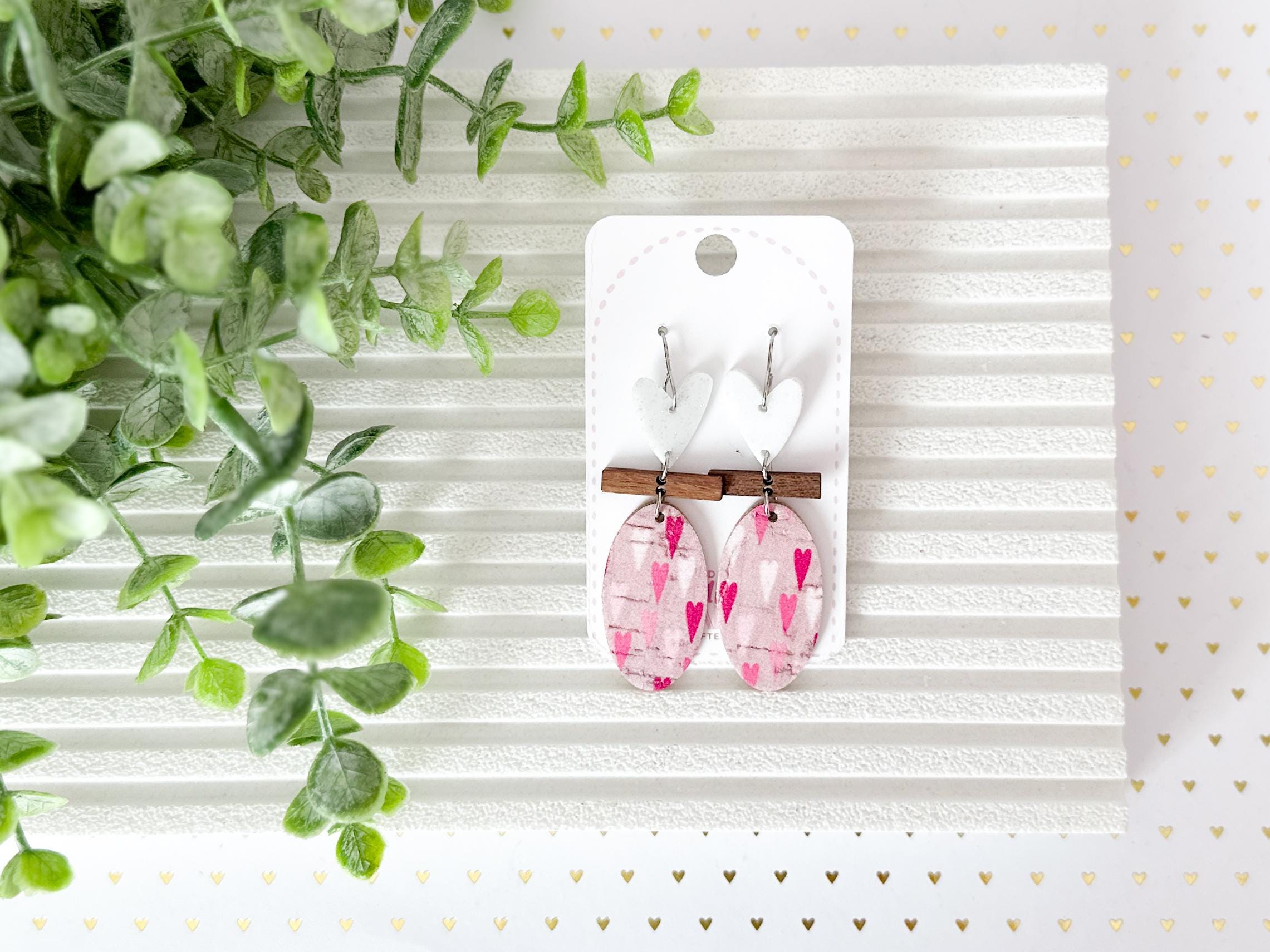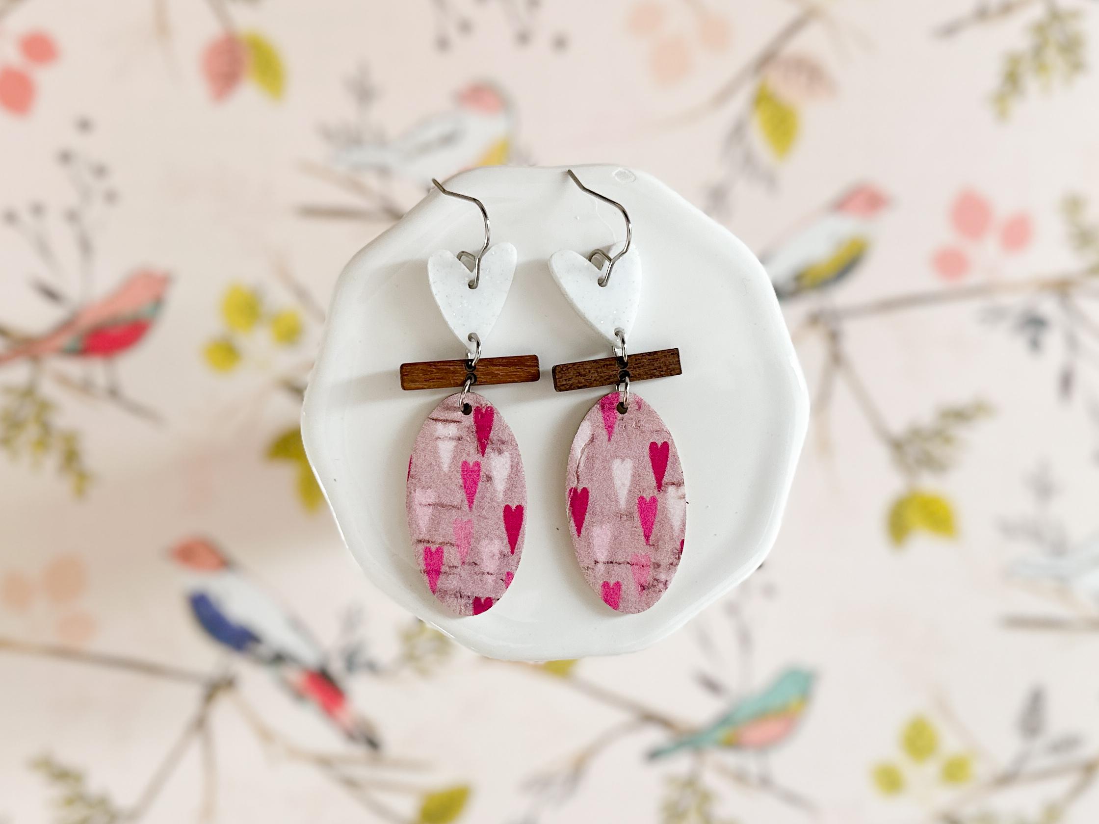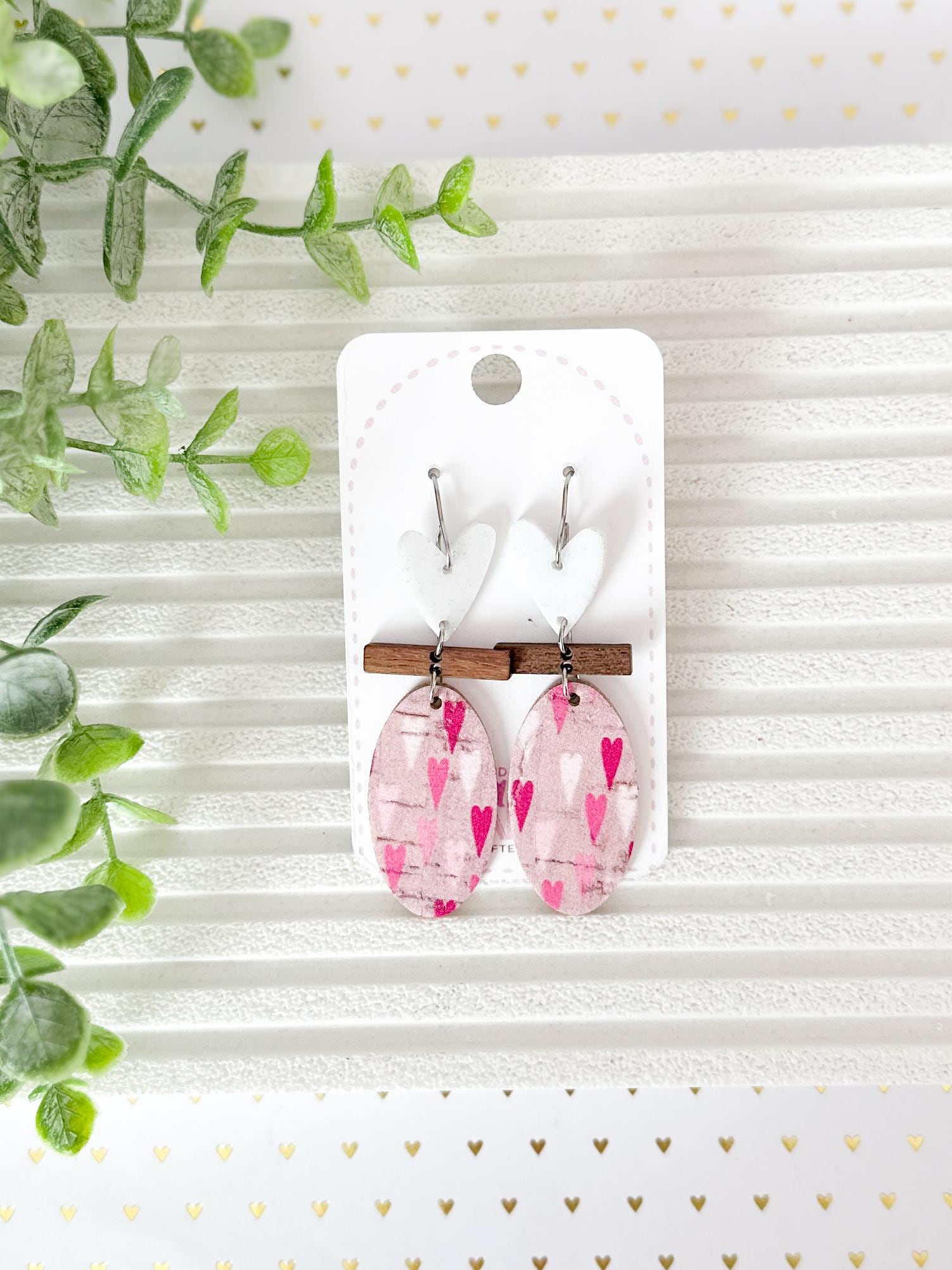 These sweet geometric earrings start with a whimsical heart in white glitter acrylic, followed by a slim walnut bar, and finally an oval of pink cork adorned with multi colored pink hearts. They're adorable, have a slim profile, and are effortlessly lightweight.