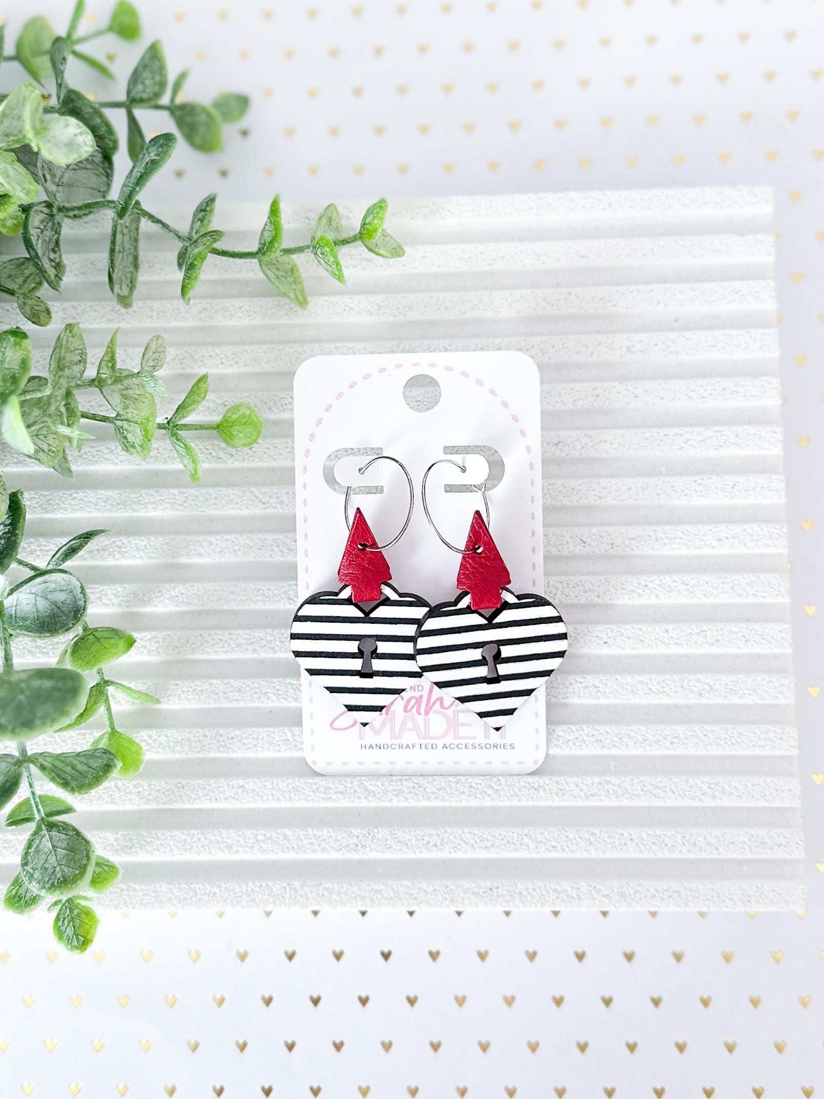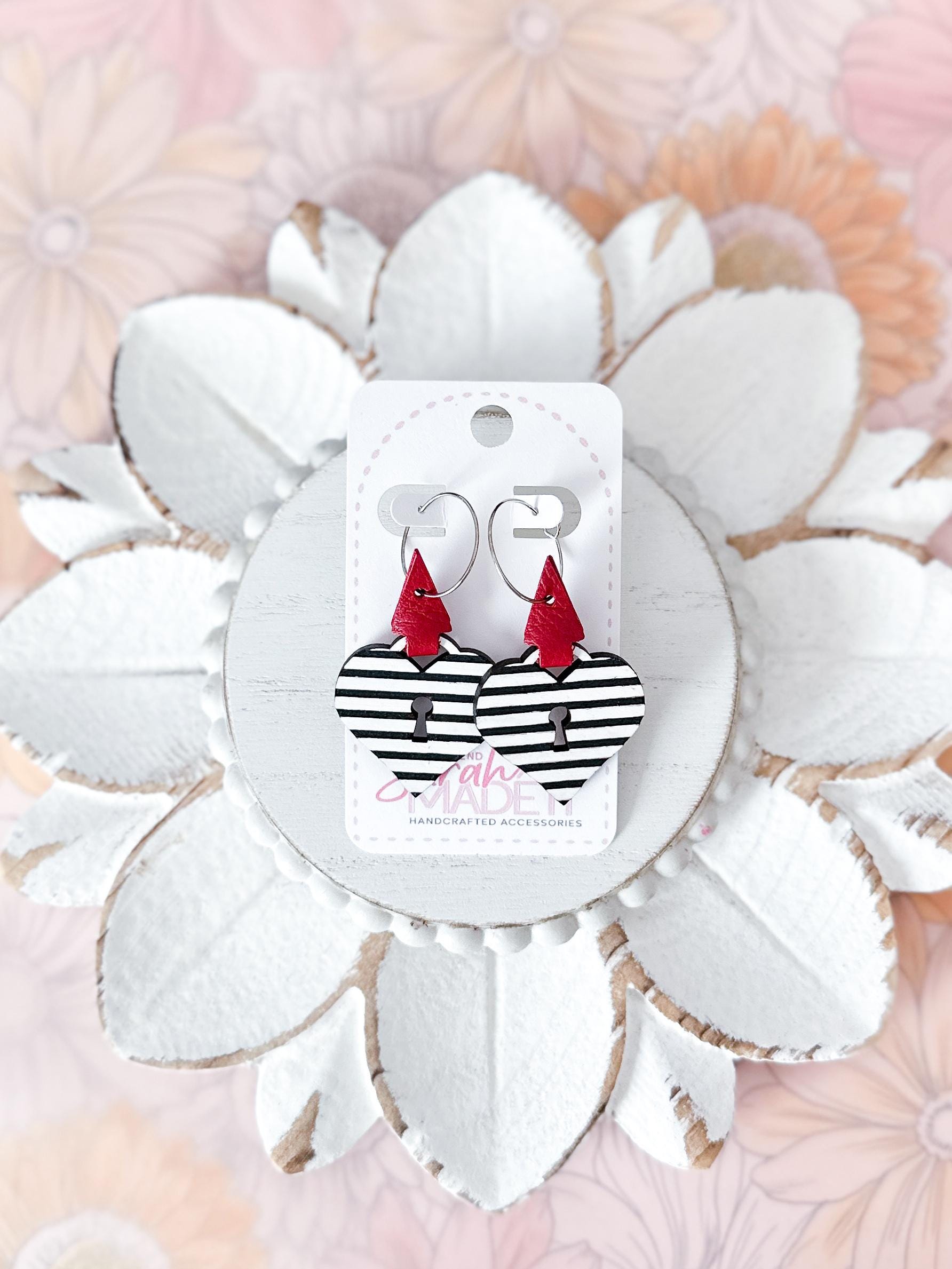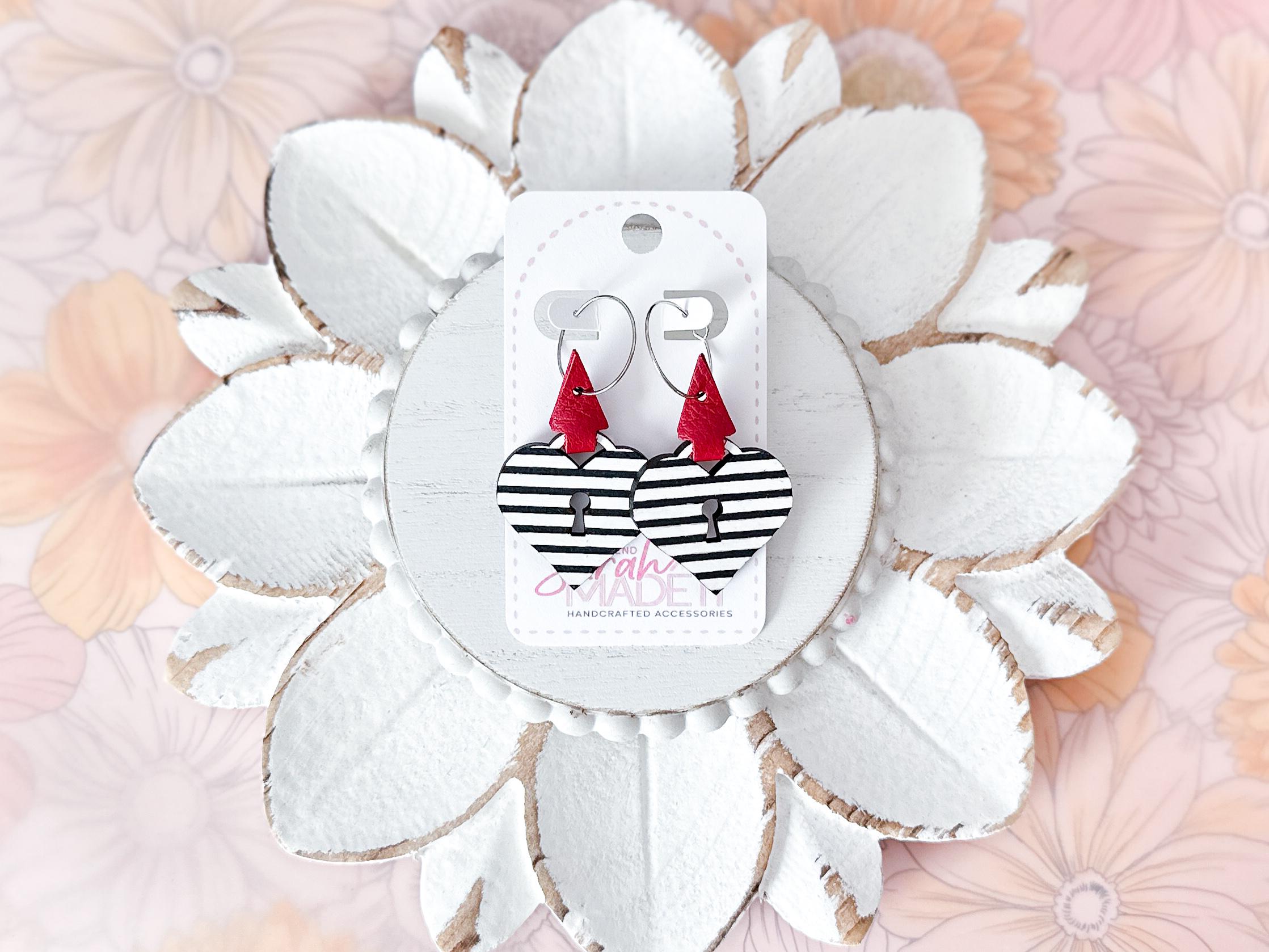 These are SO cute! Laser cut wood in a heart lock shape has been hand painted with black & white stripes. Wrapped up with a lipstick red leather wrap, you'll be sure to reach for these over and over all year.