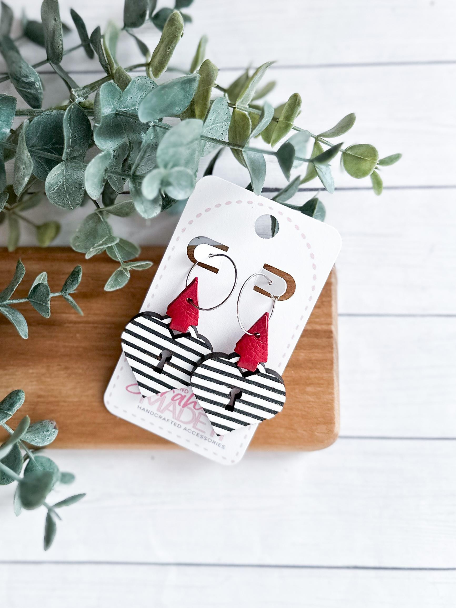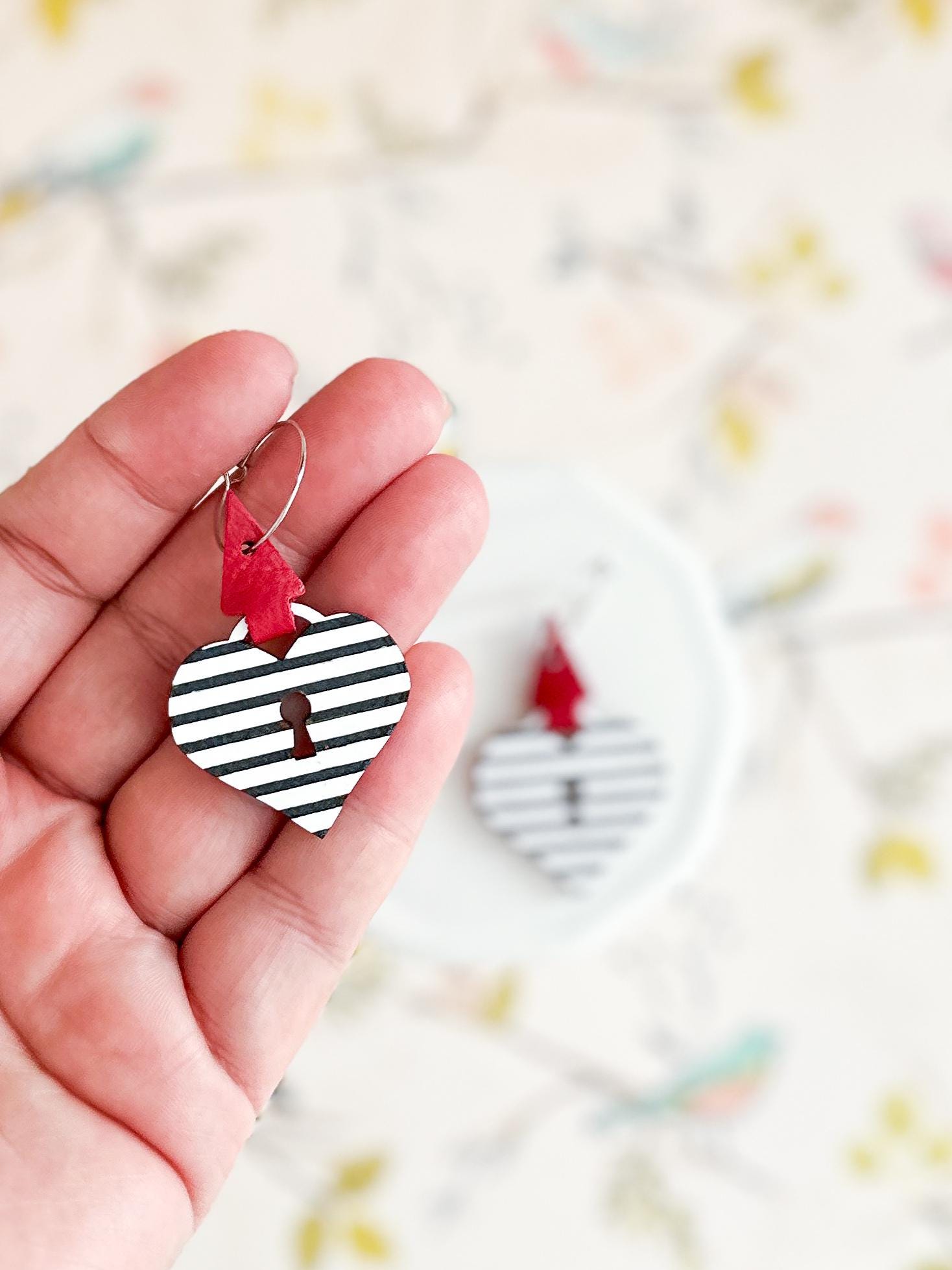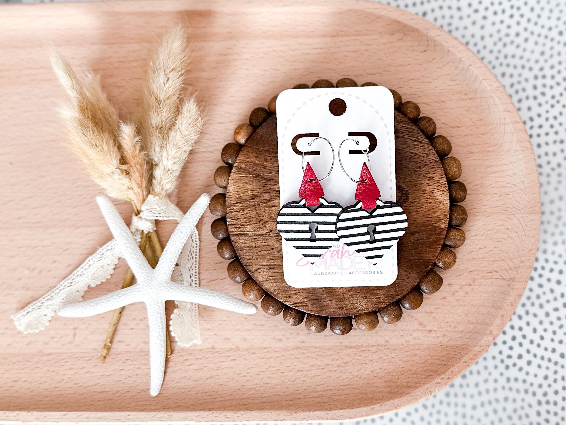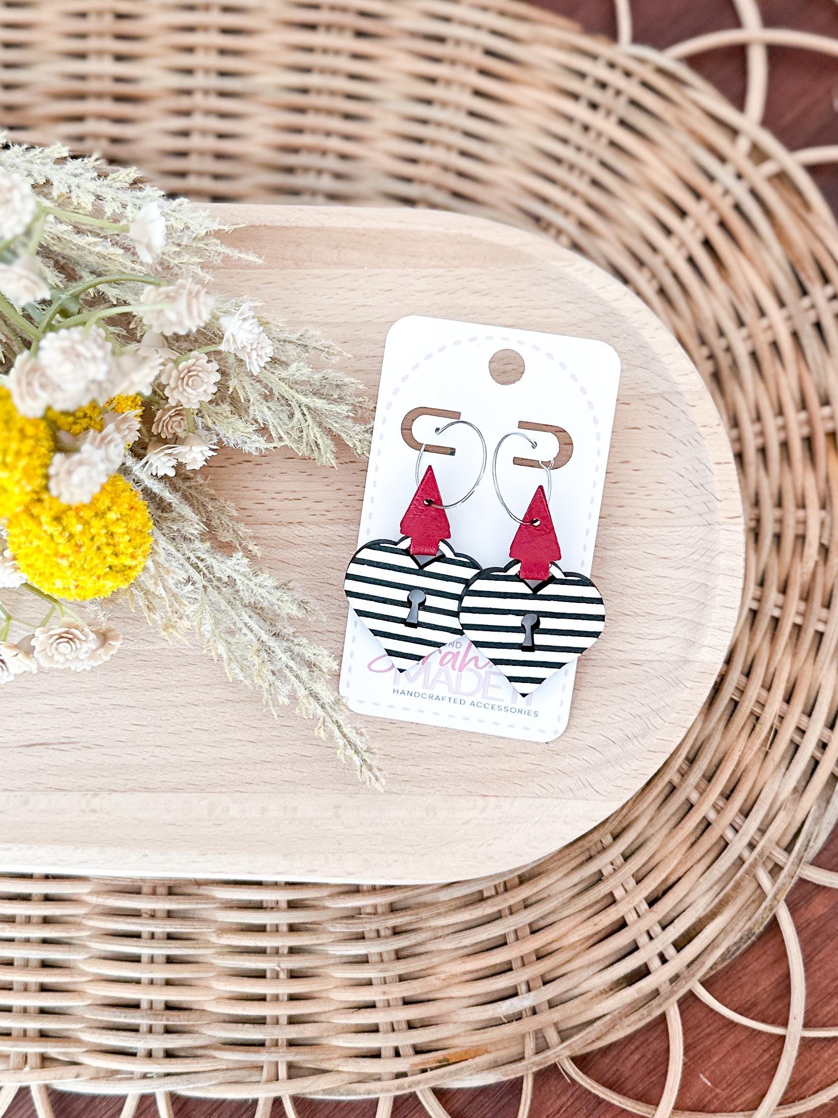These are SO cute! Laser cut wood in a heart lock shape has been hand painted with black & white stripes. Wrapped up with a lipstick red leather wrap, you'll be sure to reach for these over and over all year.