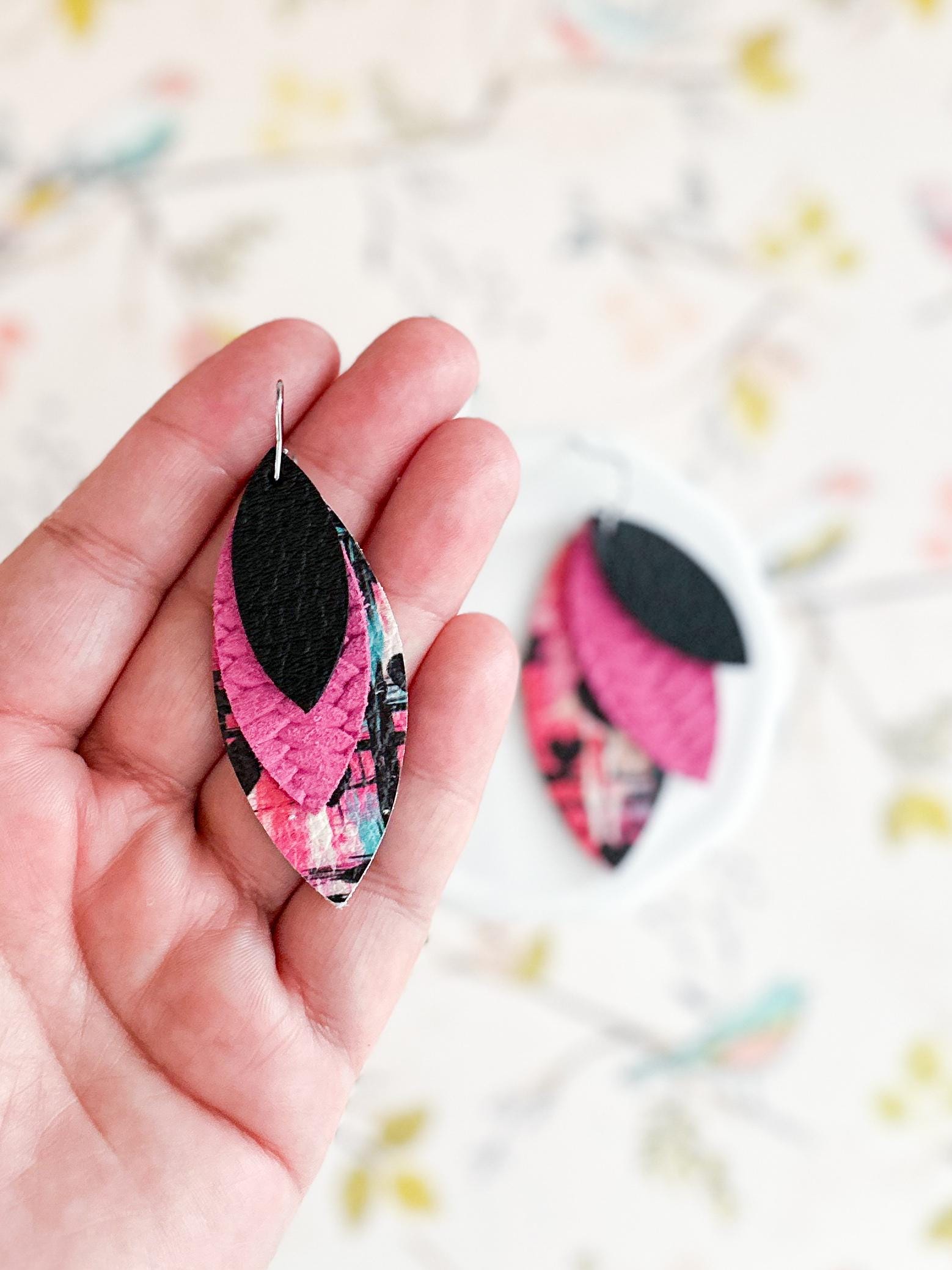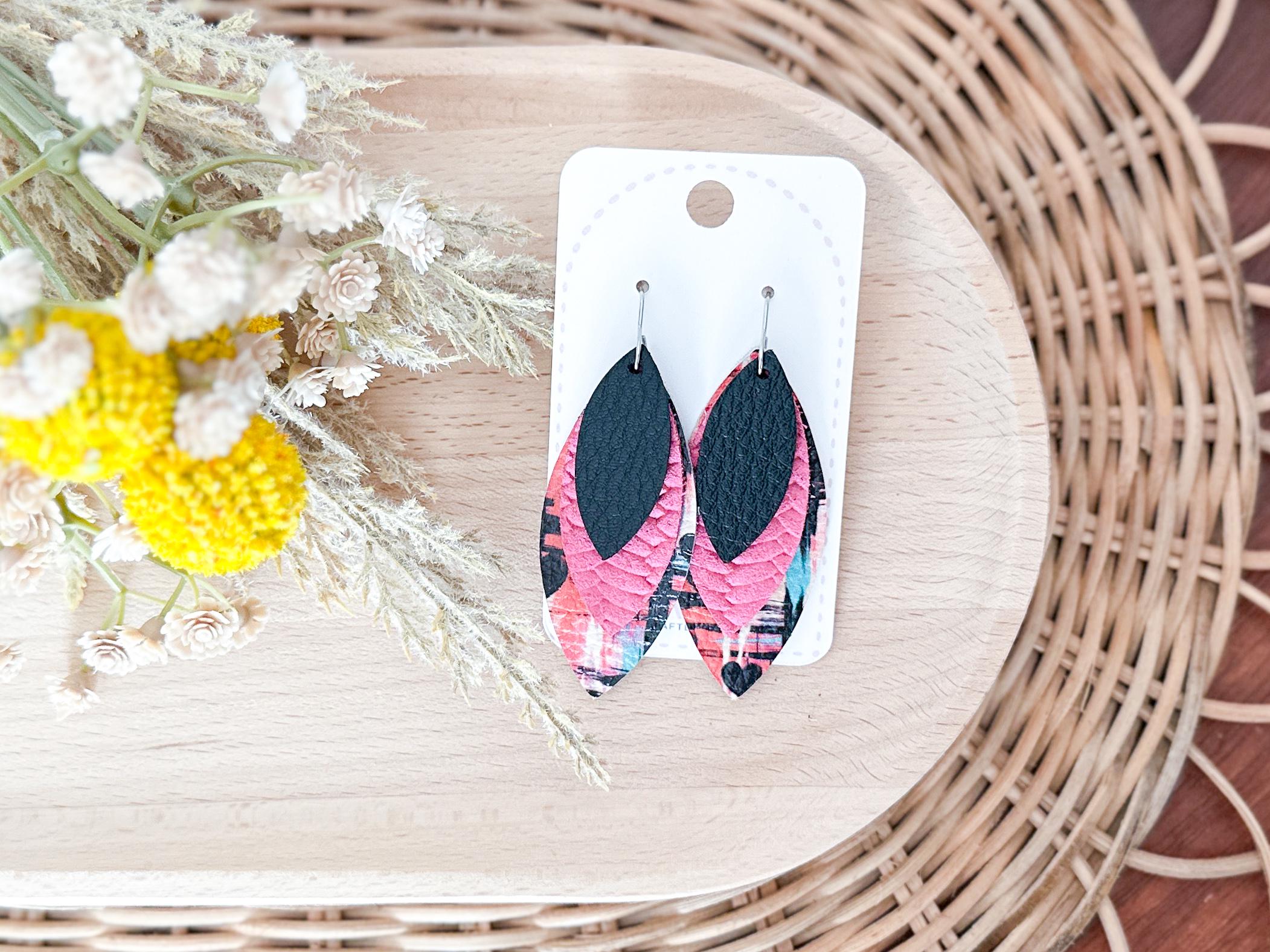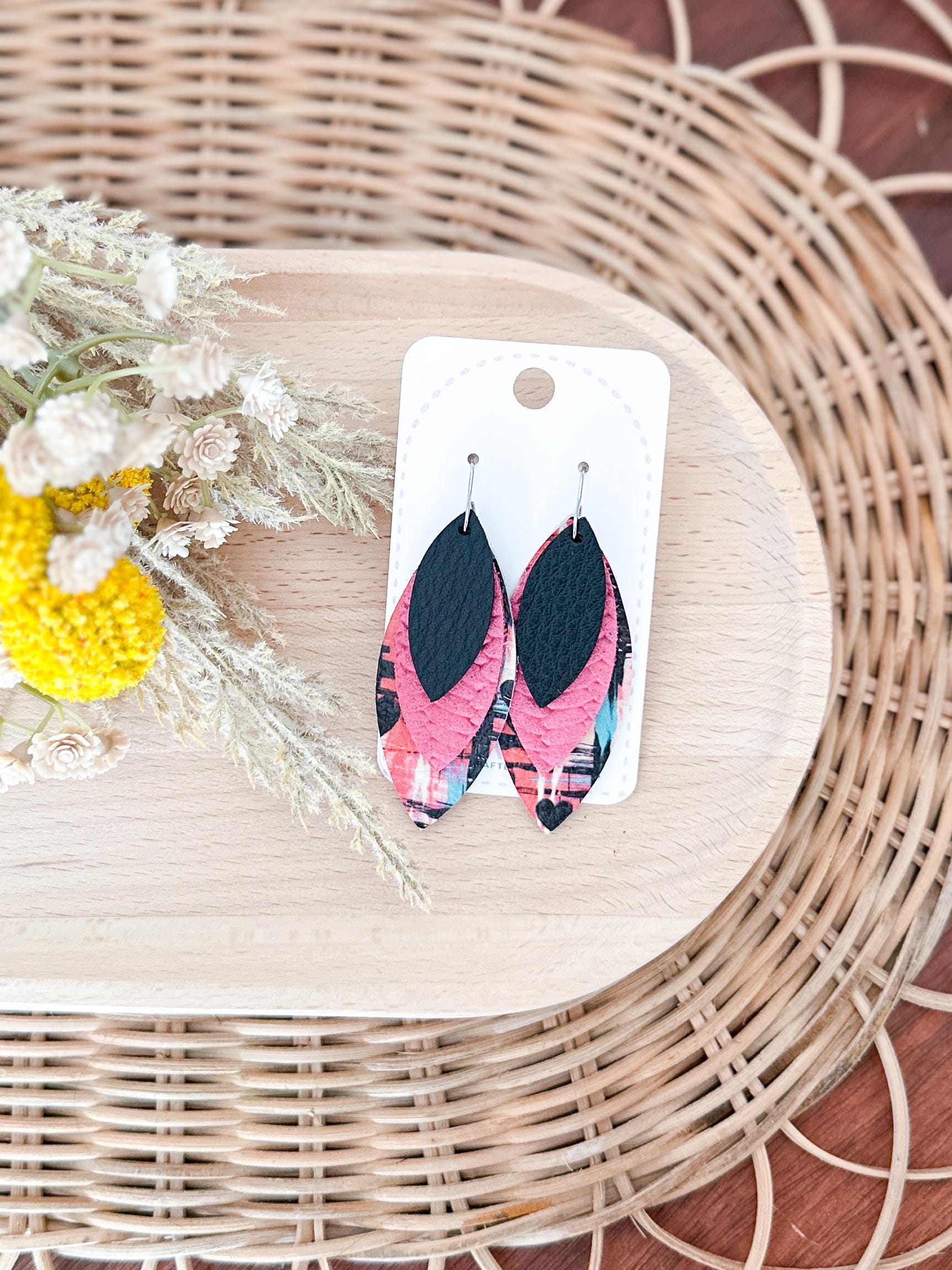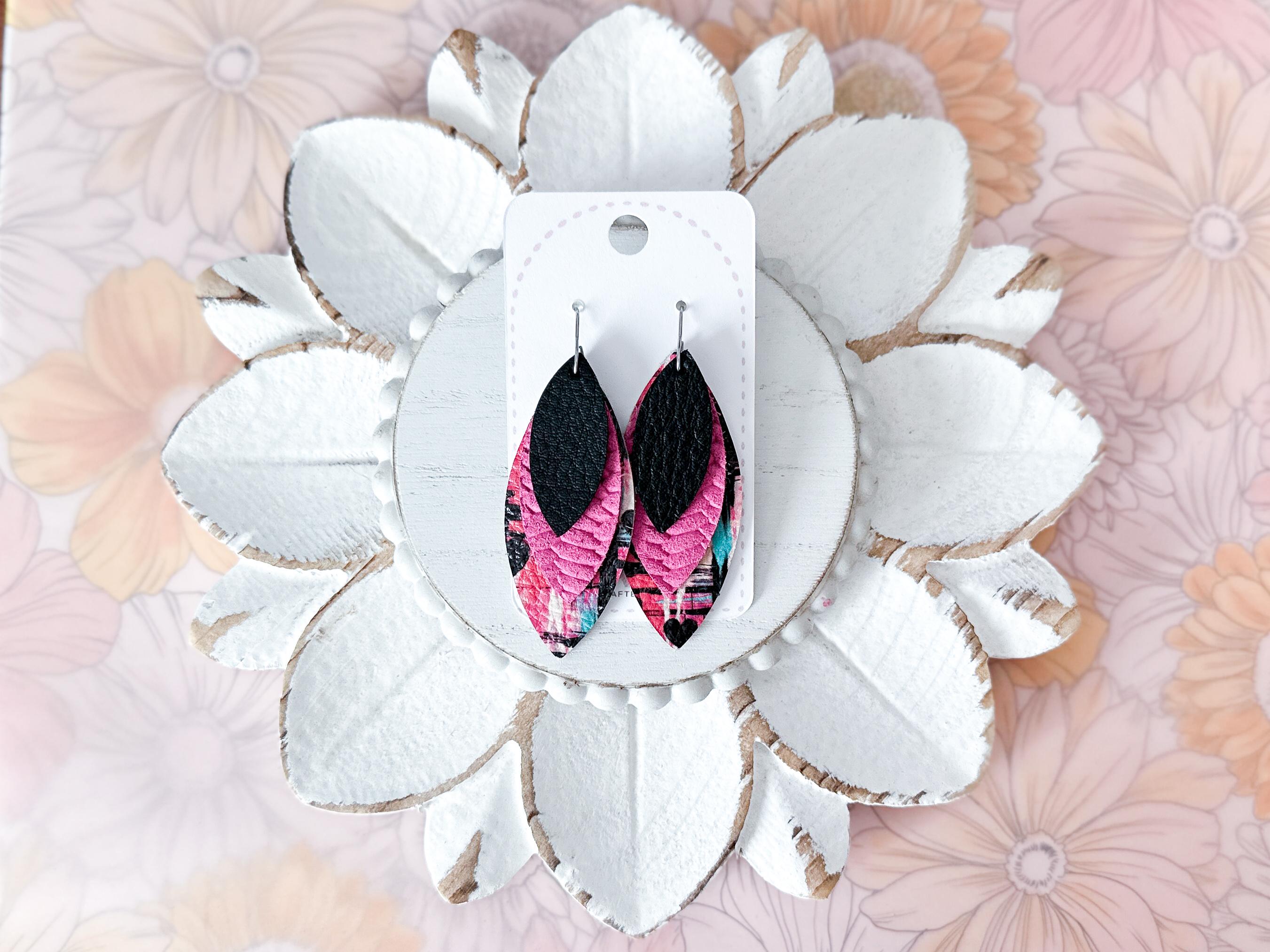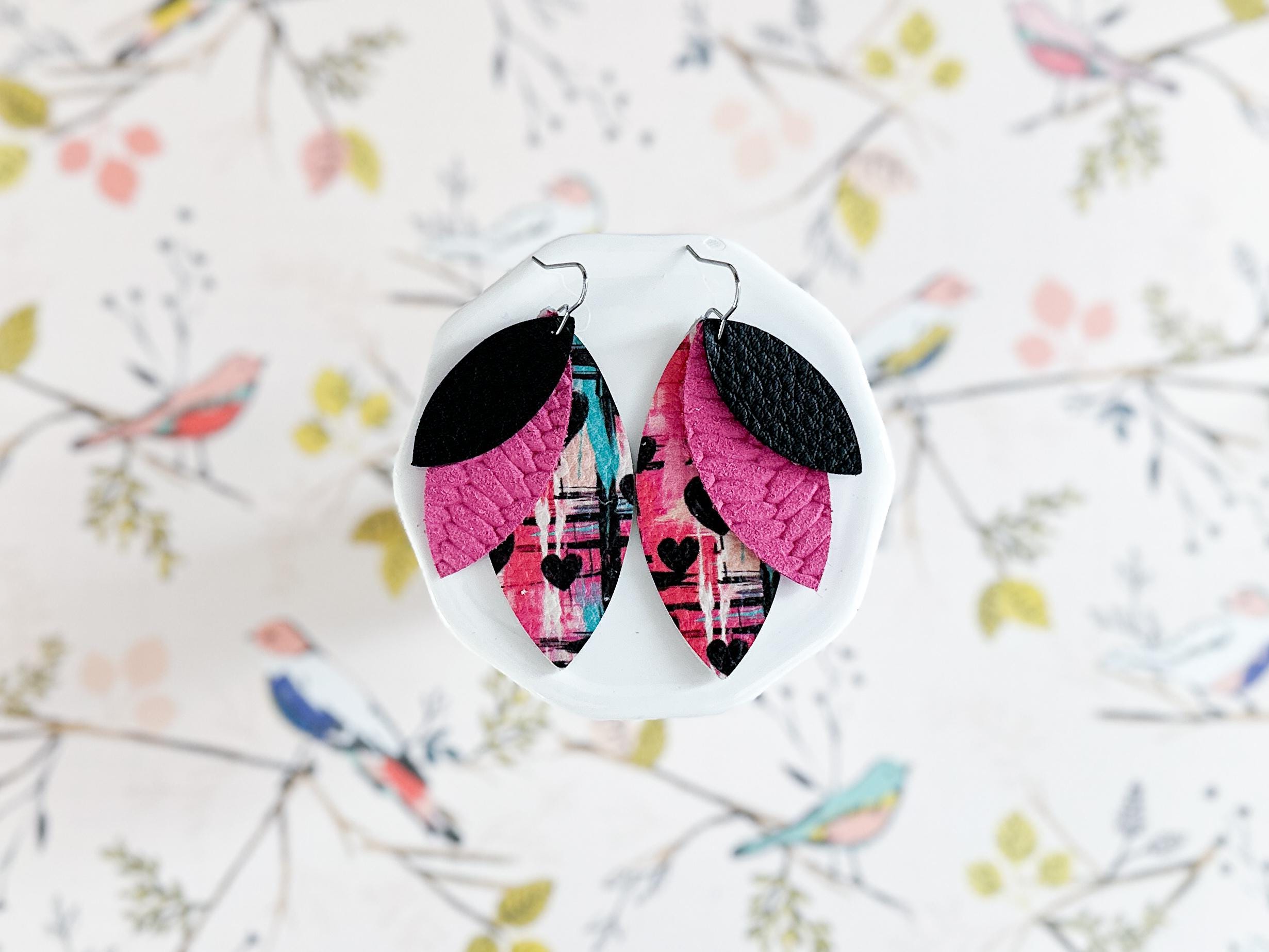 These sweet petal earrings combine bright colors, fun patterns, and bold style for an earring that's as unique as you! Black, magenta, and graffiti style Valentine print work perfectly for a fun & vibrant choice this Valentine's!