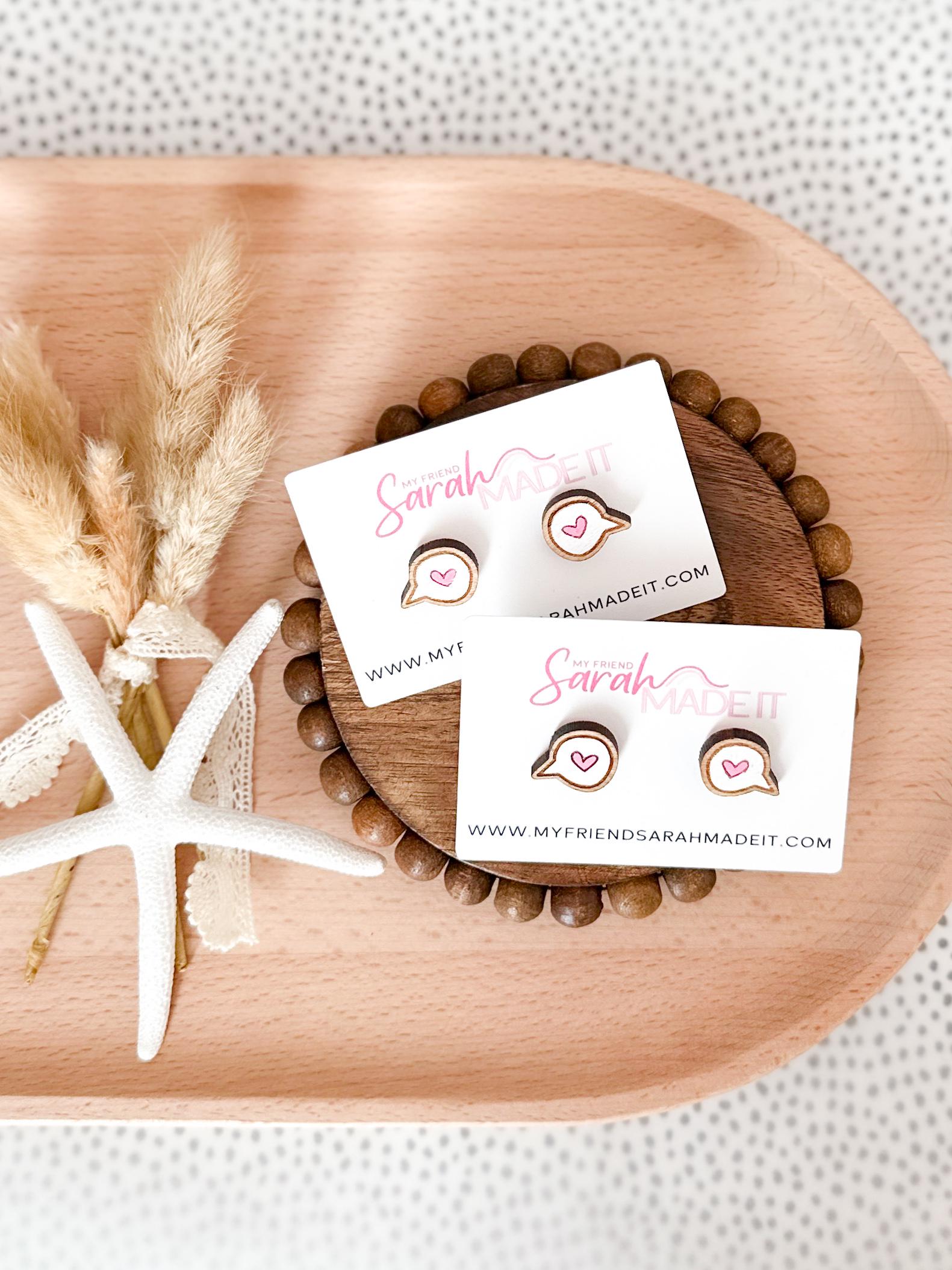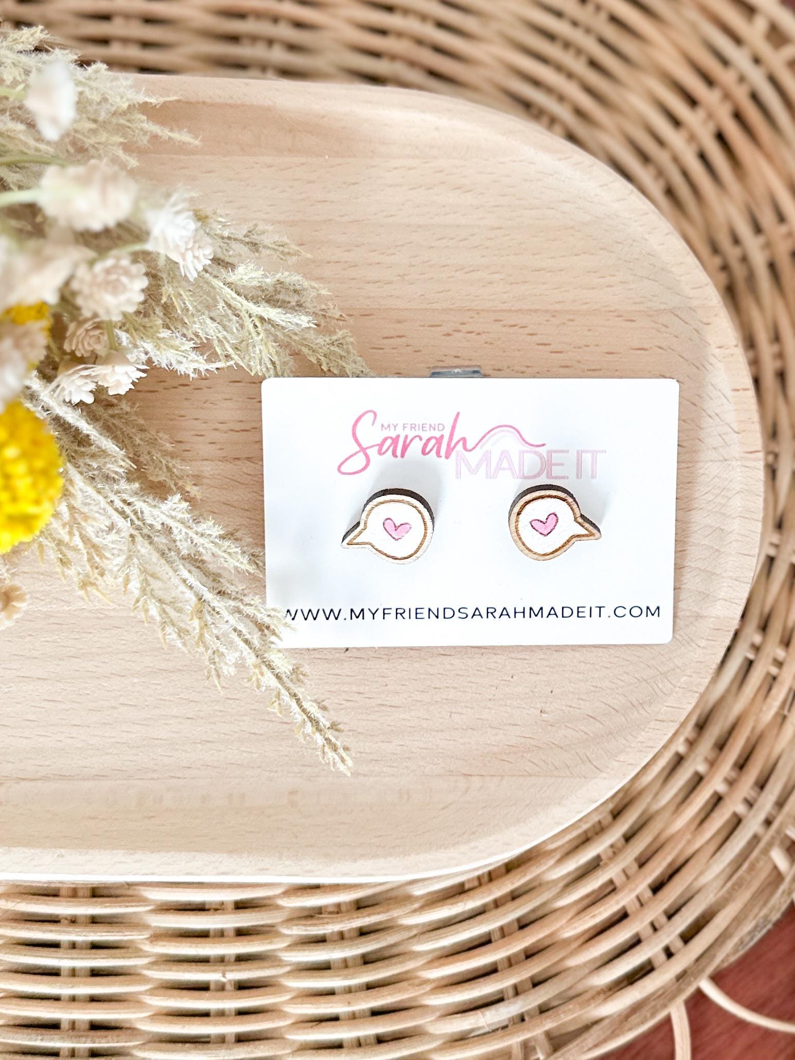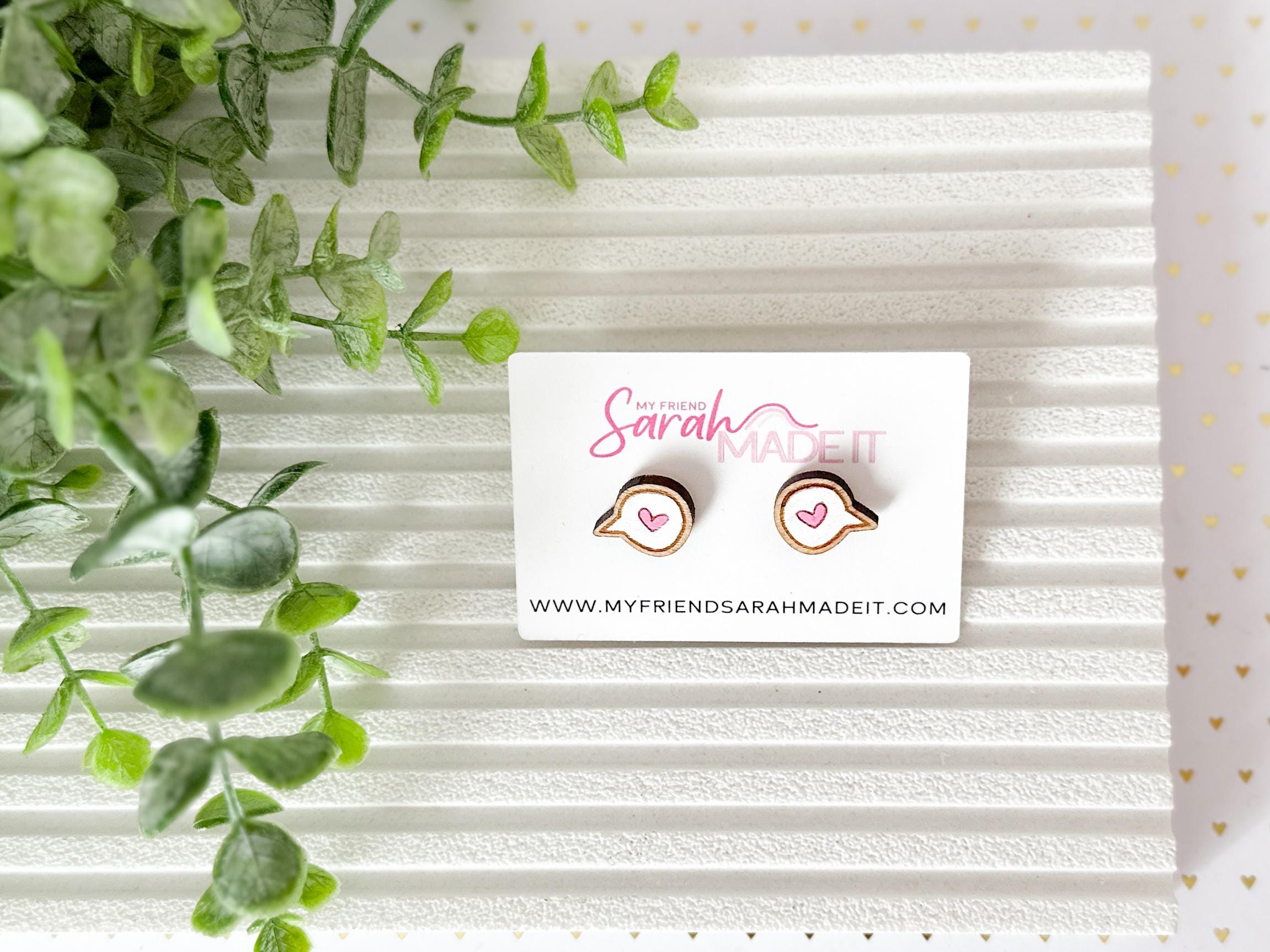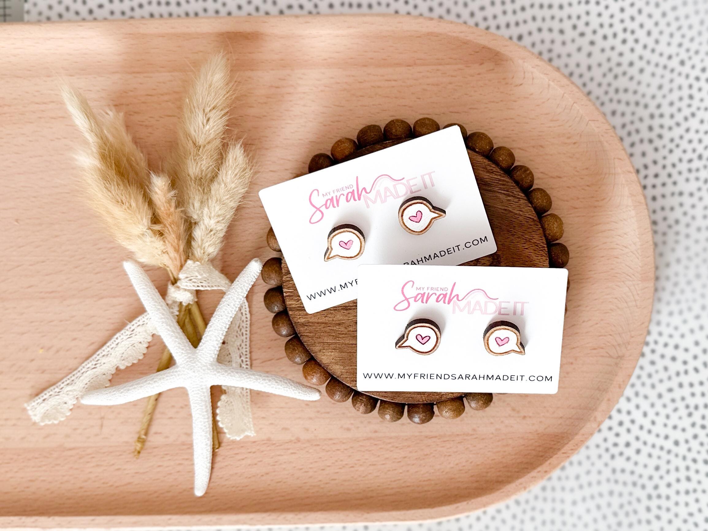 These sweet conversation bubbles are the cutest way to add a little love to your lobes! Hand painted from laser cut wood in white with an adorable heart center, these are just too cute.