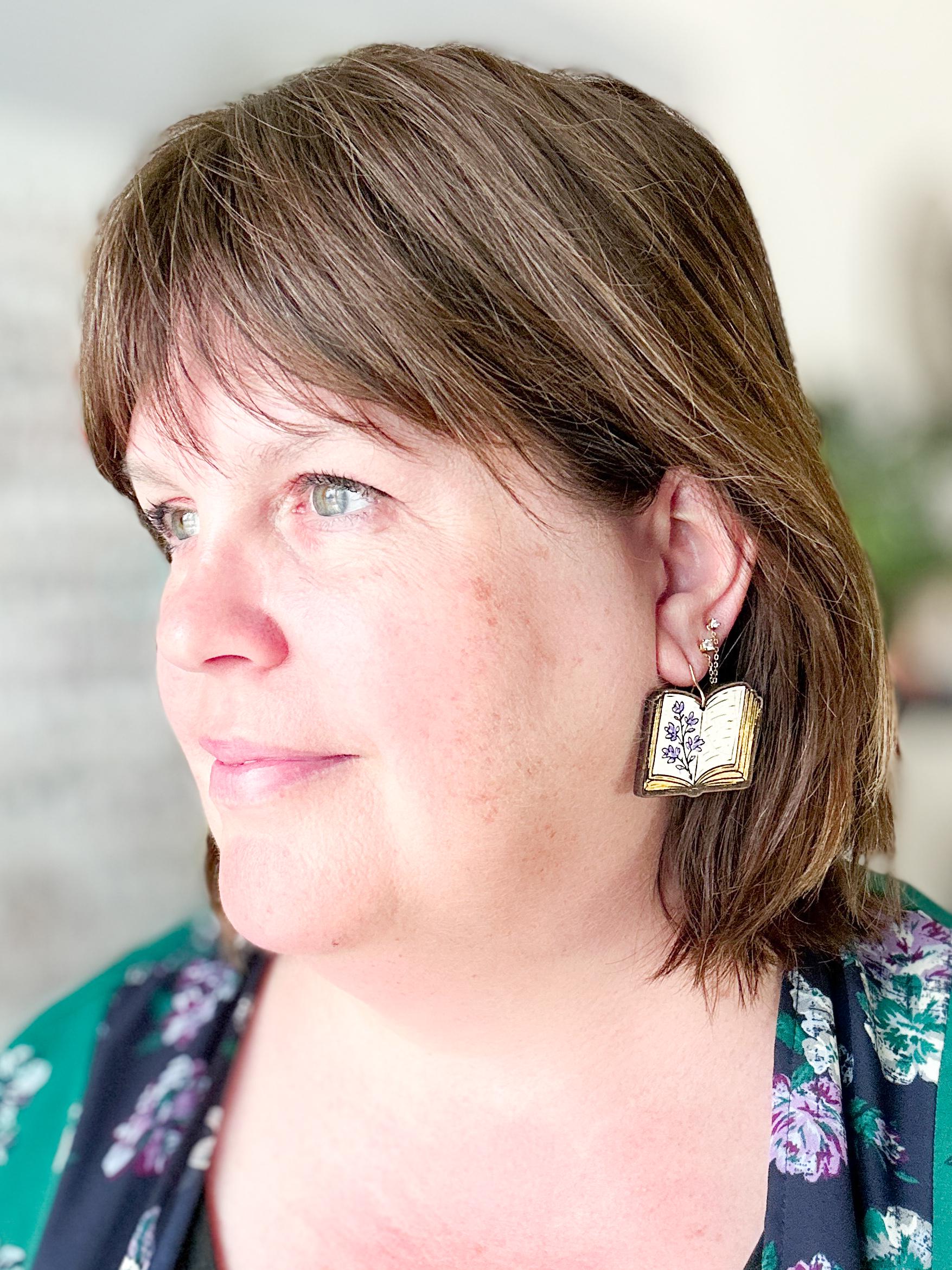 These hand-painted book earrings are a sweet little nod to book lovers everywhere. Inspired by pressed flowers tucked between pages, each lightweight wooden open book features soft purple florals and delicate gilded page edges. They’re a charming gift for readers, librarians, teachers, or anyone who finds magic inside the pages of a good book.
