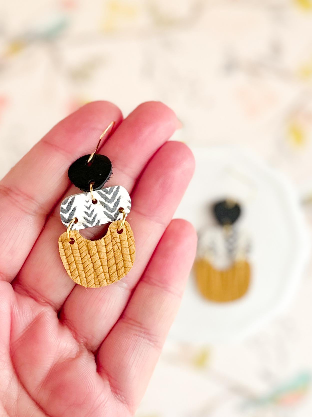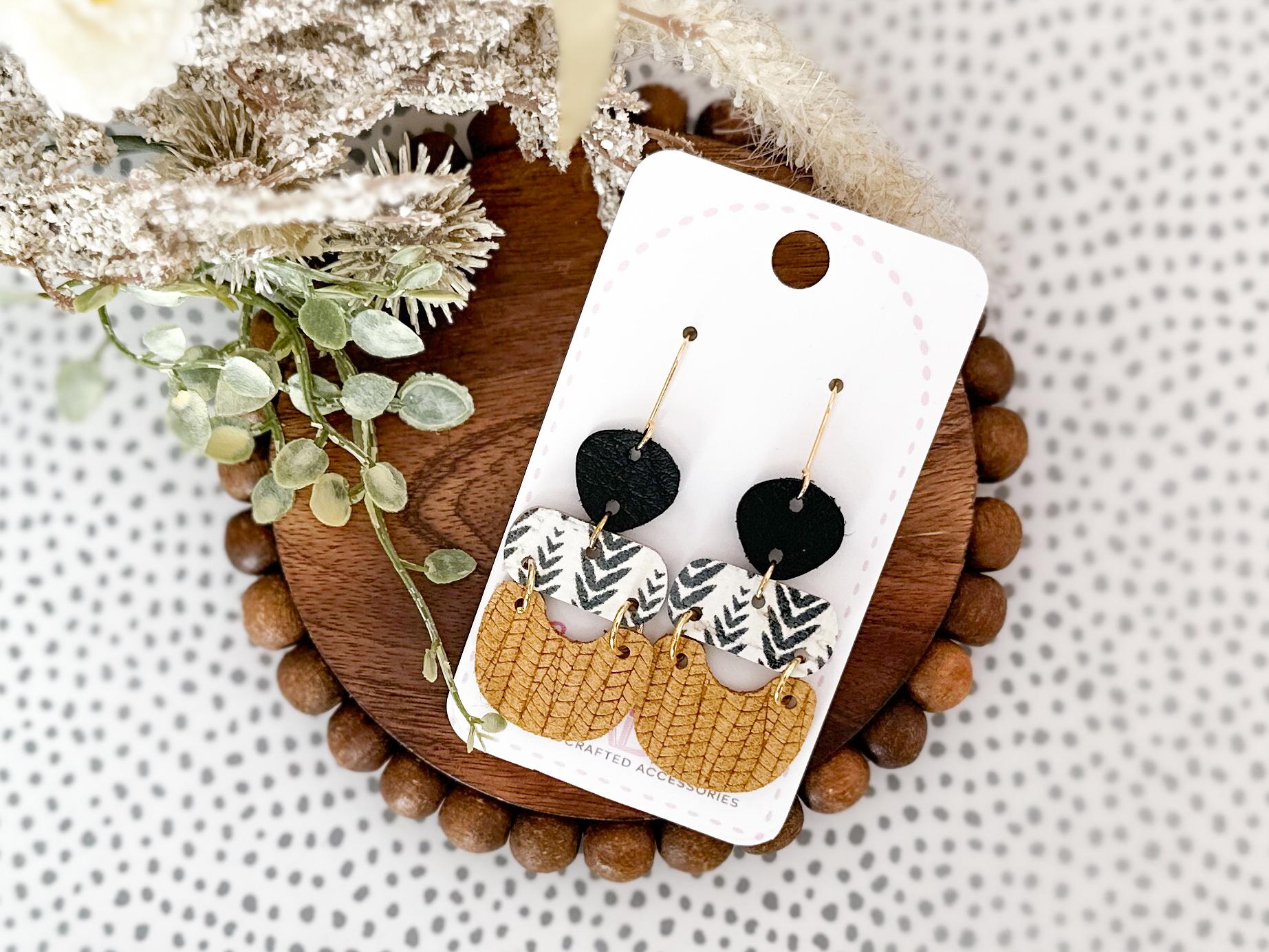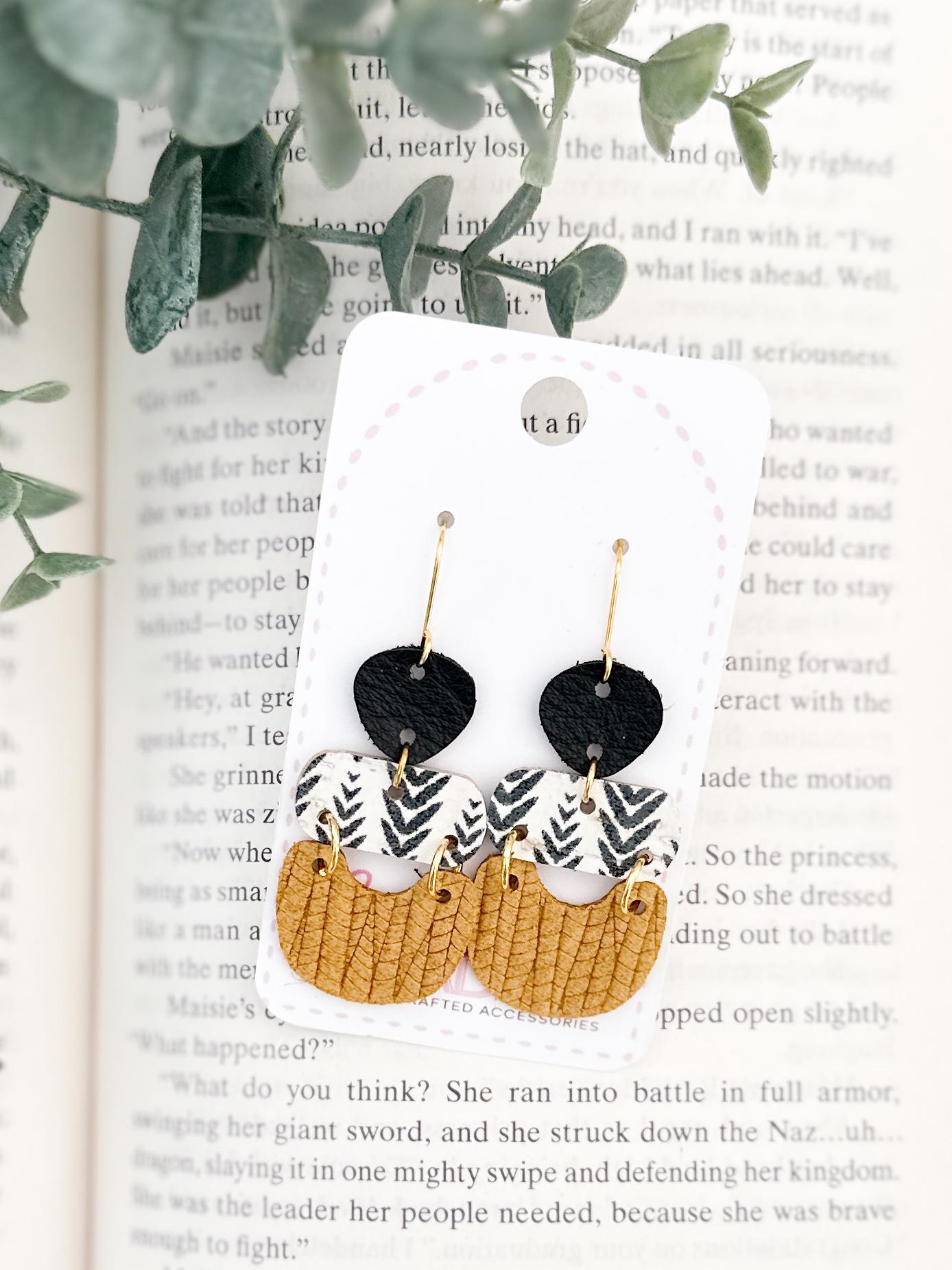 I have to say, I just really love the shape of these! The guitar pick tops, the rounded bar, the sweet little chubby U, it all plays together to create a fun & unique shape but the leather choices keep it neutral enough to wear year round. These are very lightweight and easy to style!