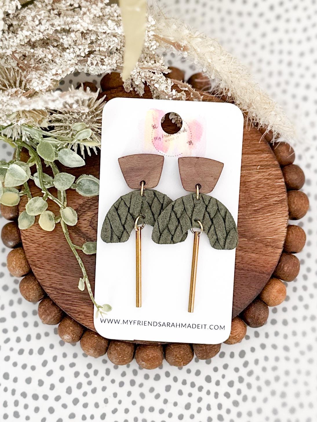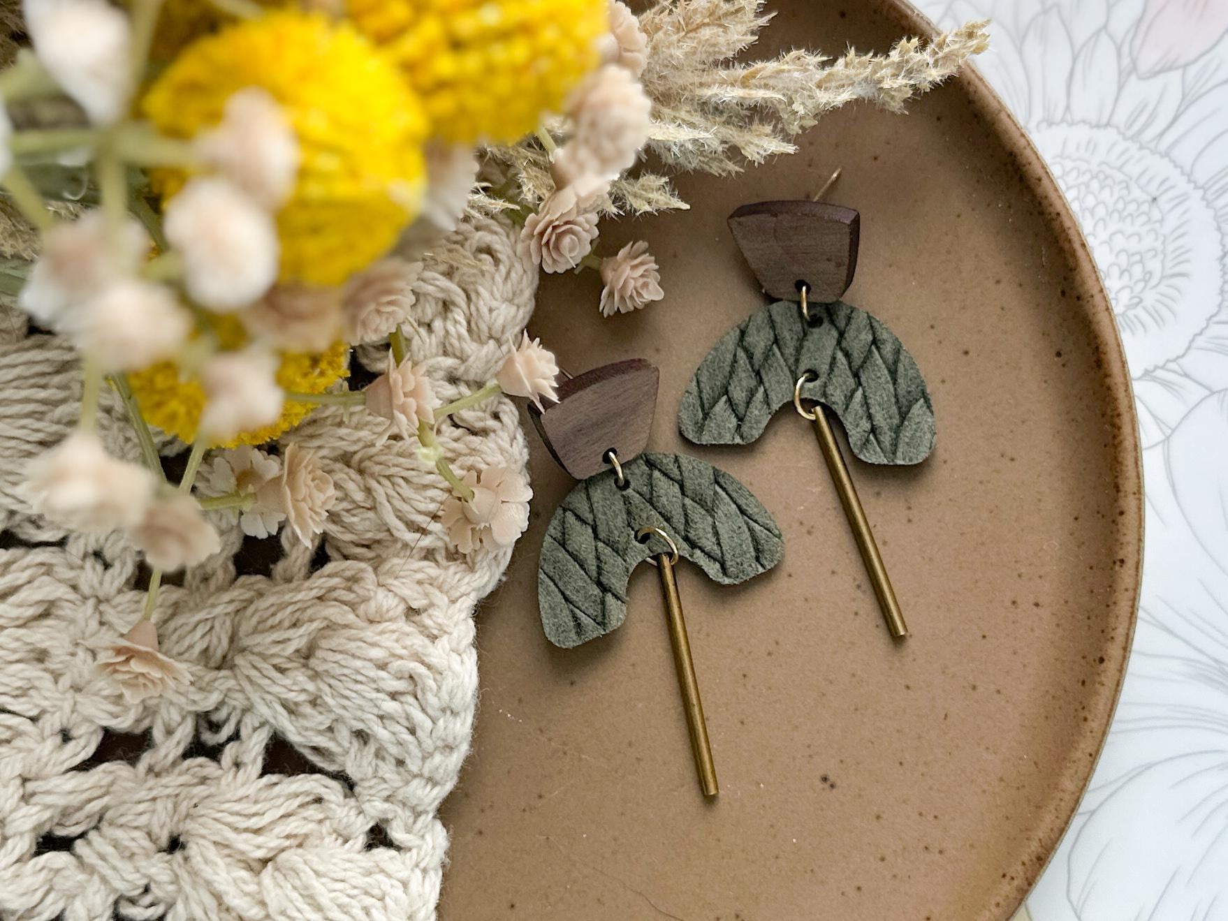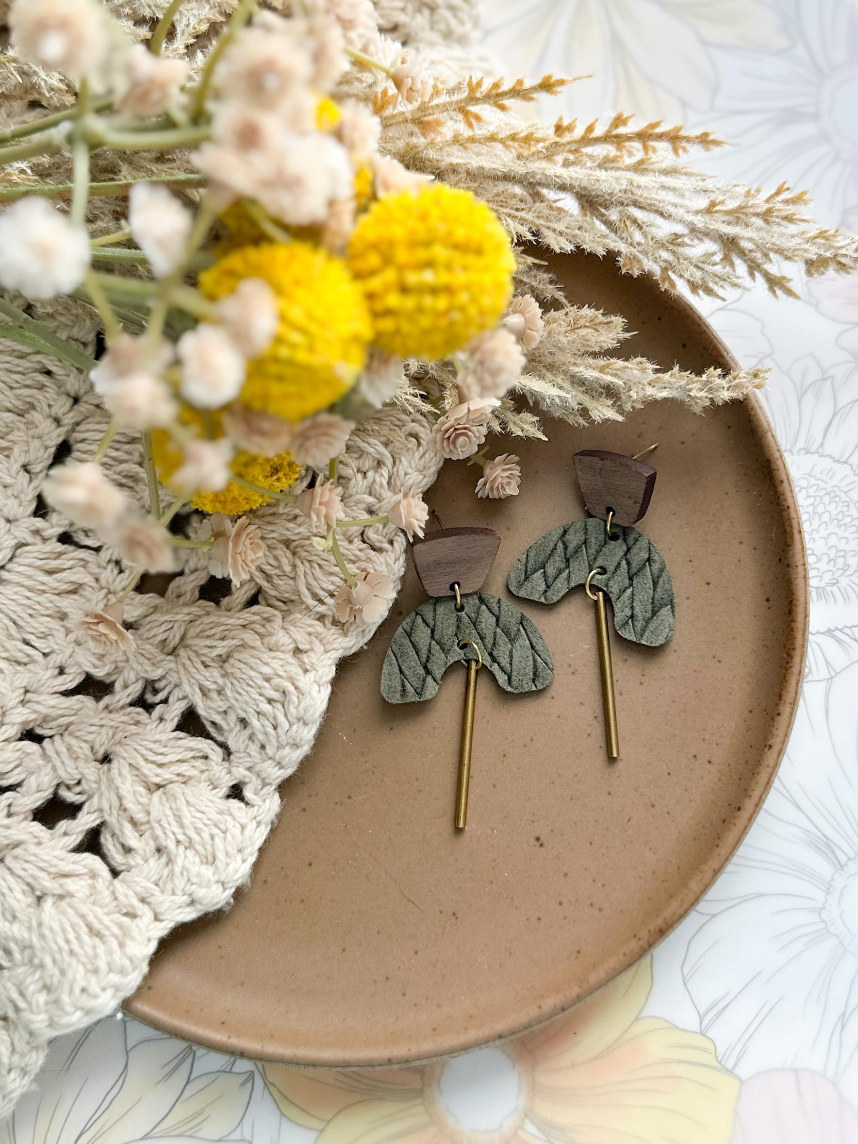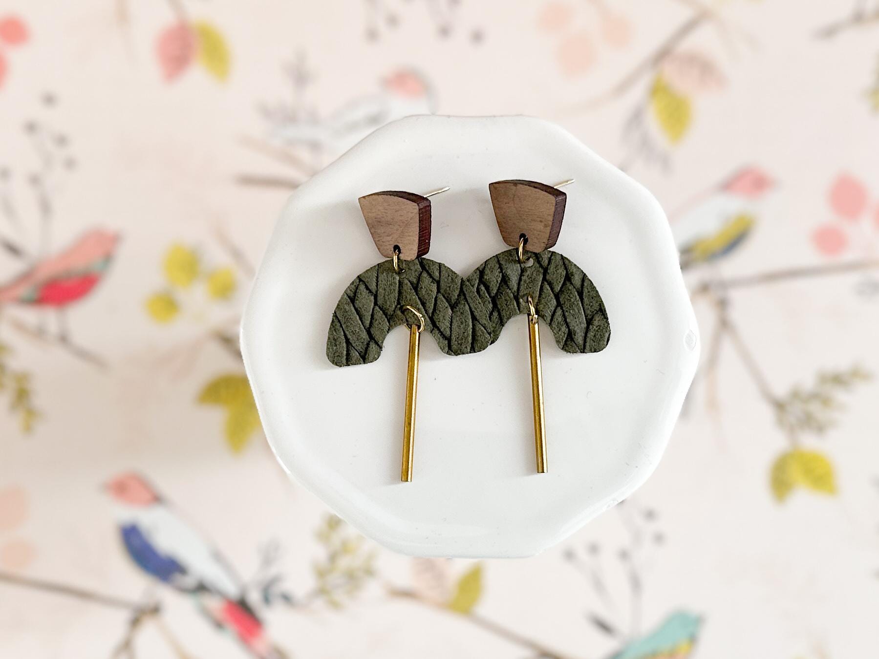 These geometric dangle earrings are made with a mix of wood, textured leather, and brass for an easy, everyday statement. Lightweight and neutral, they pair effortlessly with casual outfits or dressed-up looks. A thoughtful handmade option for gifting or treating yourself.