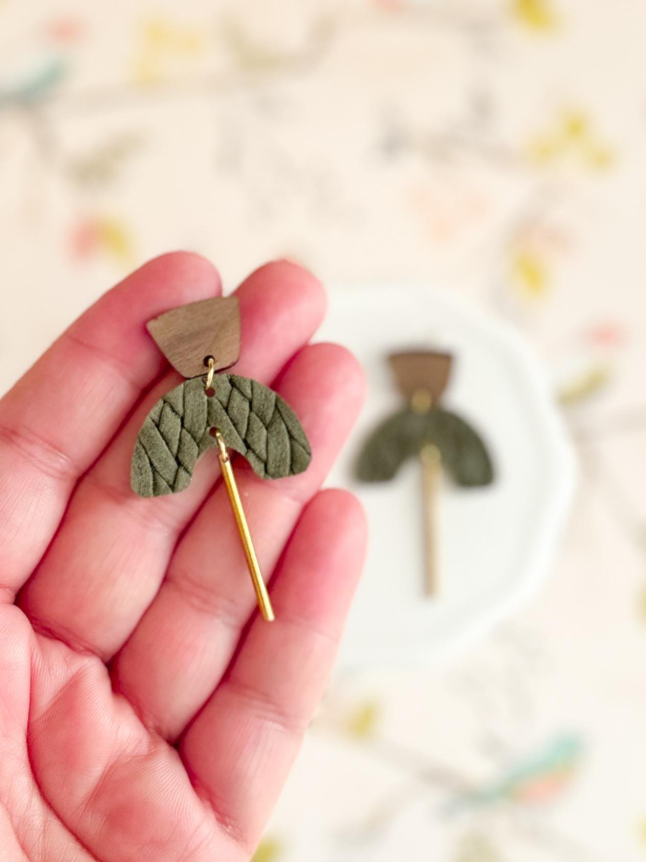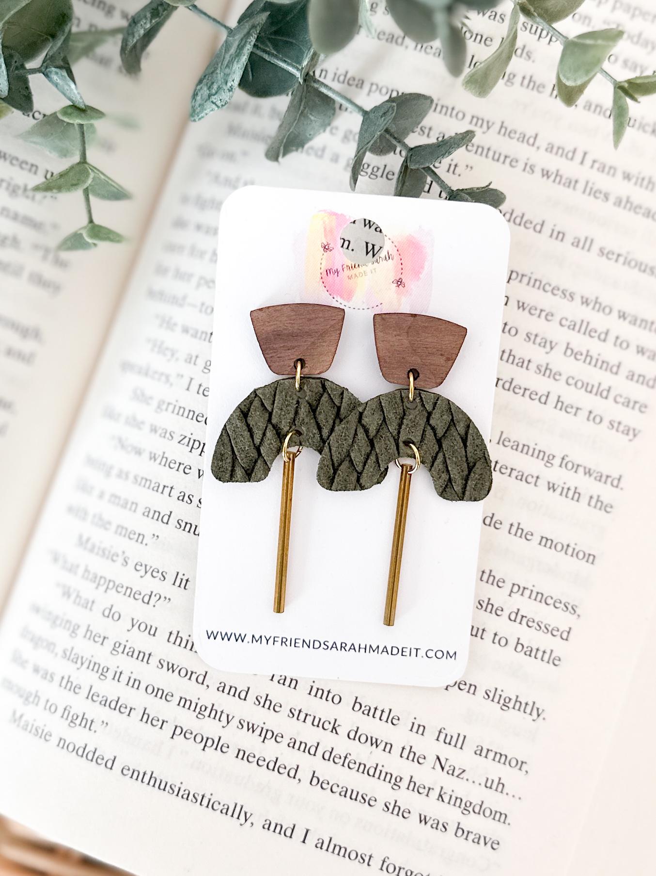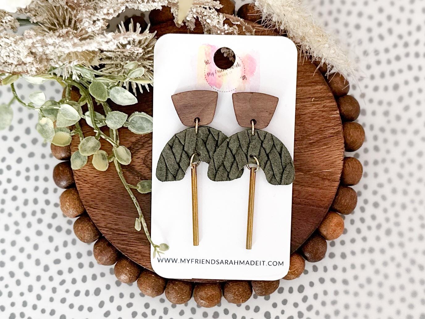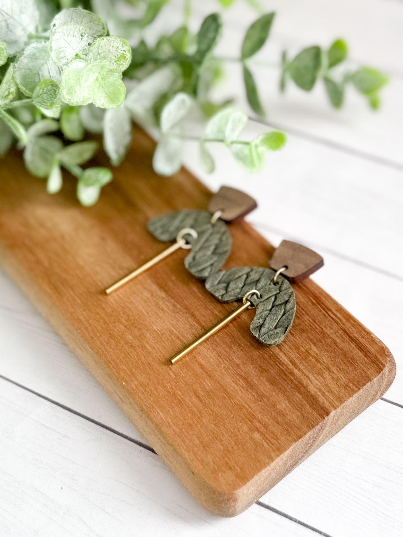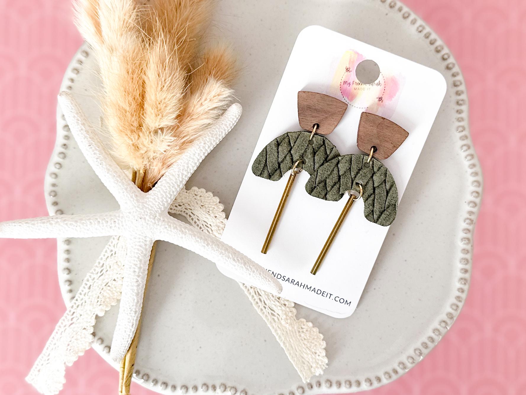 These geometric dangle earrings are made with a mix of wood, textured leather, and brass for an easy, everyday statement. Lightweight and neutral, they pair effortlessly with casual outfits or dressed-up looks. A thoughtful handmade option for gifting or treating yourself.