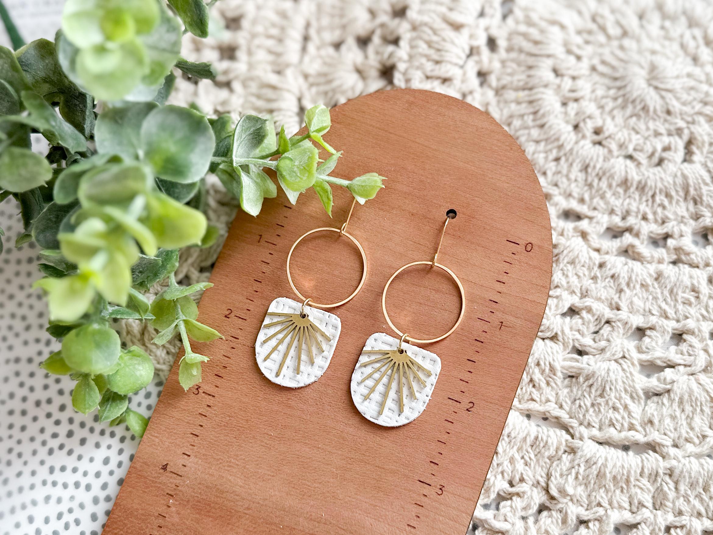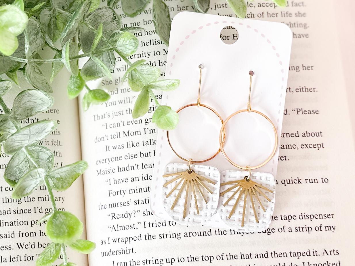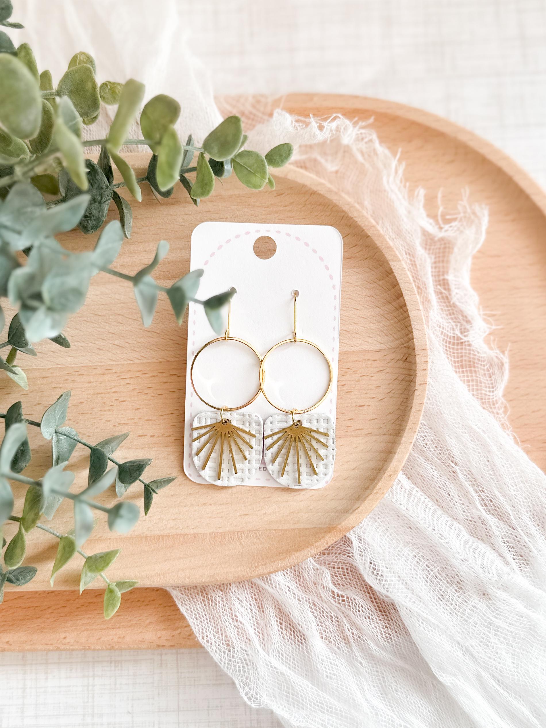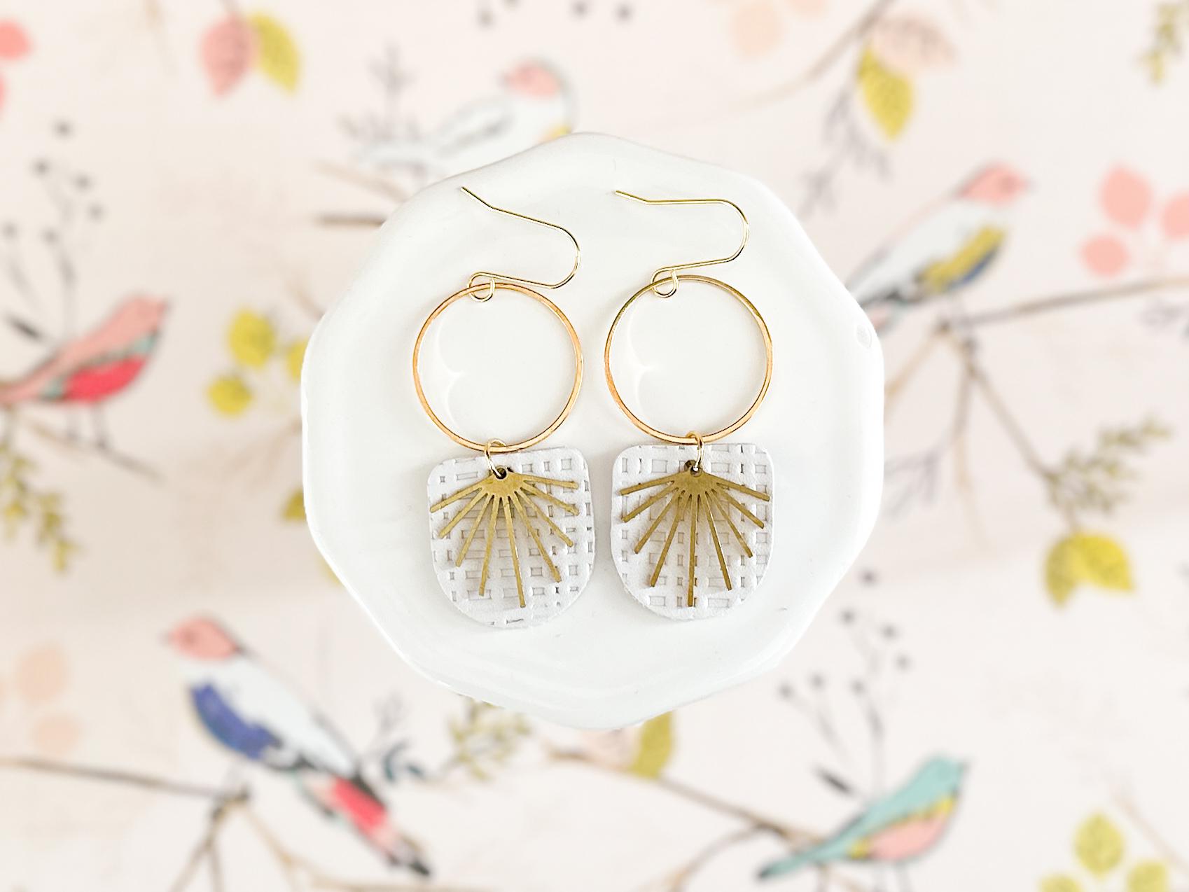 These chandelier-style earrings feature white textured leather layered beneath stainless steel hoops with a delicate brass burst accent. Lightweight with soft movement, they add a romantic, airy touch while remaining neutral enough for everyday wear. A beautiful handmade choice for gifting or for elevating your own collection.