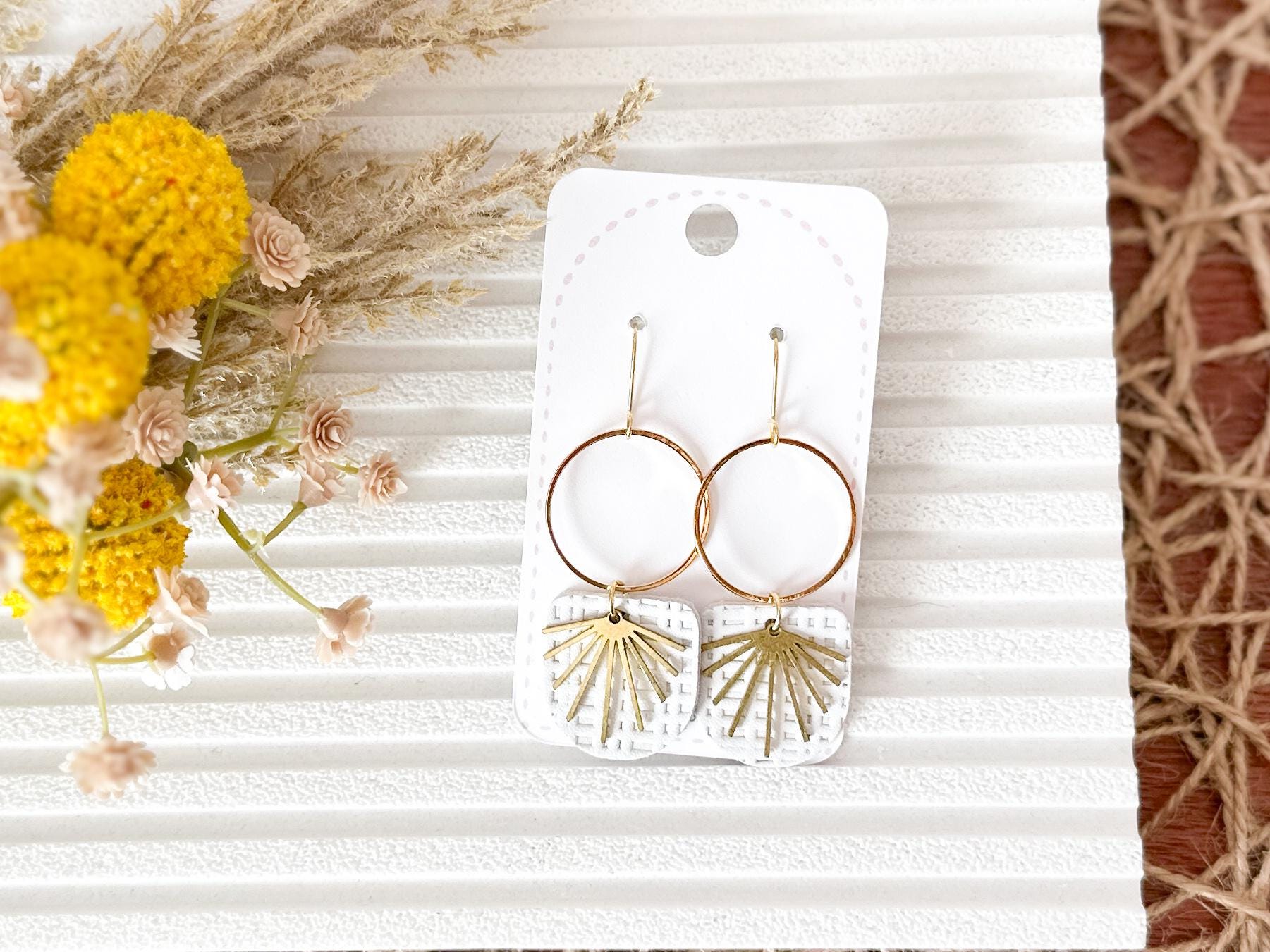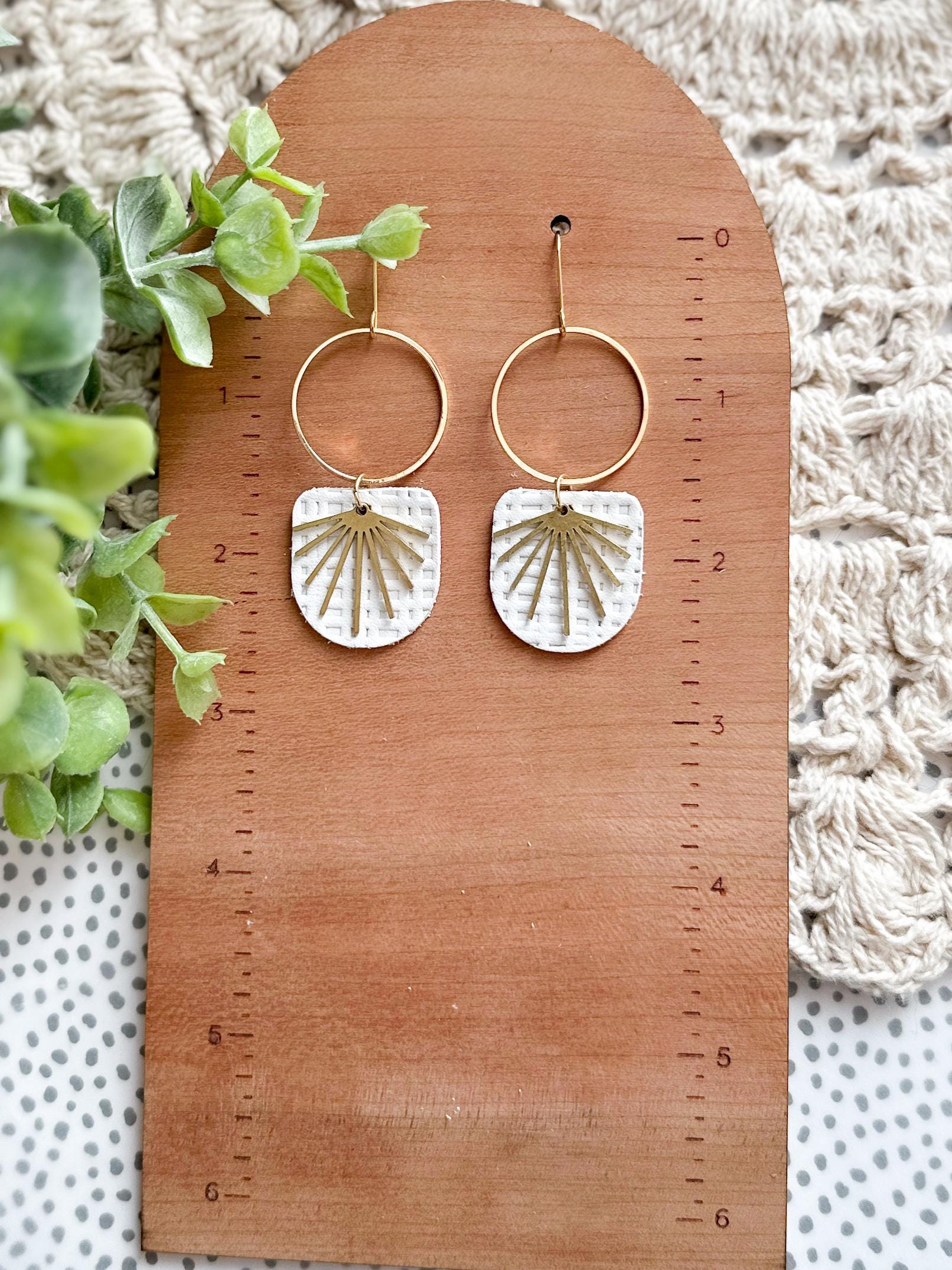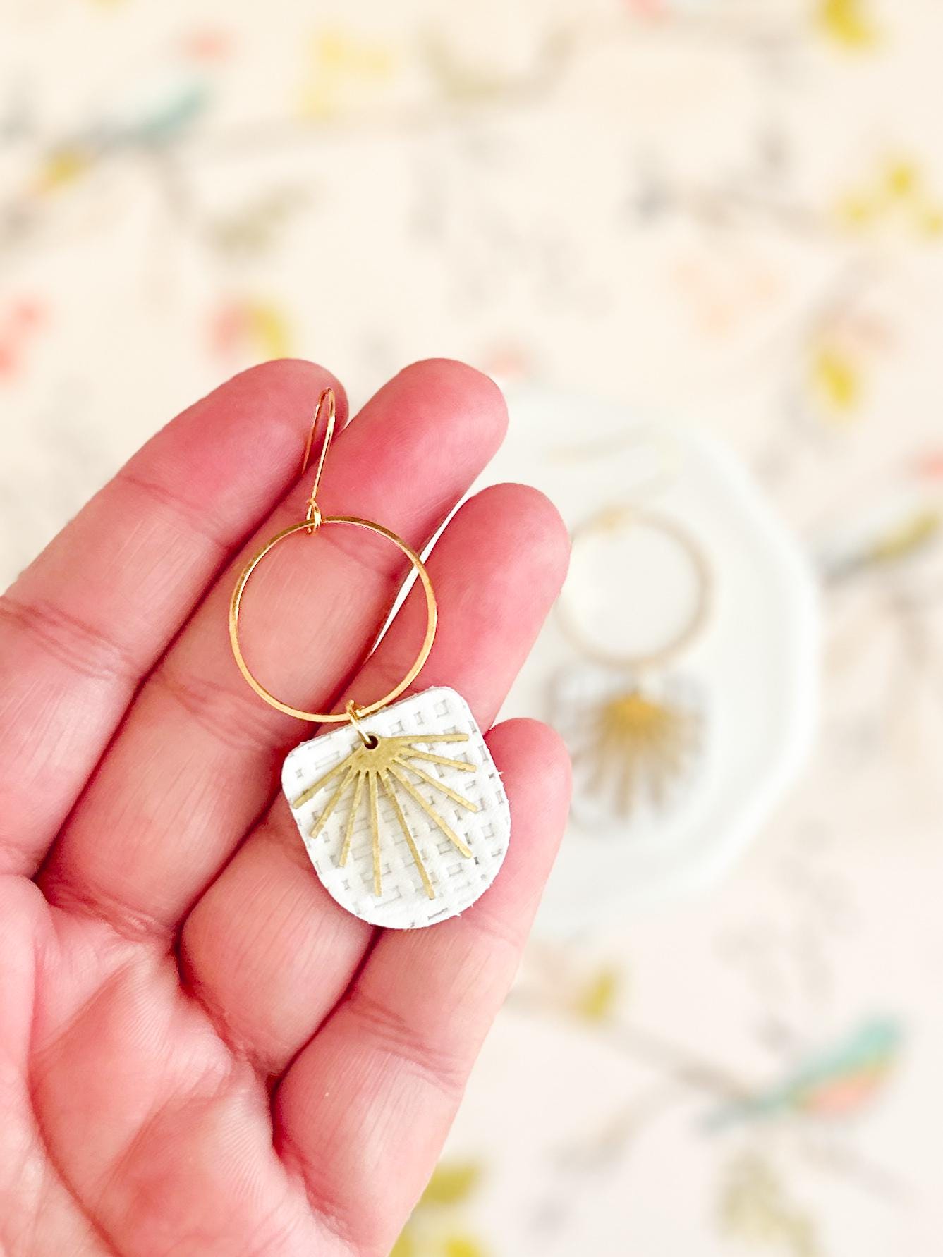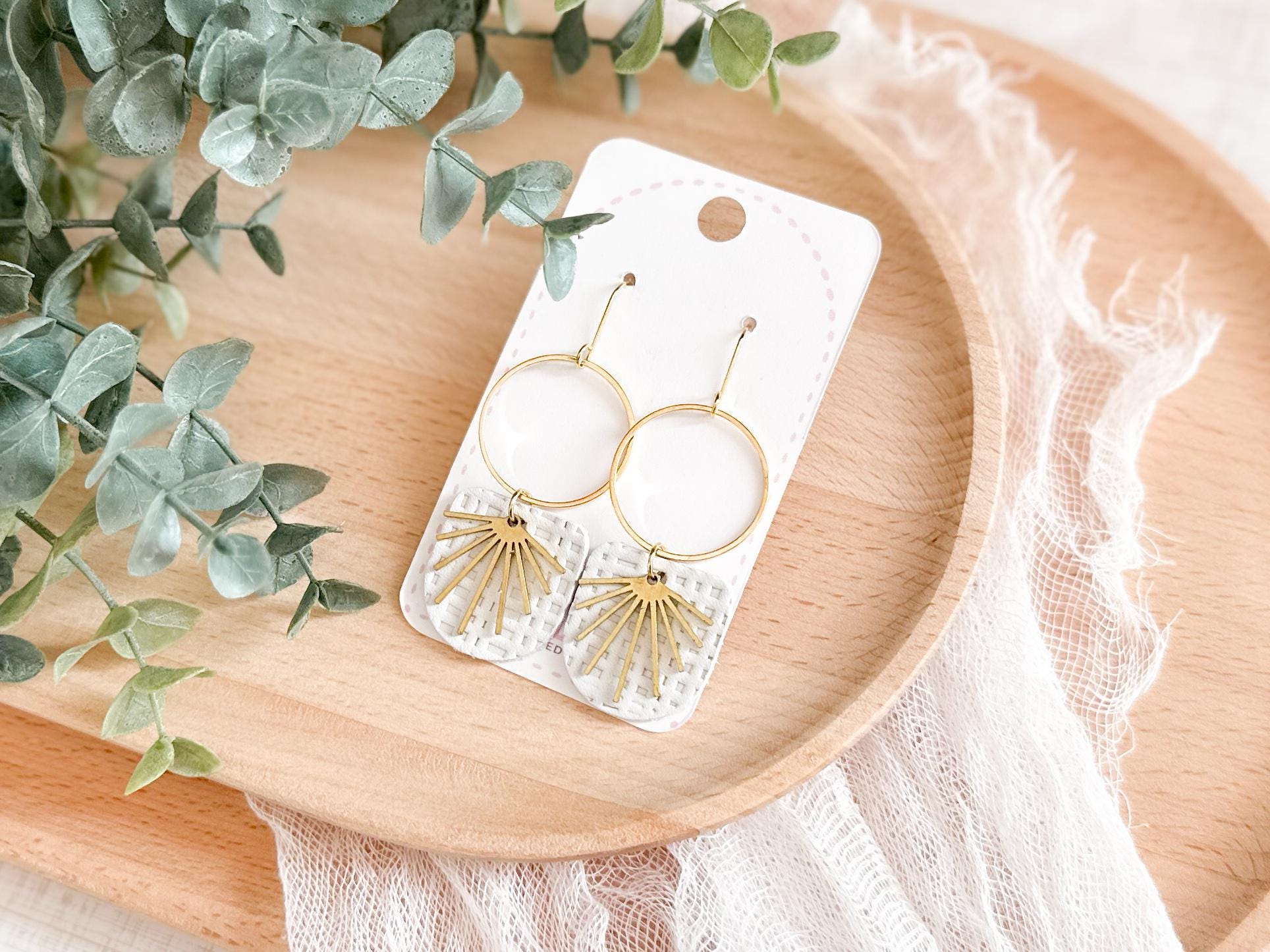 These chandelier-style earrings feature white textured leather layered beneath stainless steel hoops with a delicate brass burst accent. Lightweight with soft movement, they add a romantic, airy touch while remaining neutral enough for everyday wear. A beautiful handmade choice for gifting or for elevating your own collection.