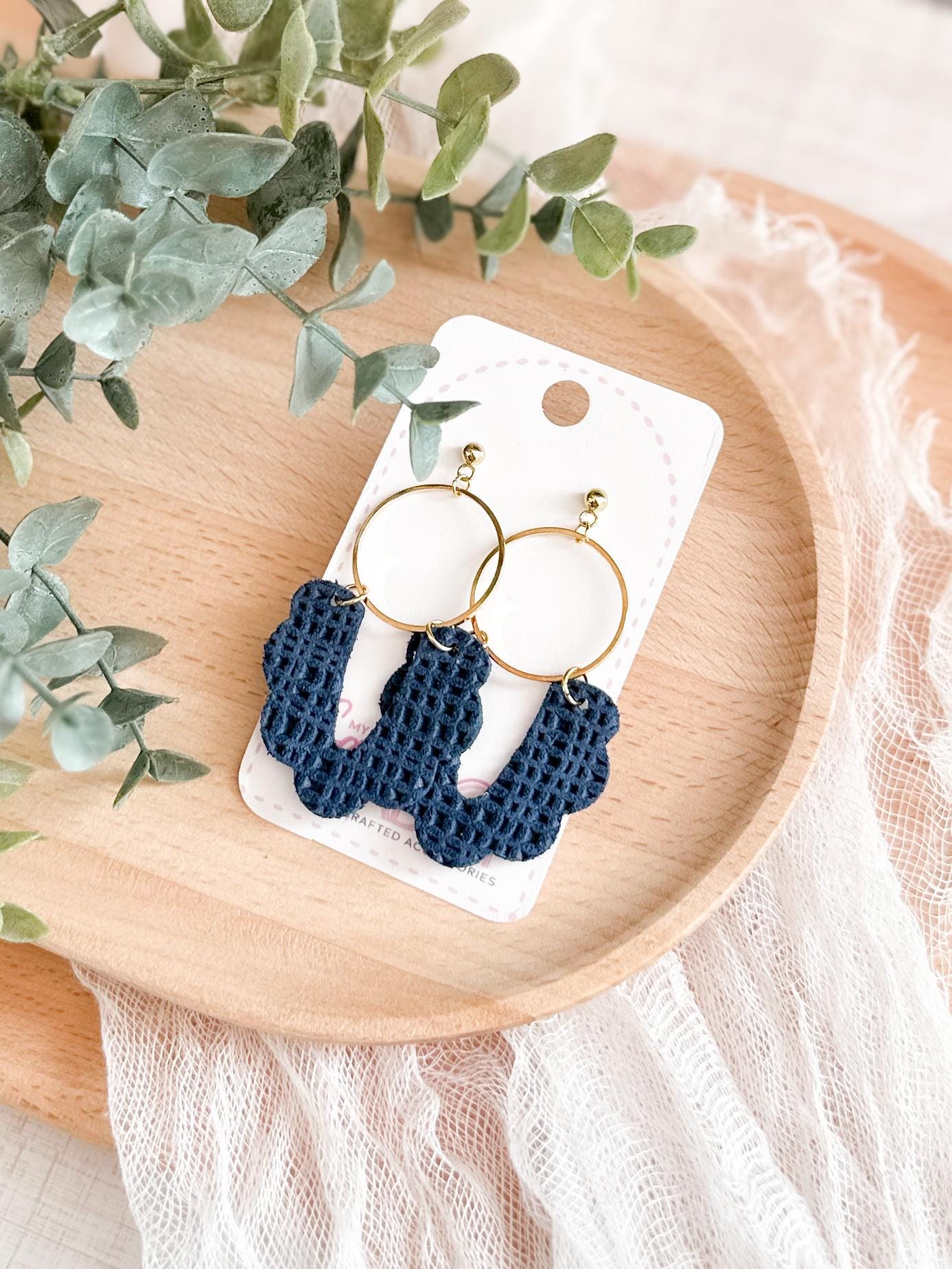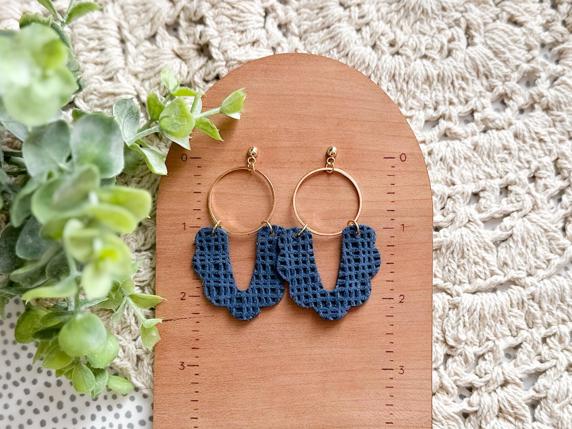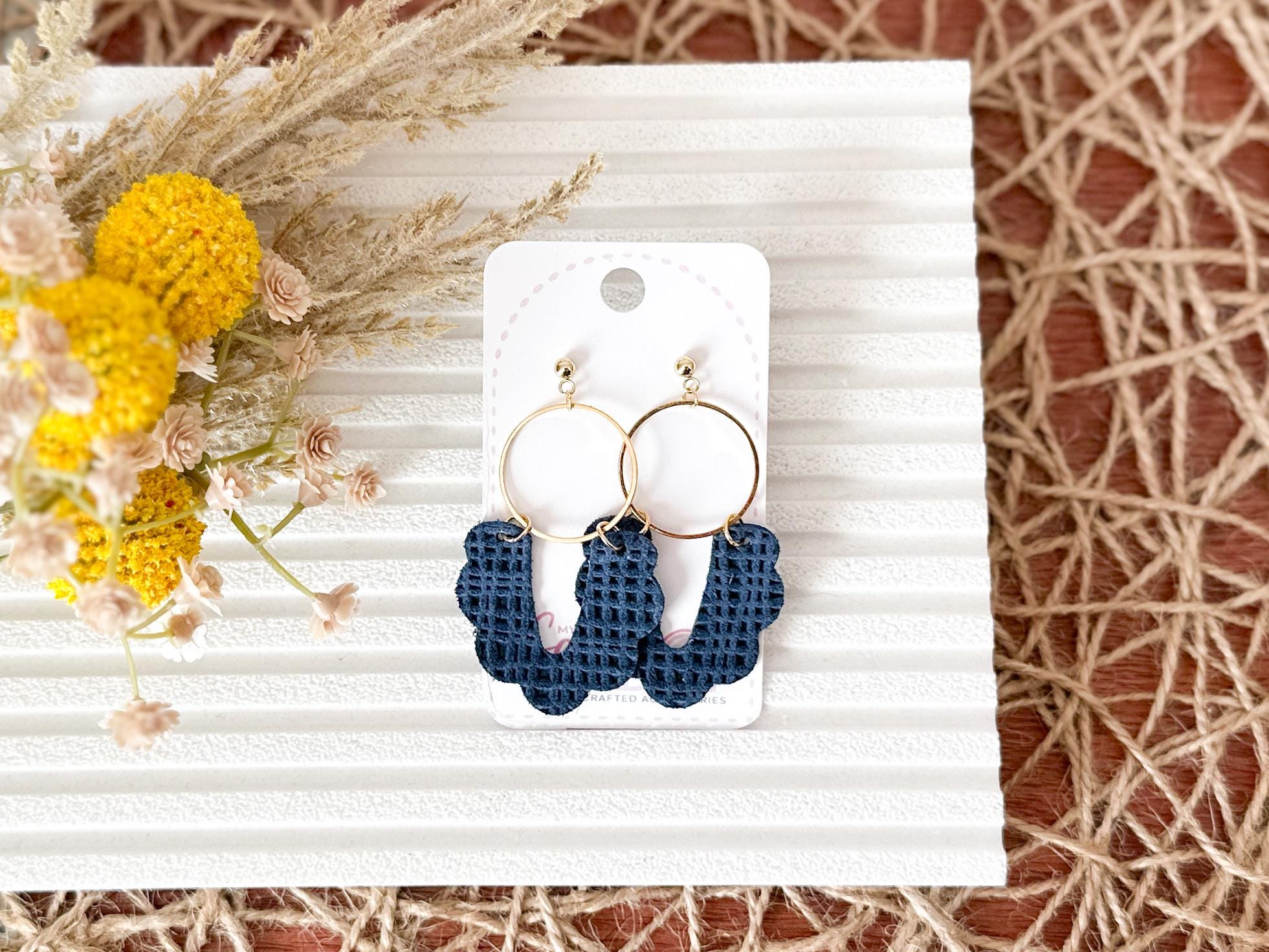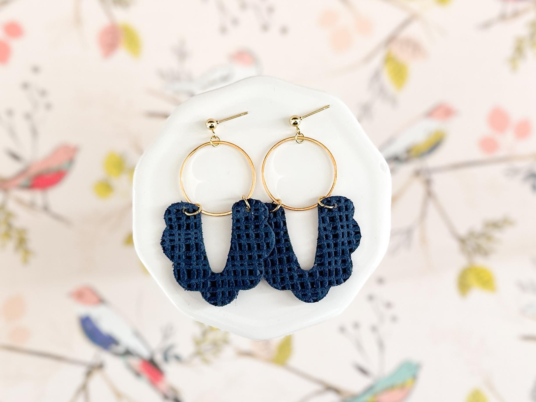 These hoop dangle earrings combine textured navy leather with gold-tone hoops for a rich, dimensional look. Lightweight and easy to wear, they add subtle movement and color while remaining effortlessly versatile. A beautiful handmade choice for everyday wear or gifting.