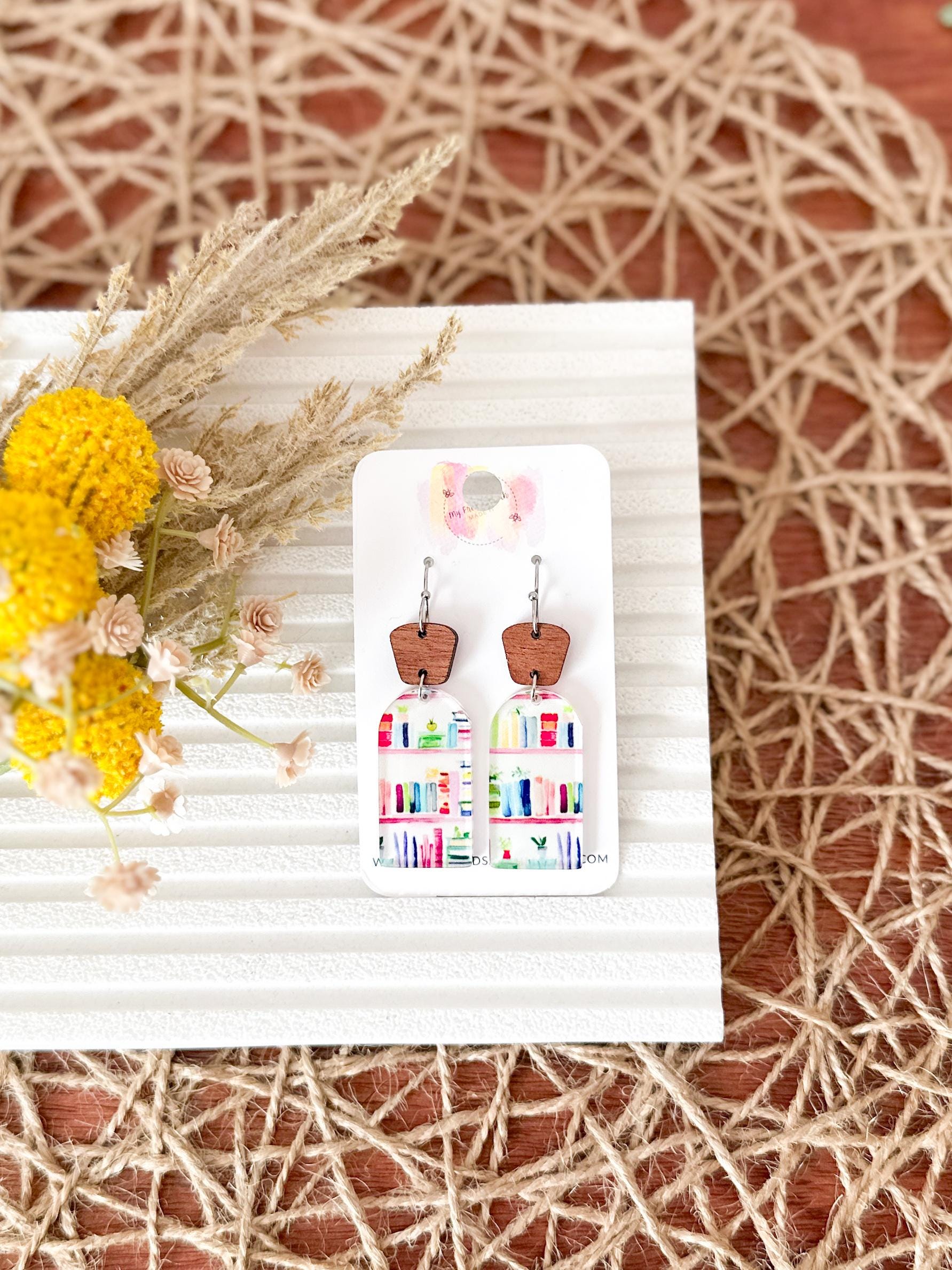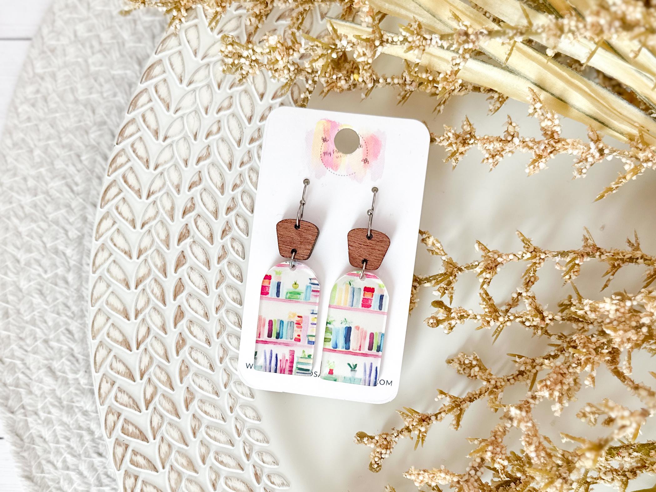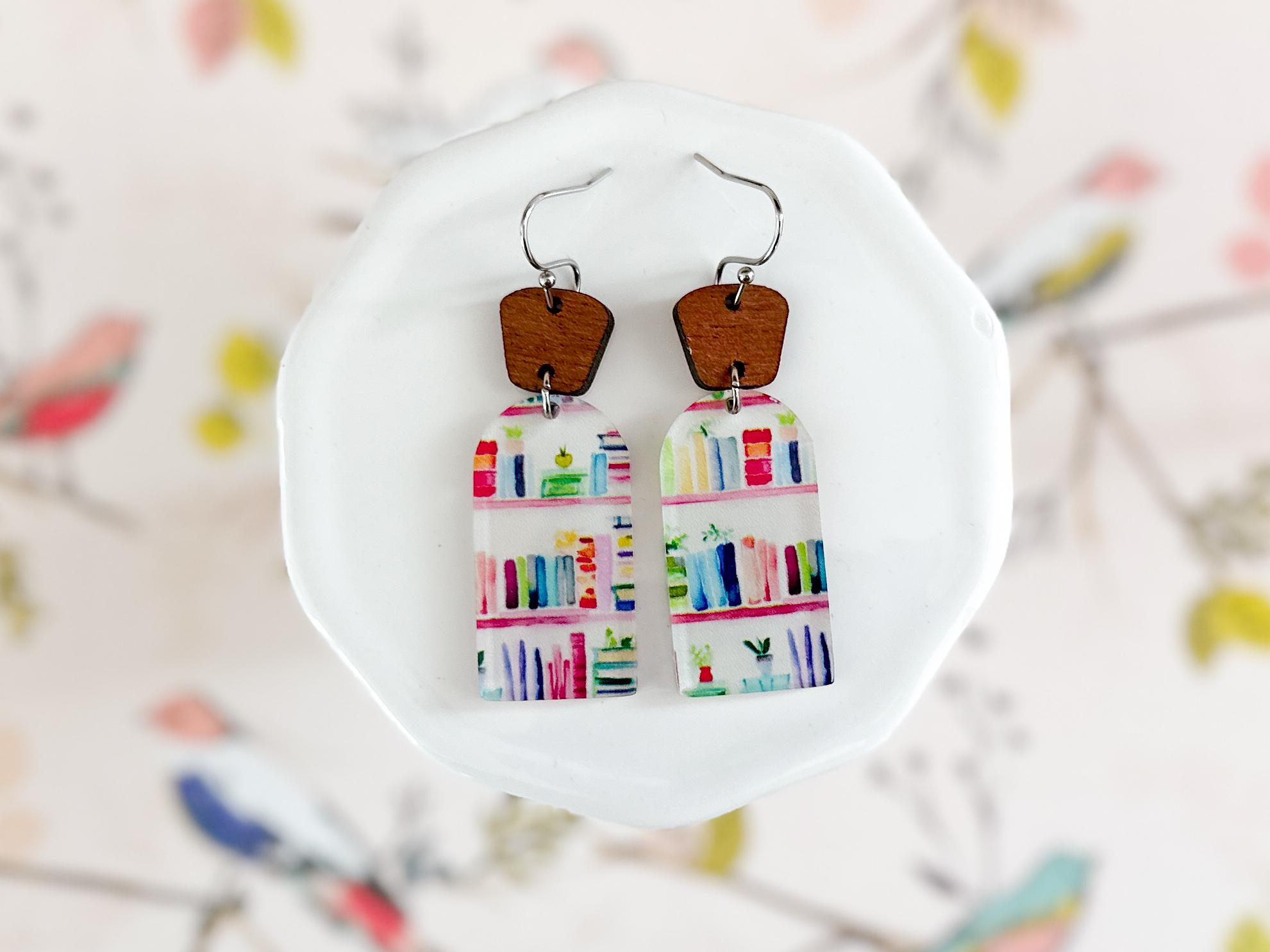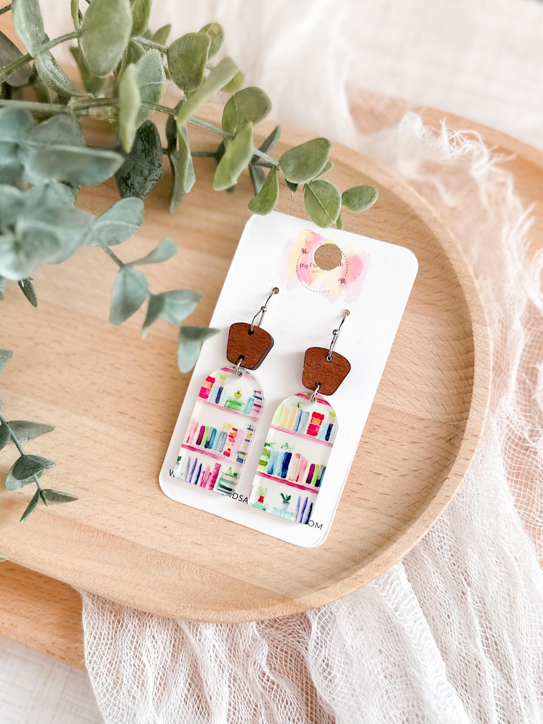 These rectangle dangle earrings showcase a colorful bookshelf pattern printed on lightweight acrylic, finished with warm wood accents for a clean, modern feel. Structured yet easy to wear, they bring a subtle bookish vibe that works effortlessly with everyday outfits. A thoughtful handmade choice for readers and book lovers alike.