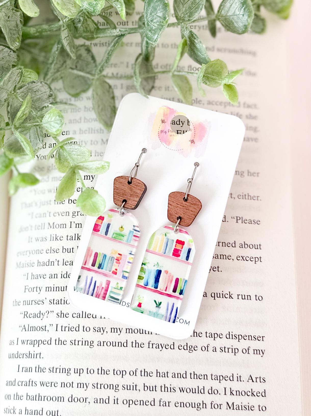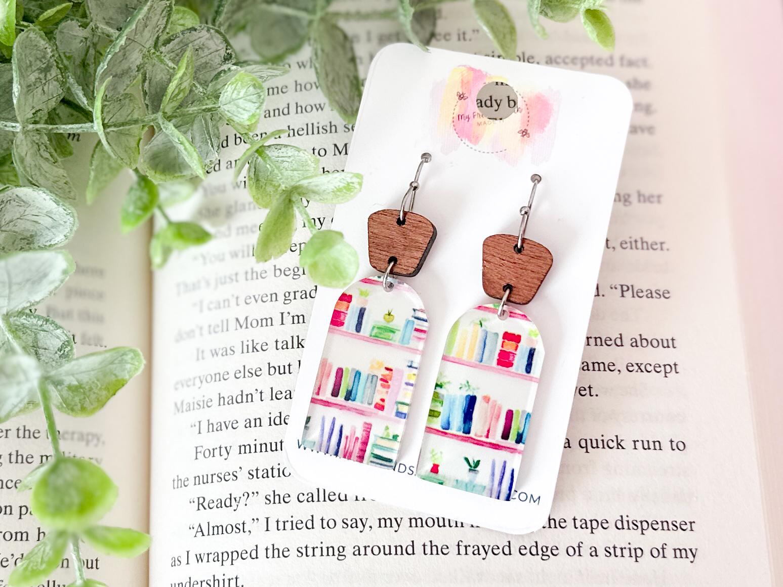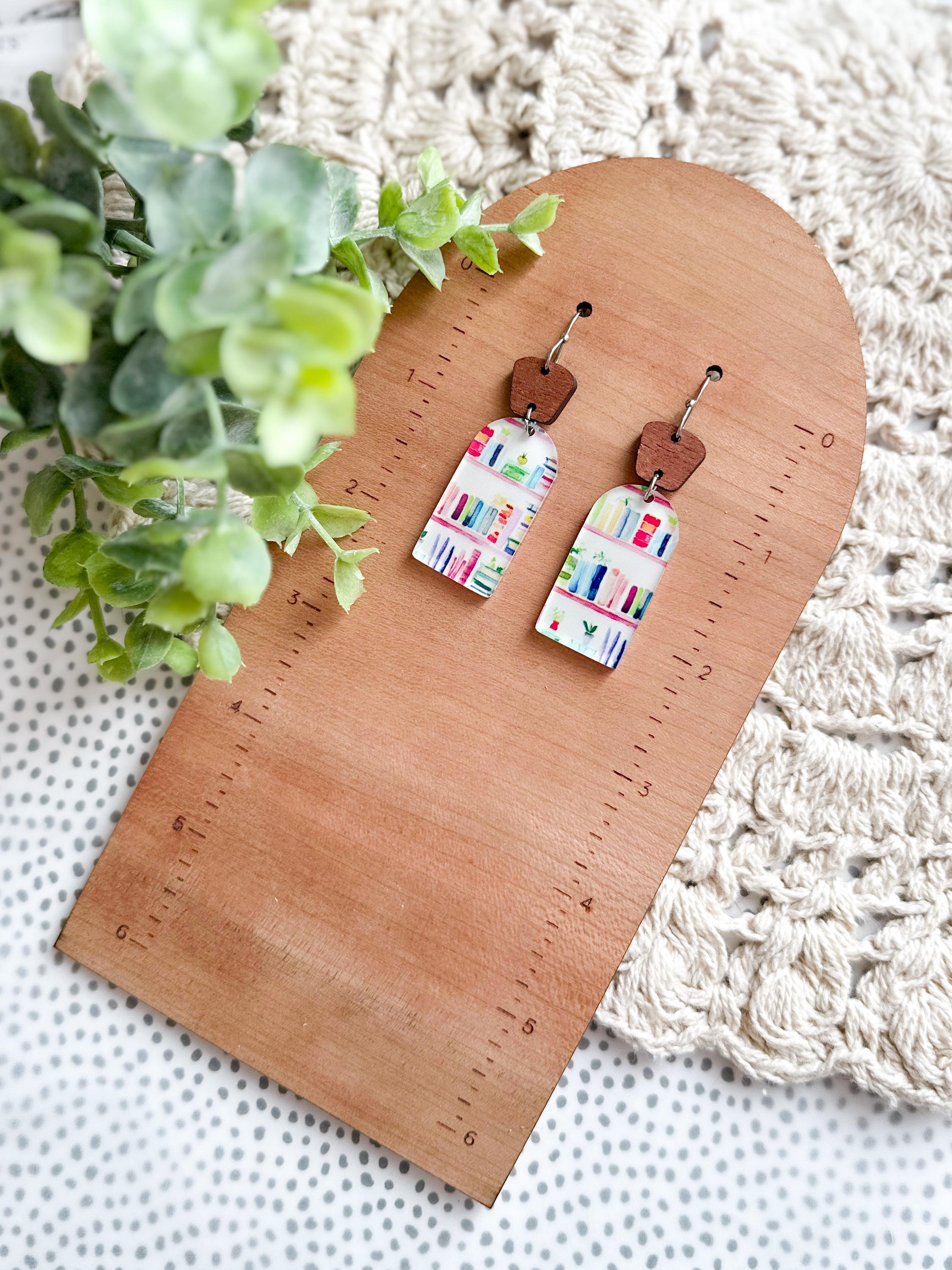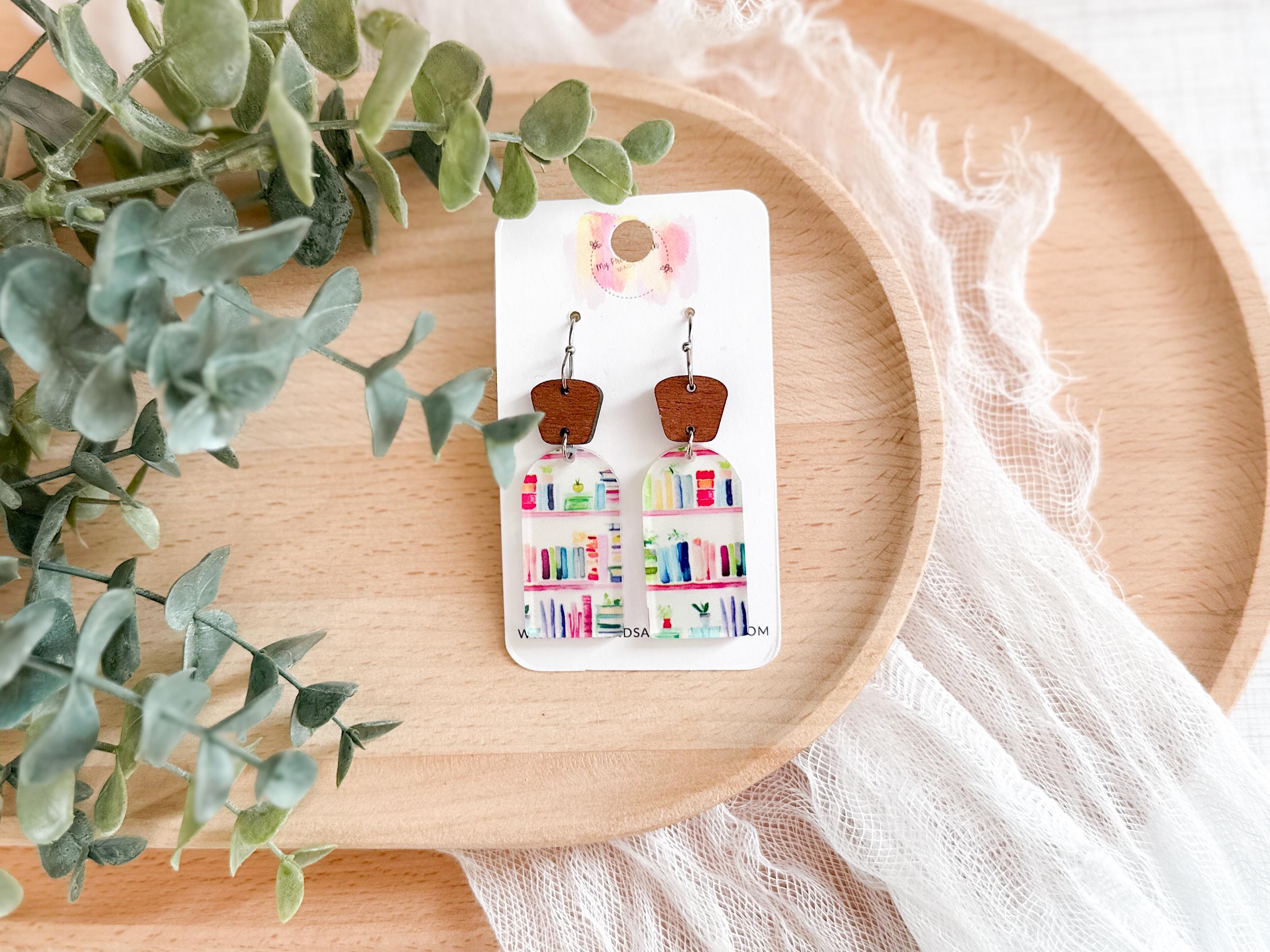 These rectangle dangle earrings showcase a colorful bookshelf pattern printed on lightweight acrylic, finished with warm wood accents for a clean, modern feel. Structured yet easy to wear, they bring a subtle bookish vibe that works effortlessly with everyday outfits. A thoughtful handmade choice for readers and book lovers alike.