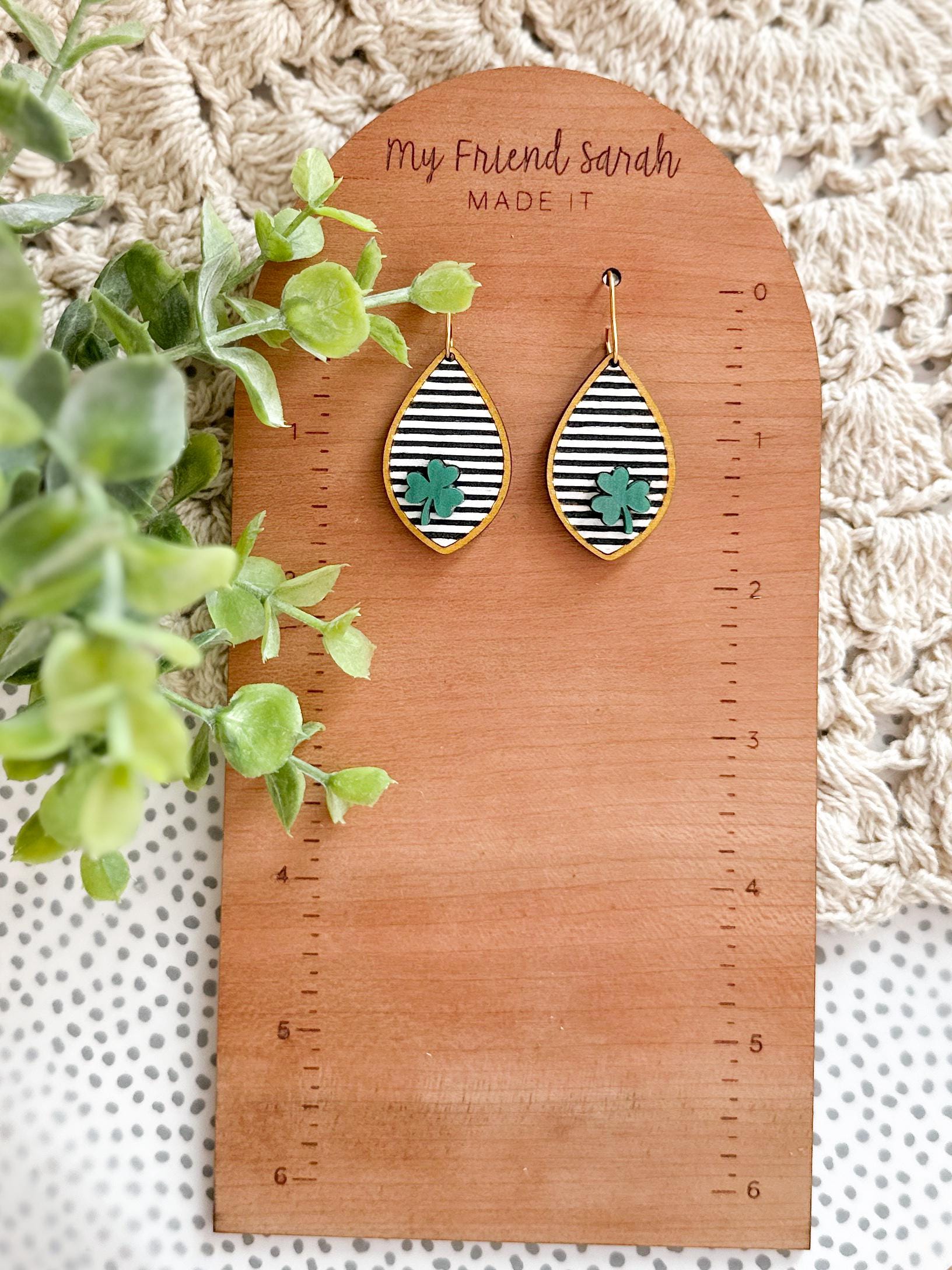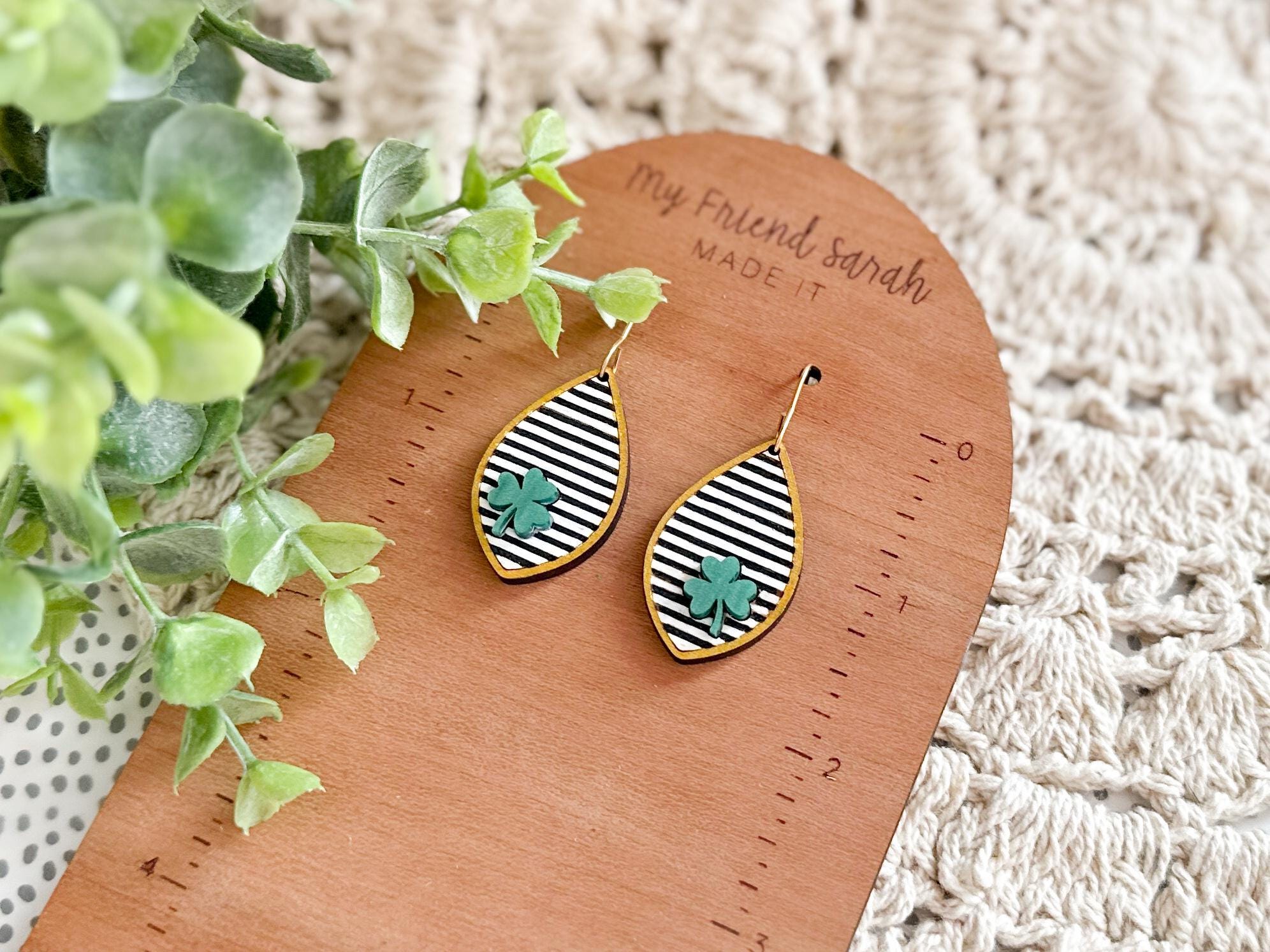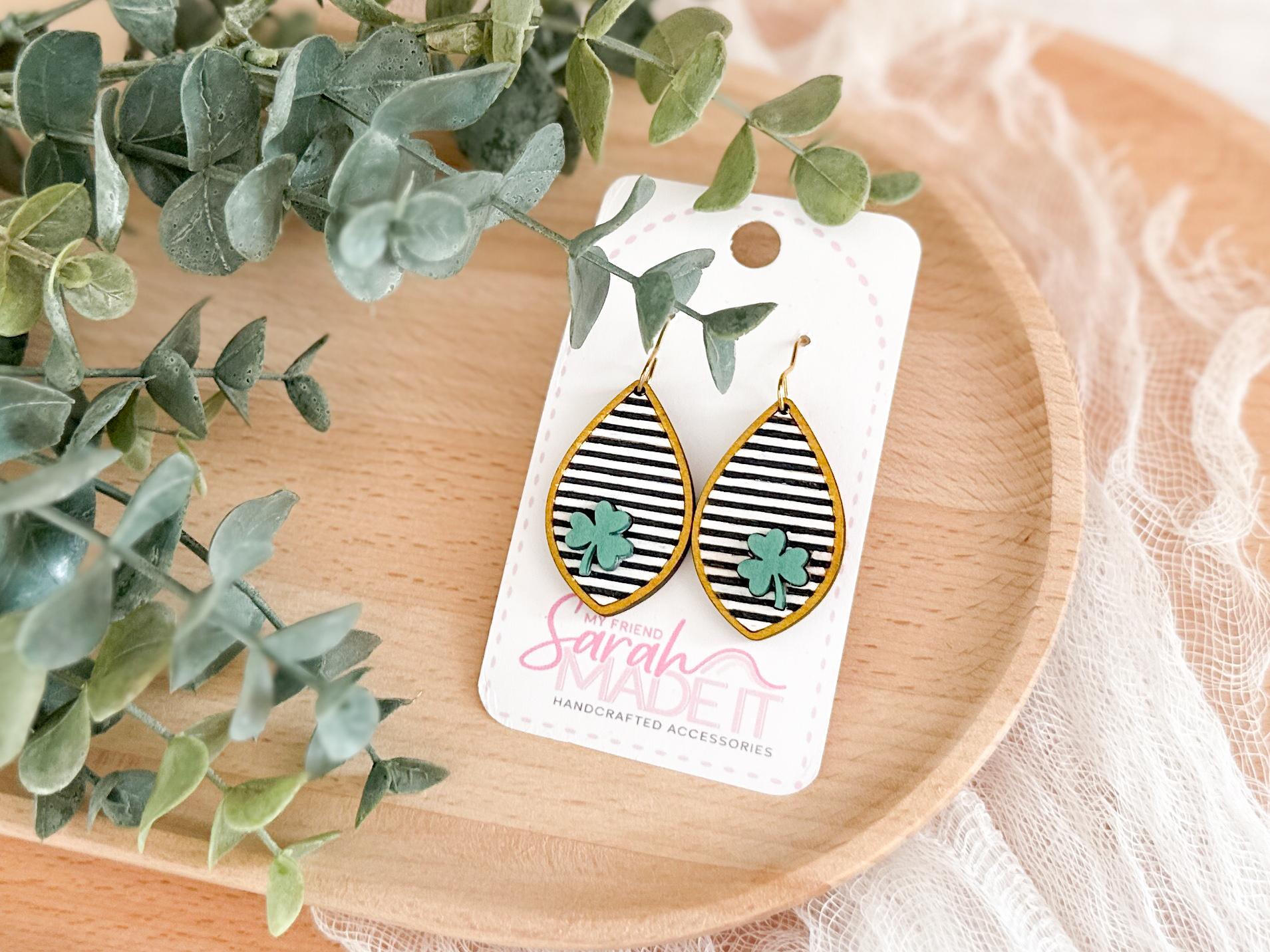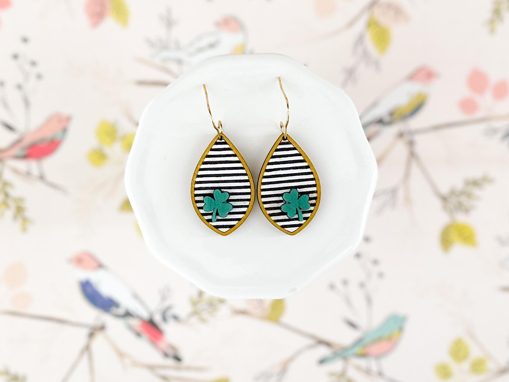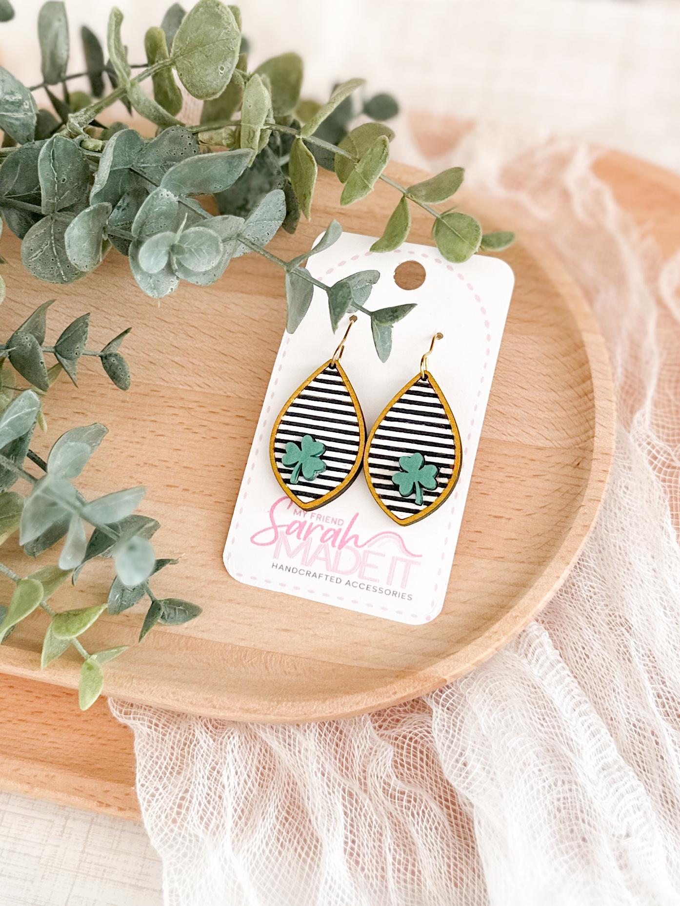 Feeling a little lucky? These bold little beauties are here to make sure of it. Laser cut from lightweight wood, each petal is hand painted with classic black and white stripes, finished with a crisp gold edge detail, and topped off with a glossy acrylic shamrock accent for just the right pop of charm. They’re equal parts playful and polished... the kind of earrings that get compliments in the grocery store line.