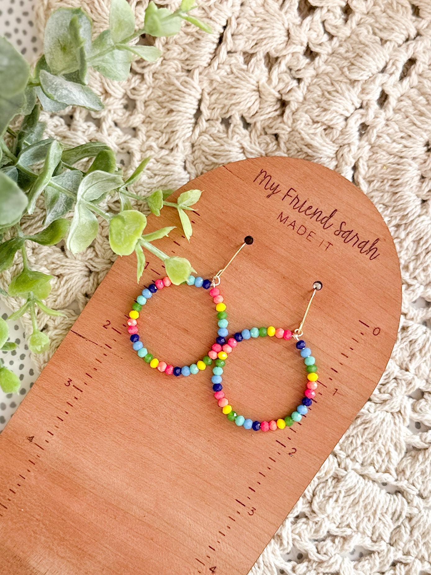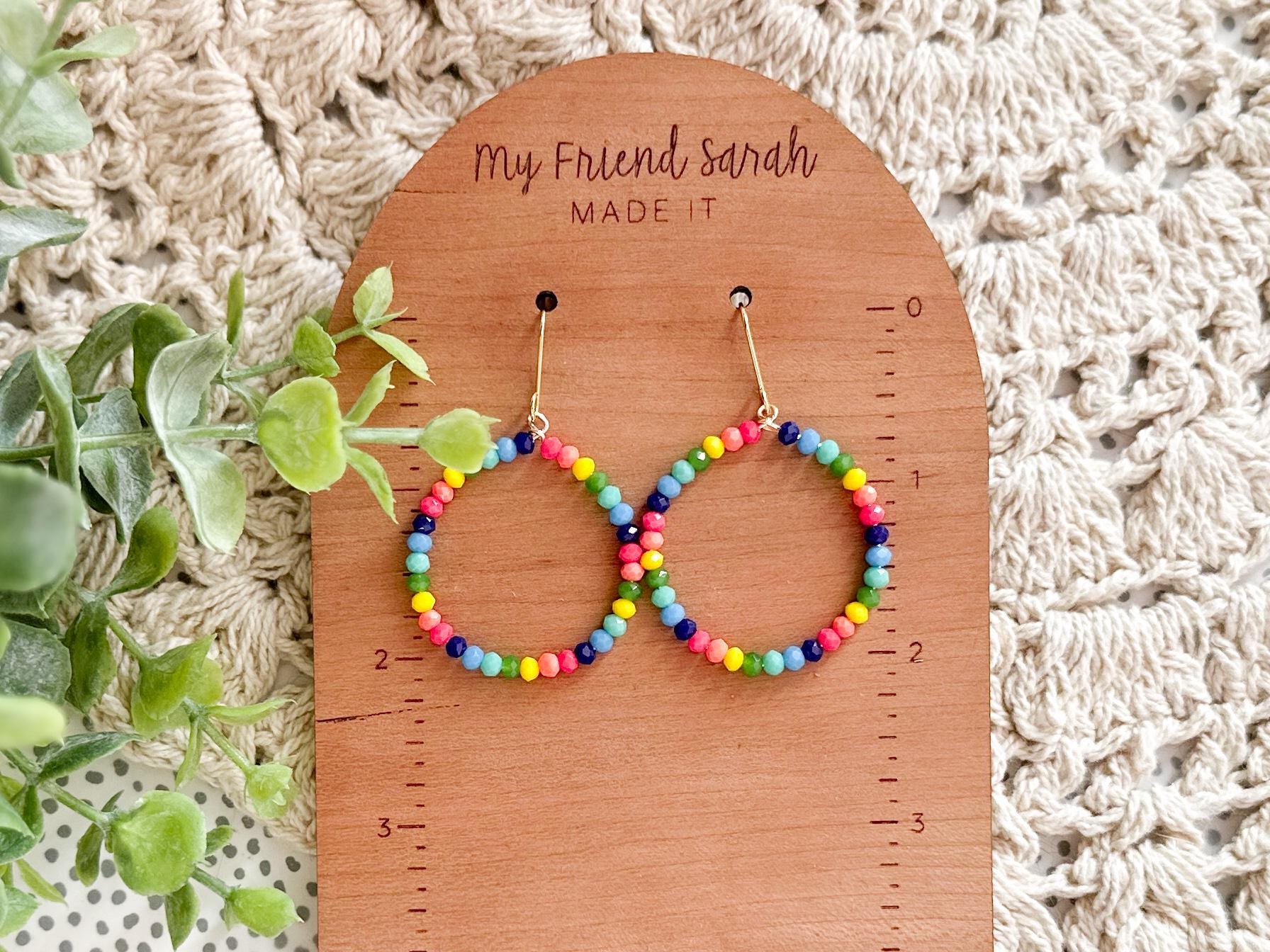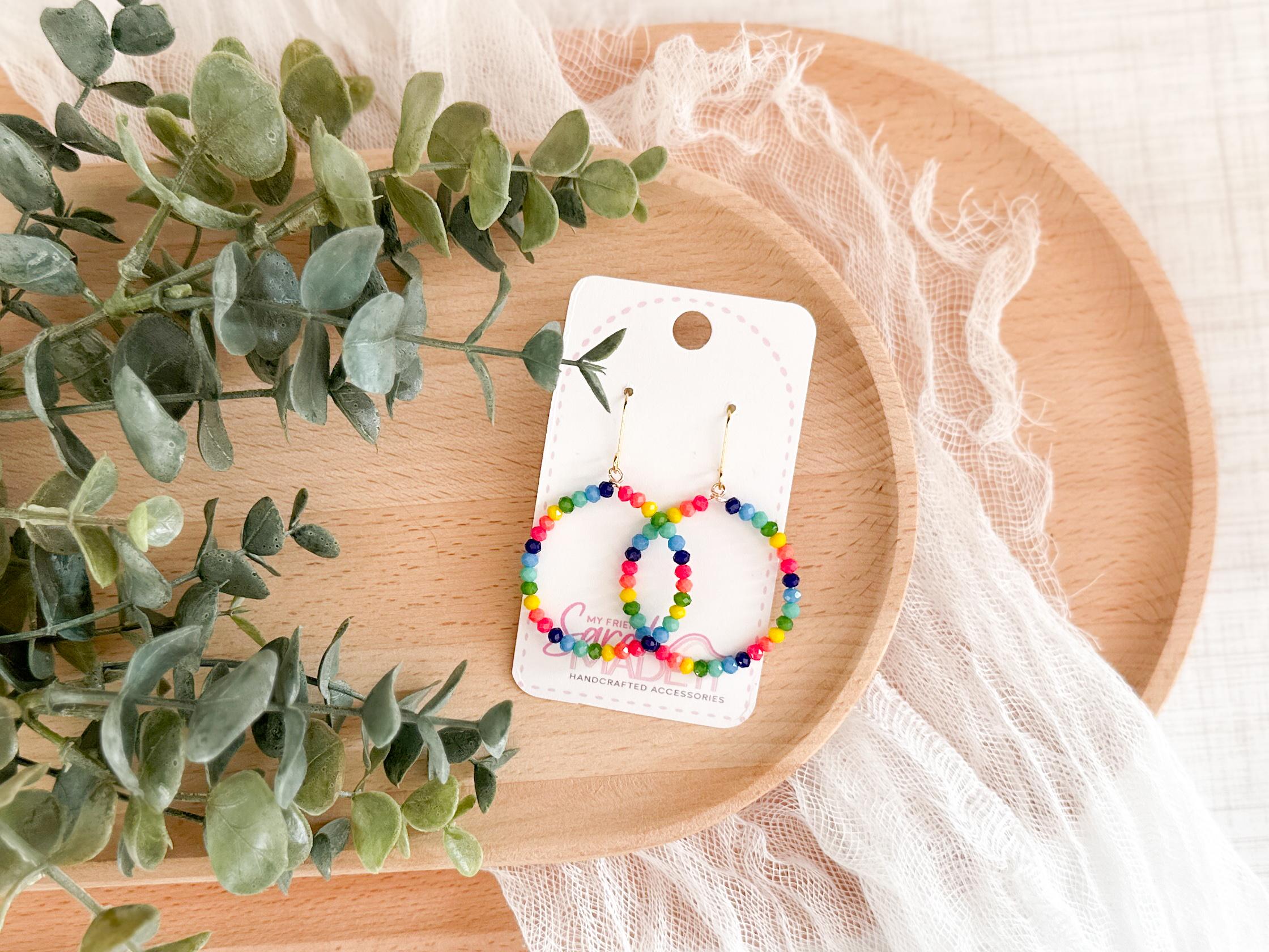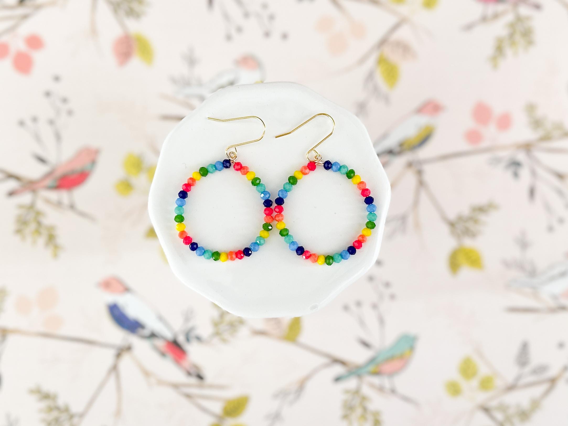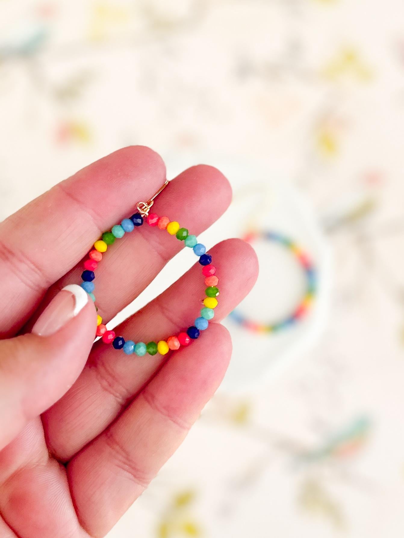 Warning: these may cause spontaneous smiling. These colorful beaded hoops are hand-wrapped with vibrant rainbow glass beads for the happiest little pop of color you’ve ever worn. Lightweight and full of movement, they’re playful without feeling costume-y. Each pair is carefully wrapped by hand in my Florida home studio and finished with gold hooks for a polished touch.