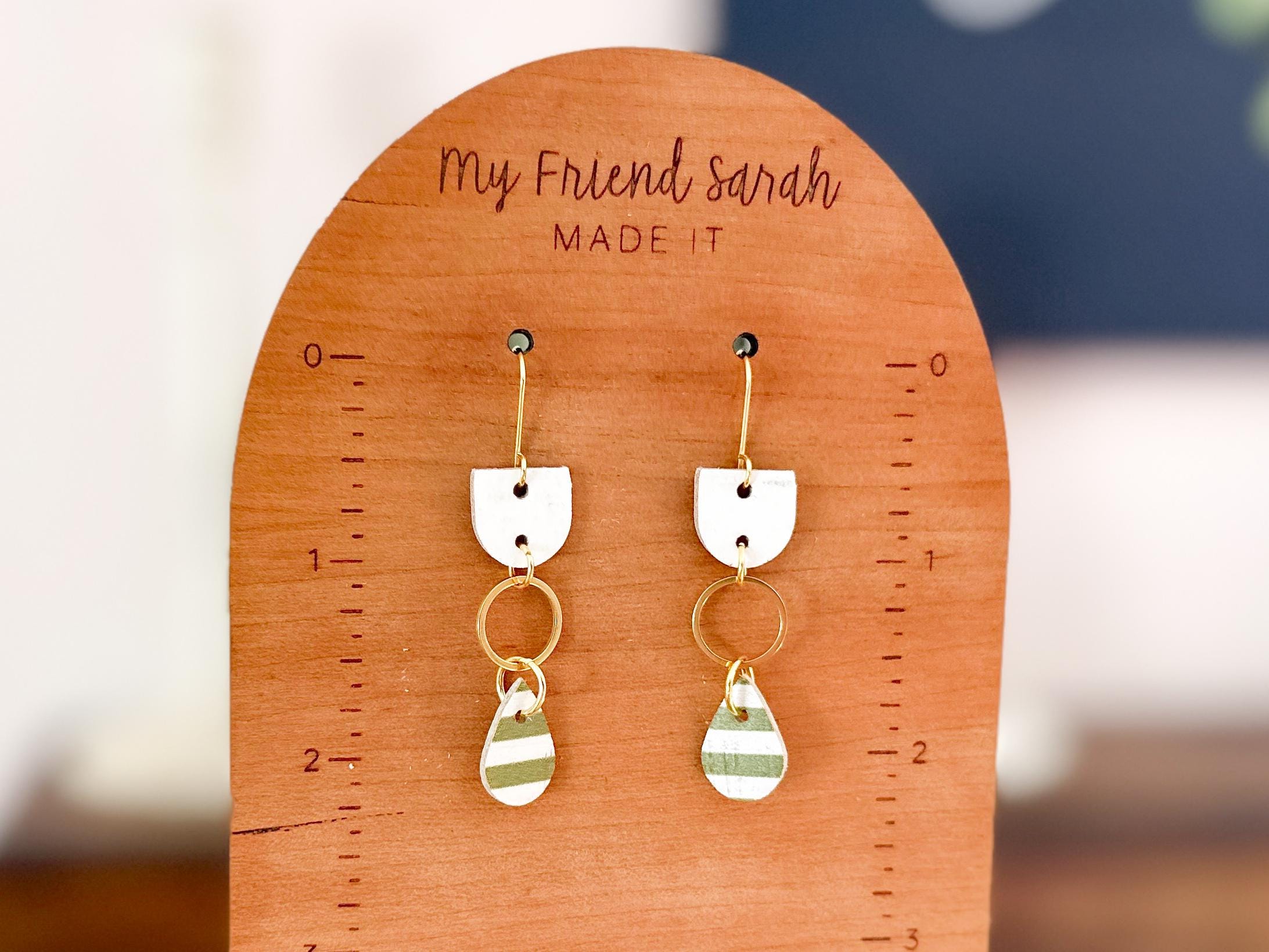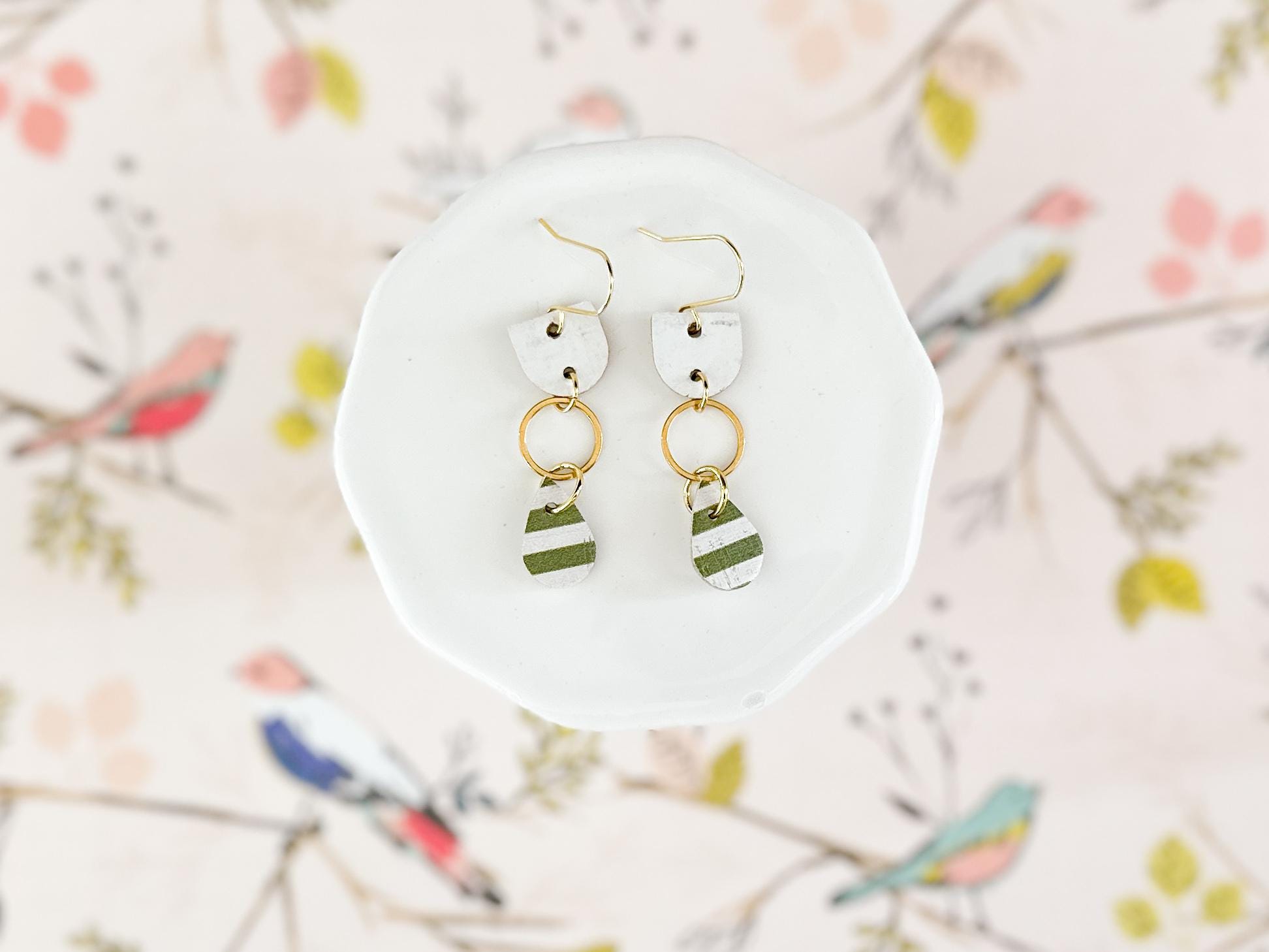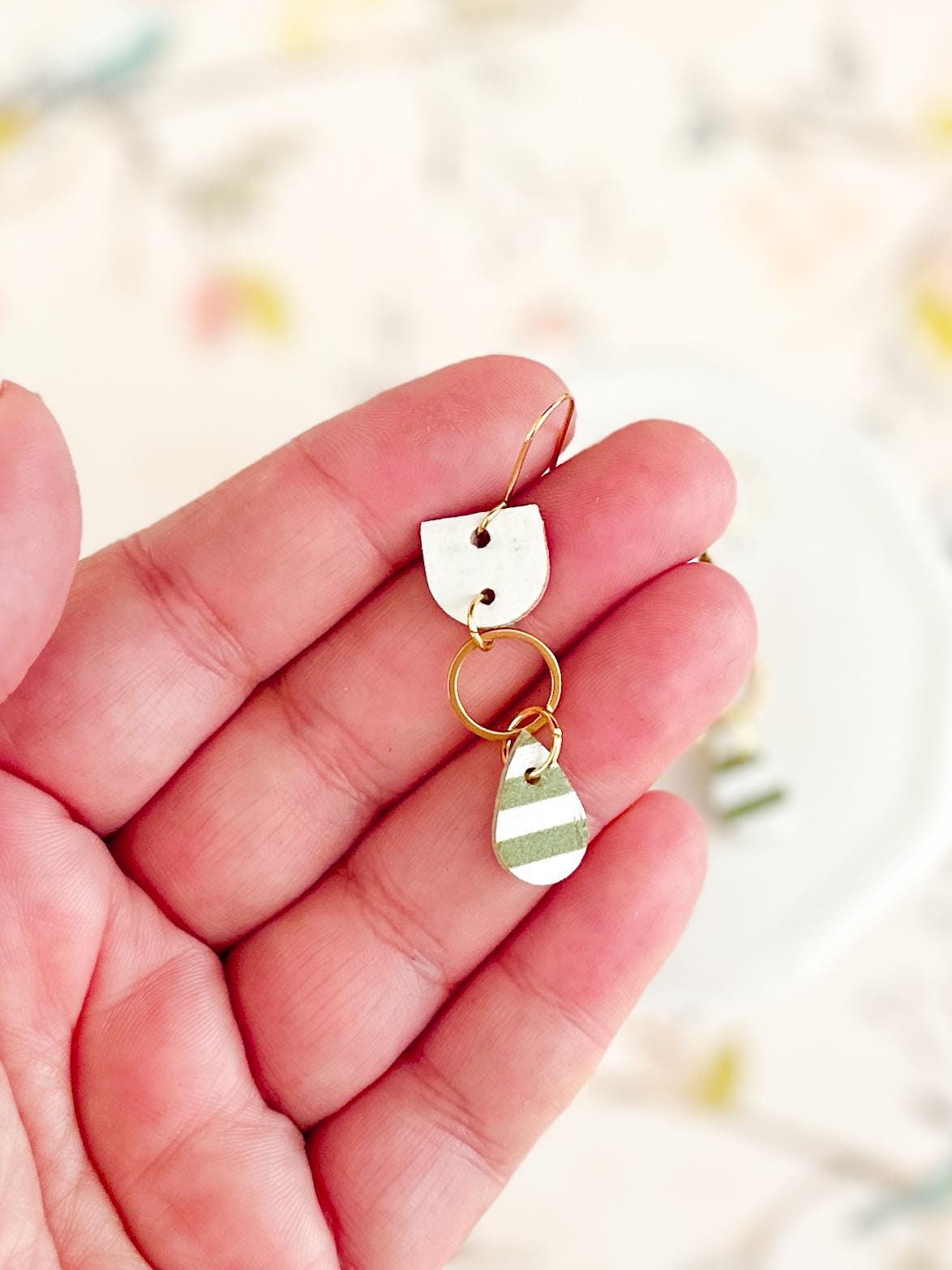These green and white striped cork earrings are paired with warm gold accents for an earthy, easy-to-wear statement. Lightweight and comfortable, theyβre perfect for spring outfits, teacher gifts, or anyone who loves a little green without going full holiday mode. Handmade in my Florida studio from start to finish.