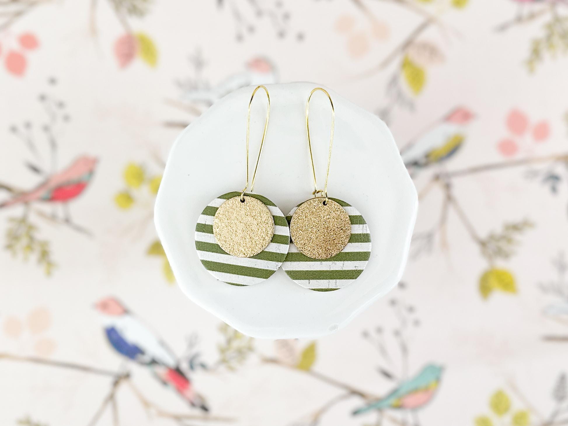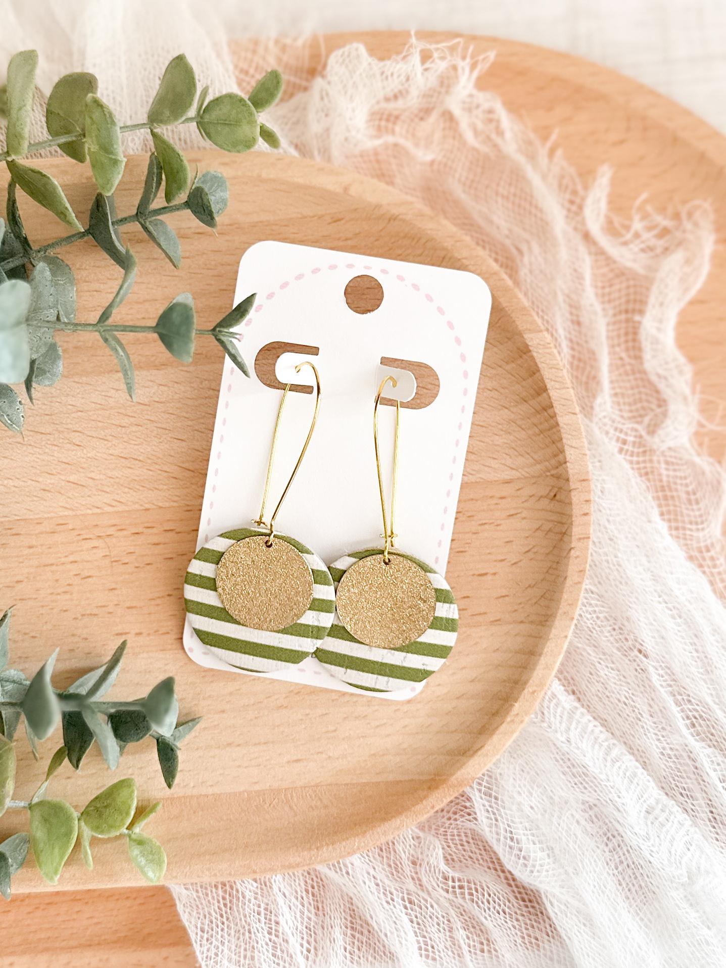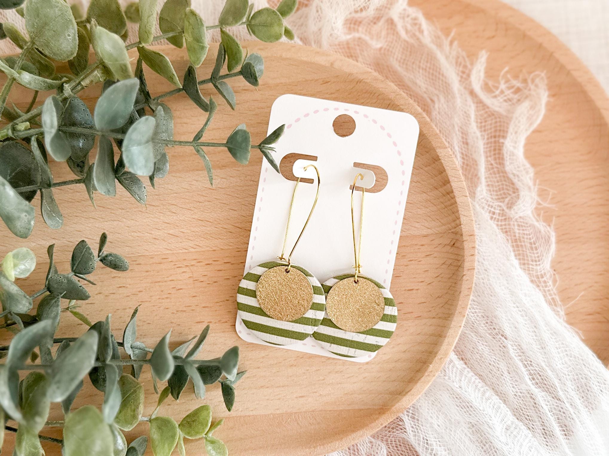 Green and white striped cork meets a pop of gold for a fresh, polished look. These lightweight round dangles add just enough color while staying neutral enough for everyday wear. A fun spring accessory or an easy gift for the green-loving friend in your life.