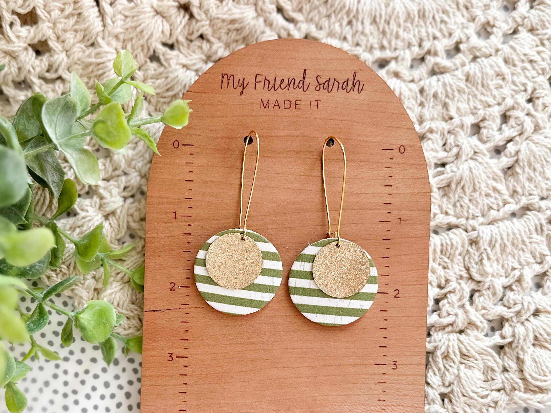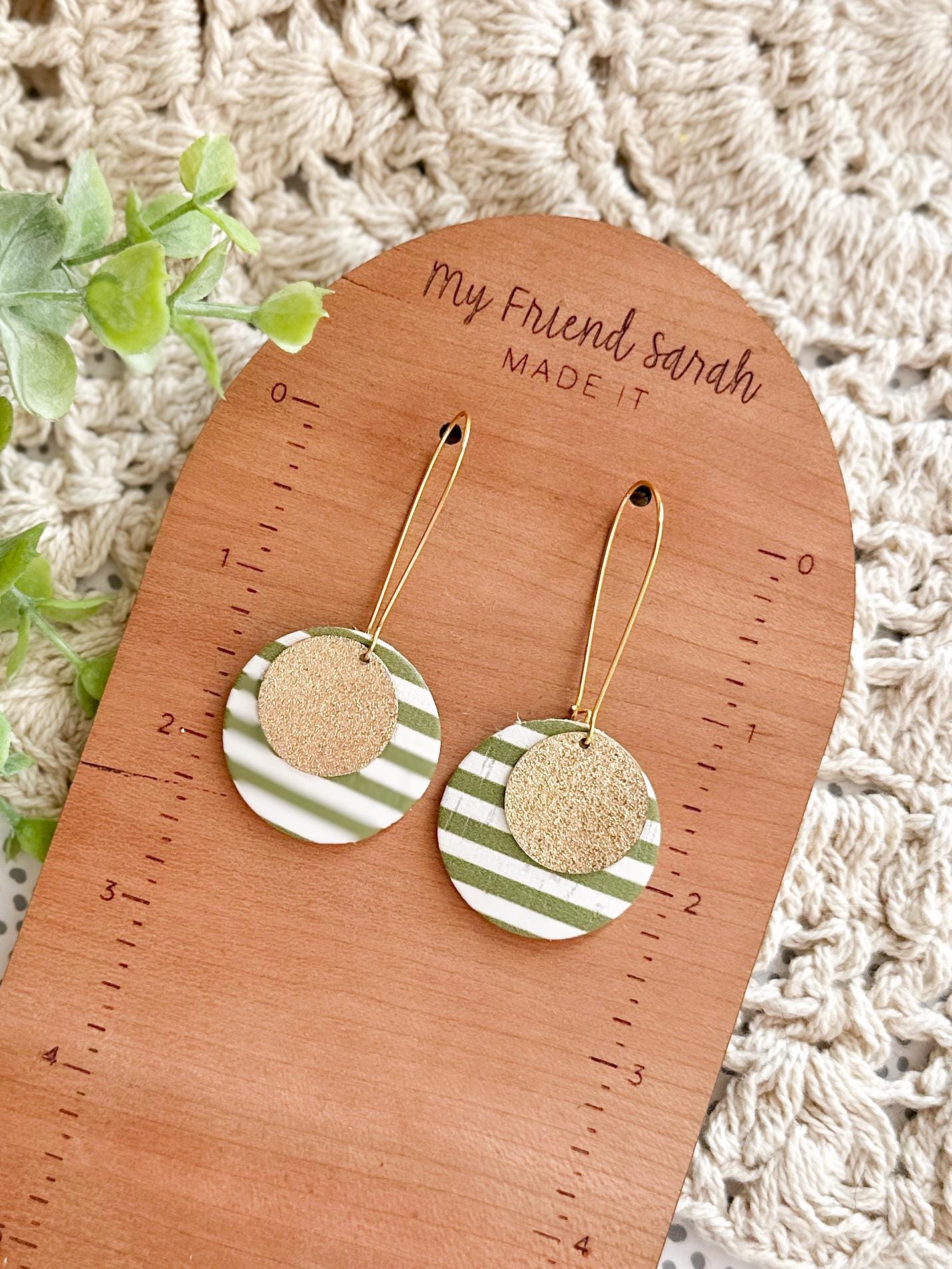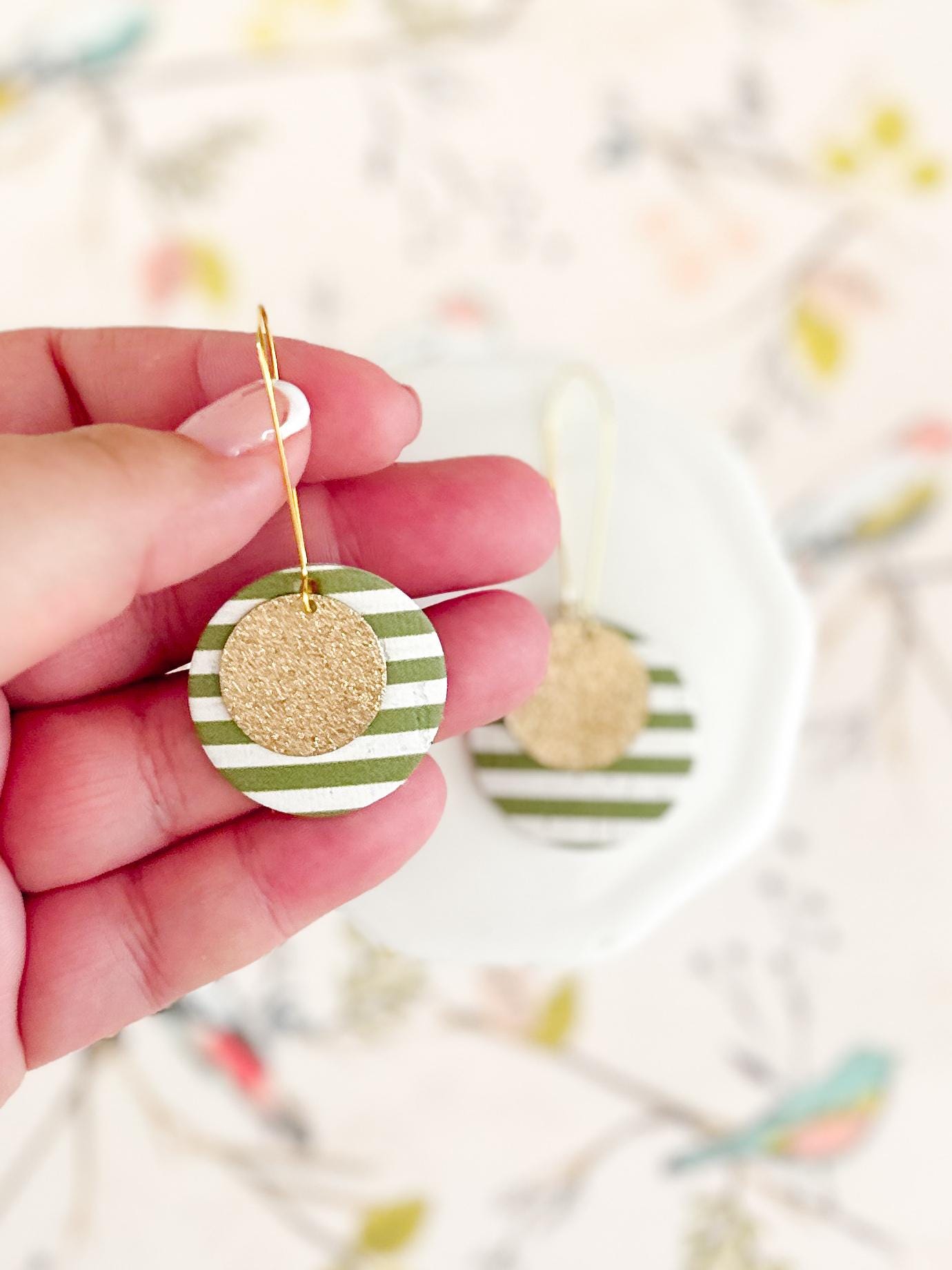 Green and white striped cork meets a pop of gold for a fresh, polished look. These lightweight round dangles add just enough color while staying neutral enough for everyday wear. A fun spring accessory or an easy gift for the green-loving friend in your life.
