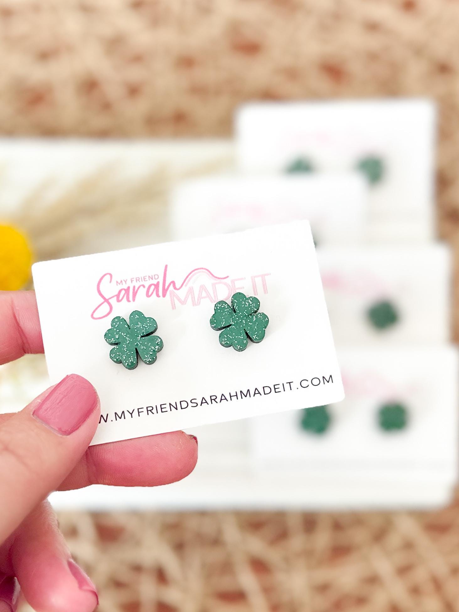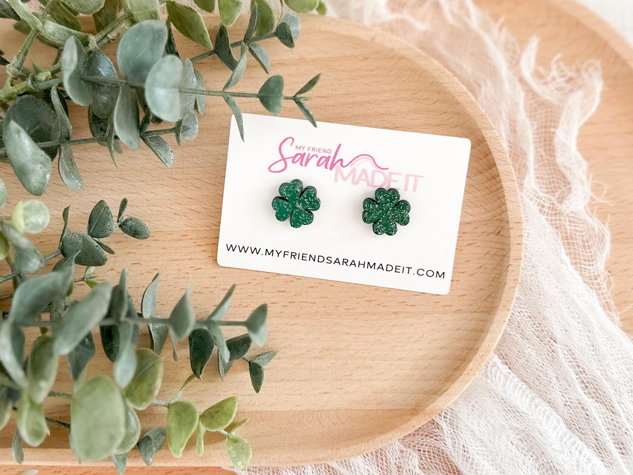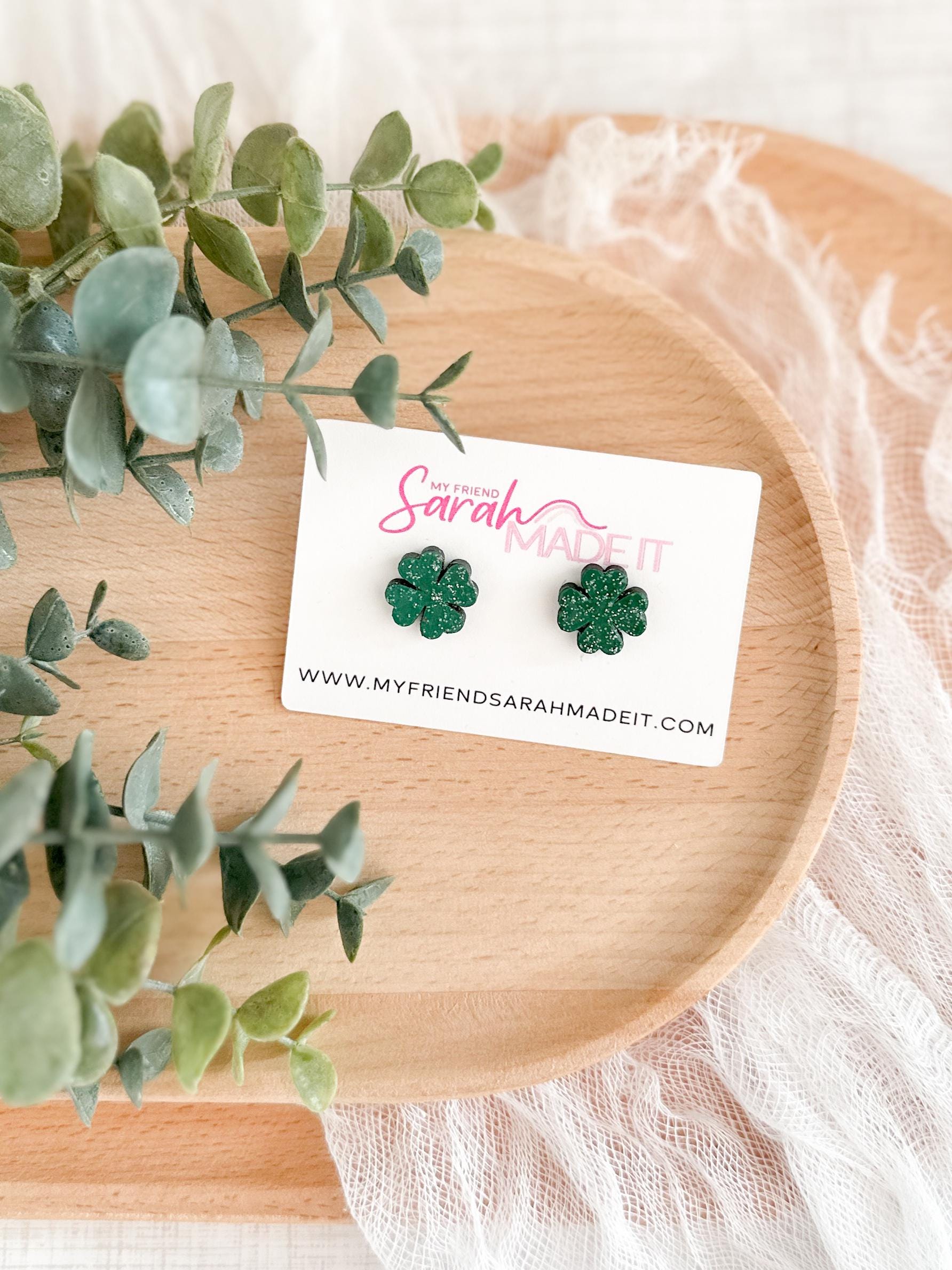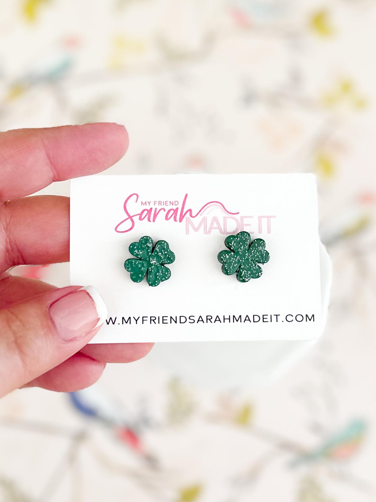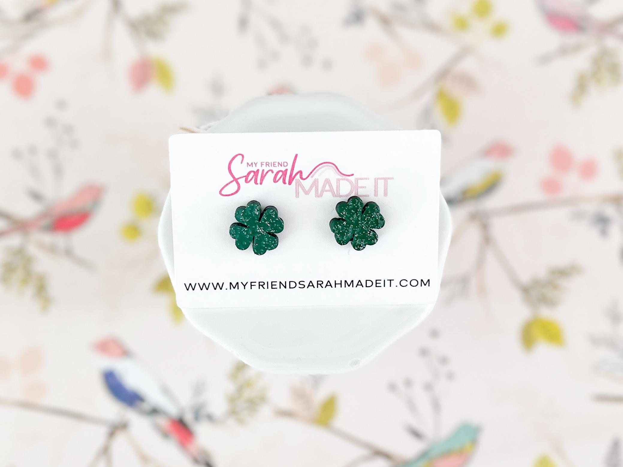 These glittery shamrock studs are laser cut from wood and hand painted in my studio with a touch of sparkle for extra charm. Lightweight and easy to wear, they’re festive without feeling fussy. Perfect for St. Patrick’s Day or anytime you’re feeling a little lucky!