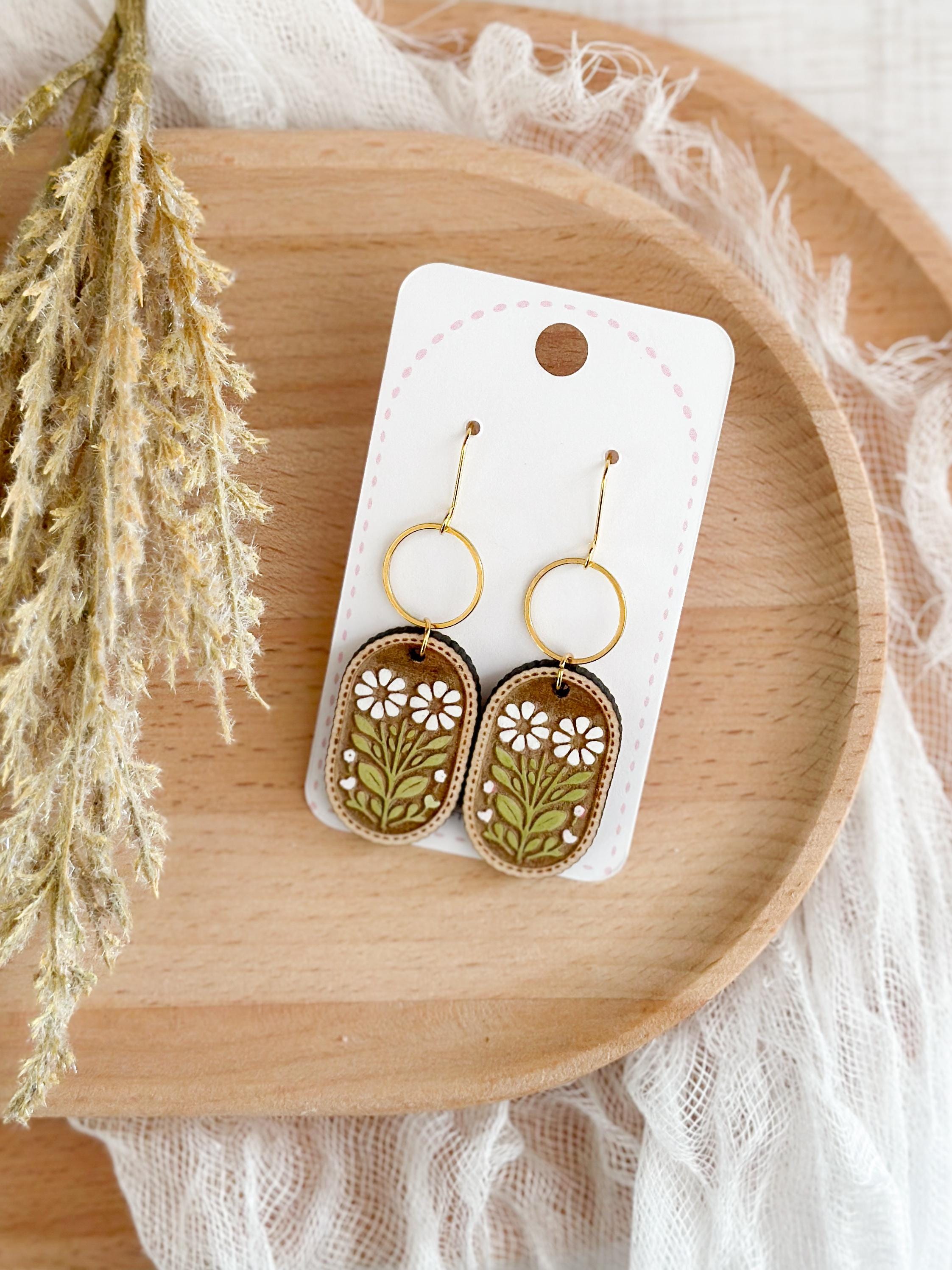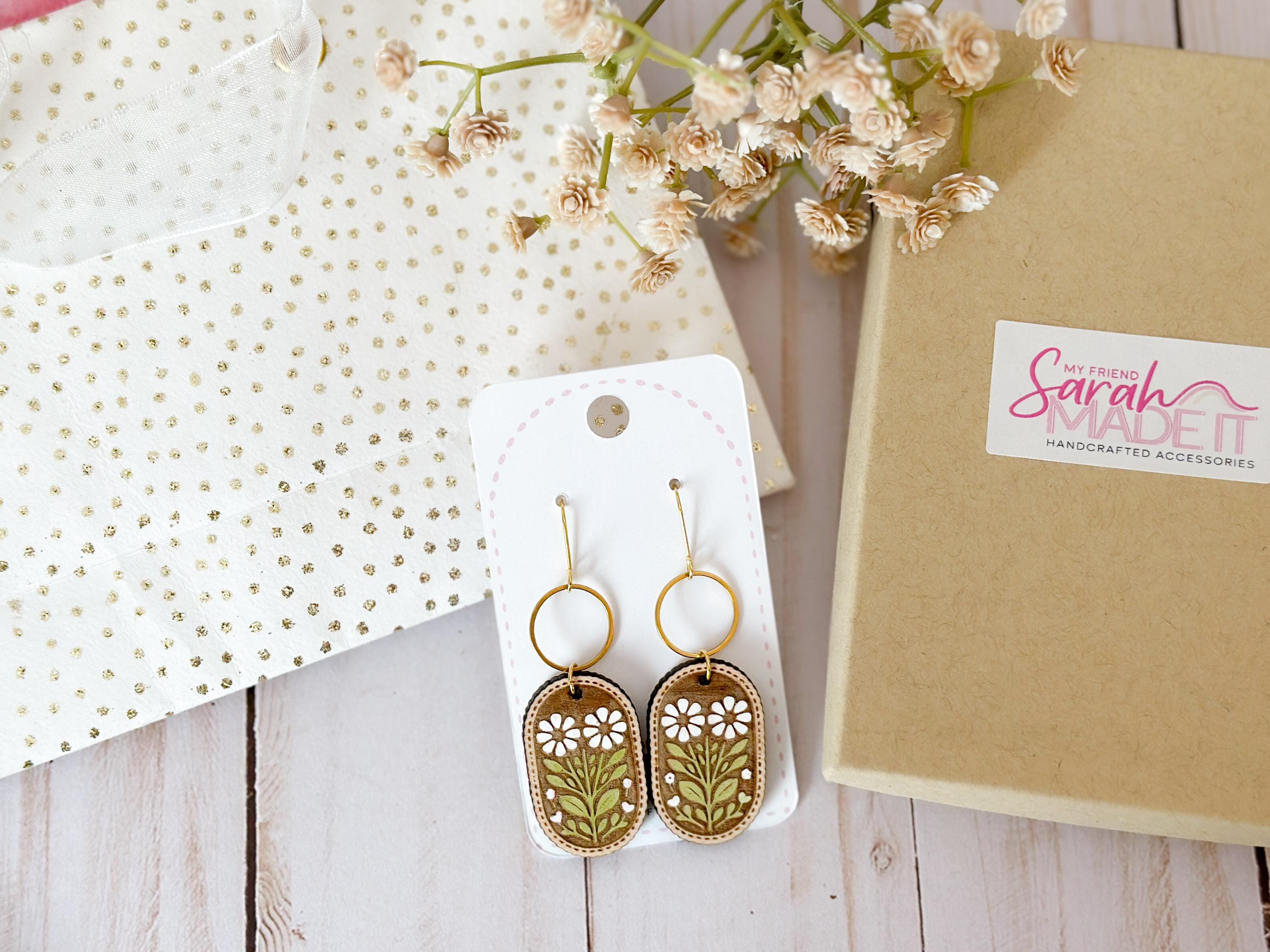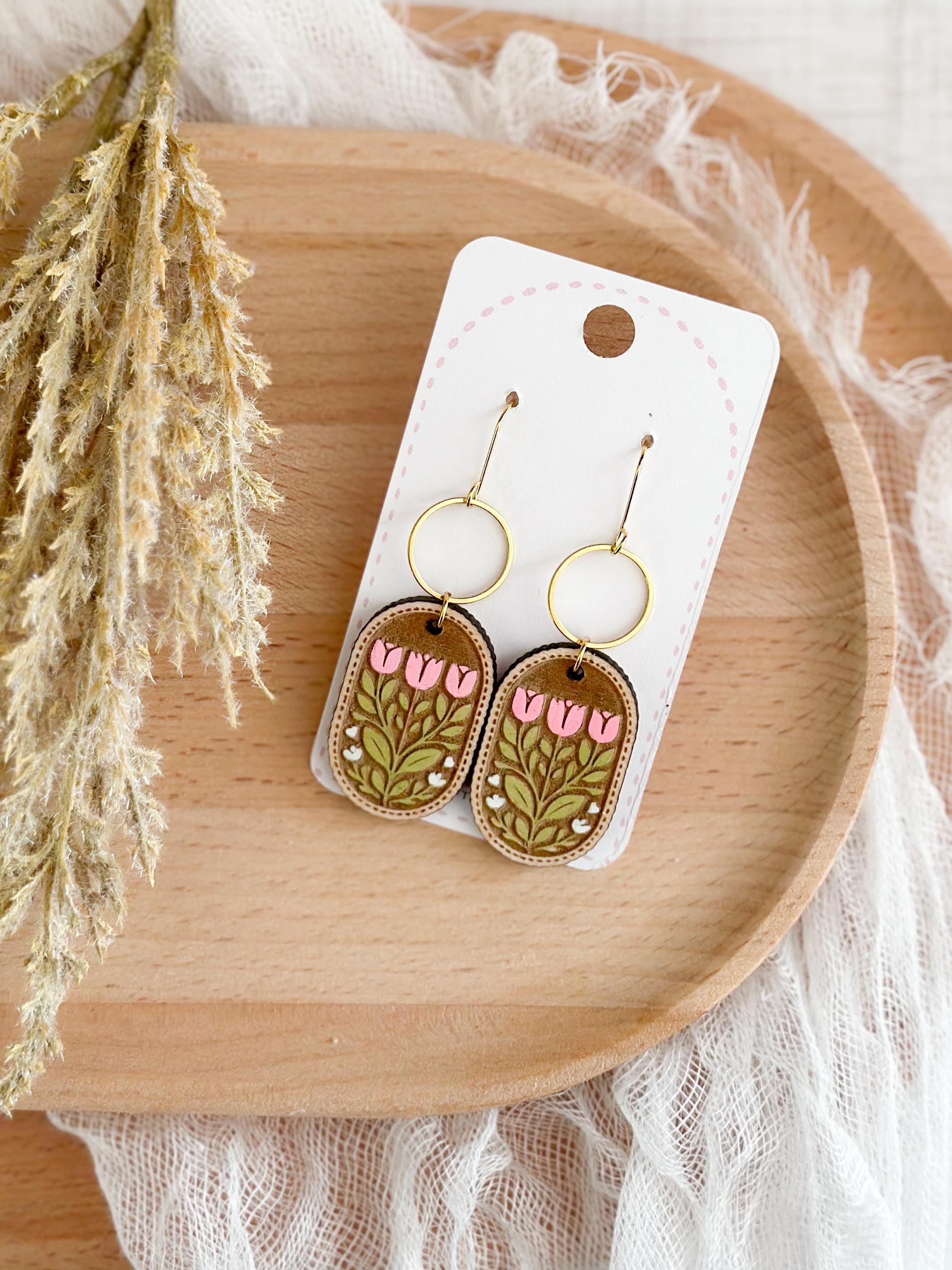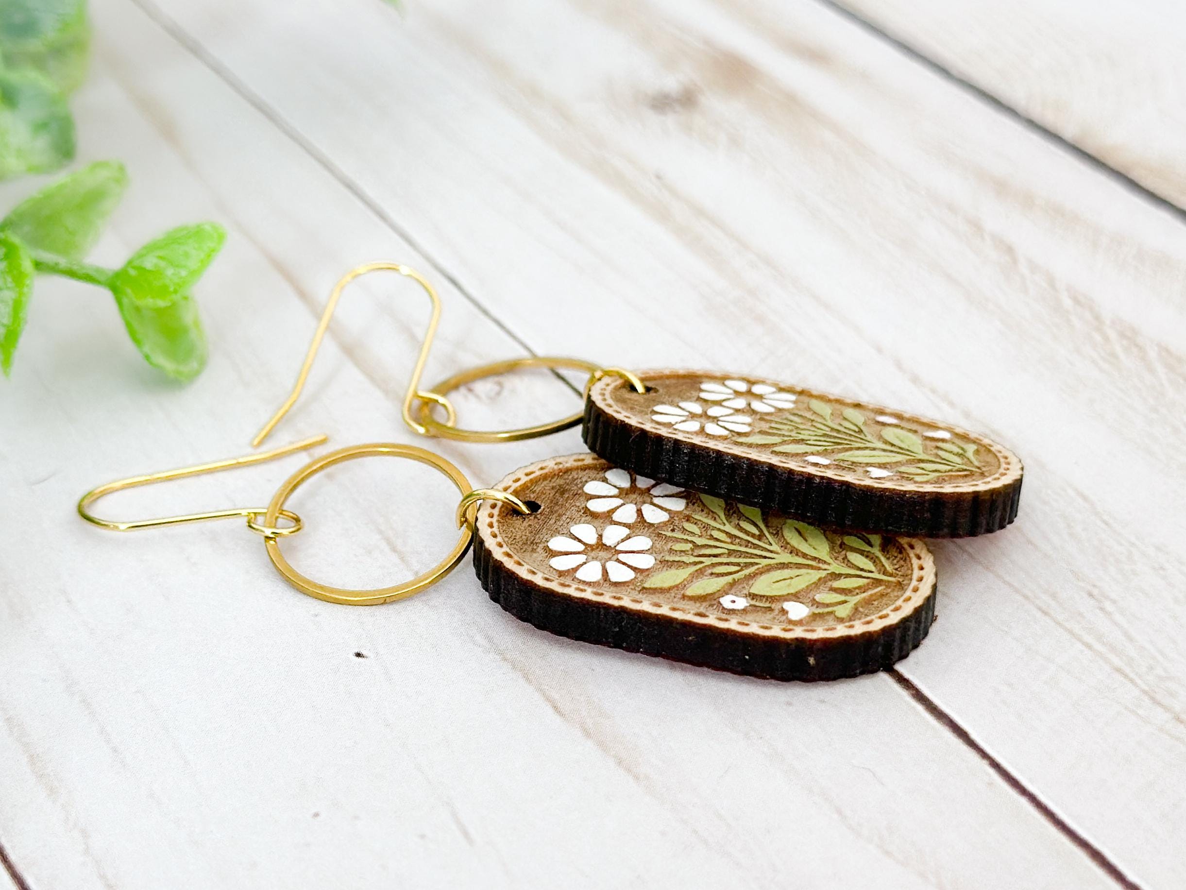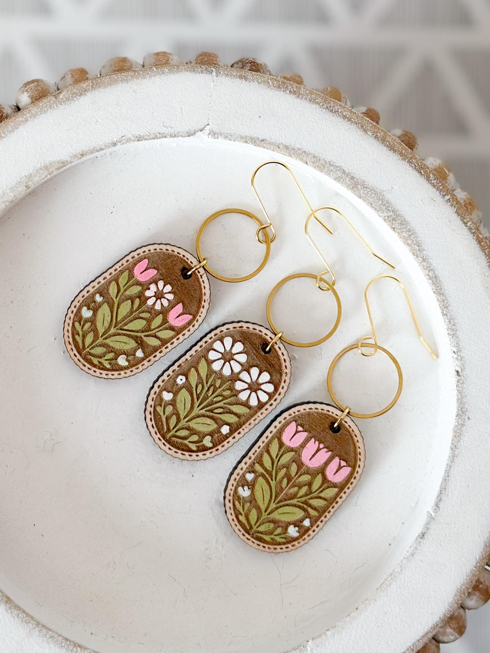 These hand painted wooden earrings feature delicate floral details with a lightweight, easy-to-wear feel. Choose from white daisies, pink tulips, or a mixed floral design, each finished with a gold accent for a polished touch.