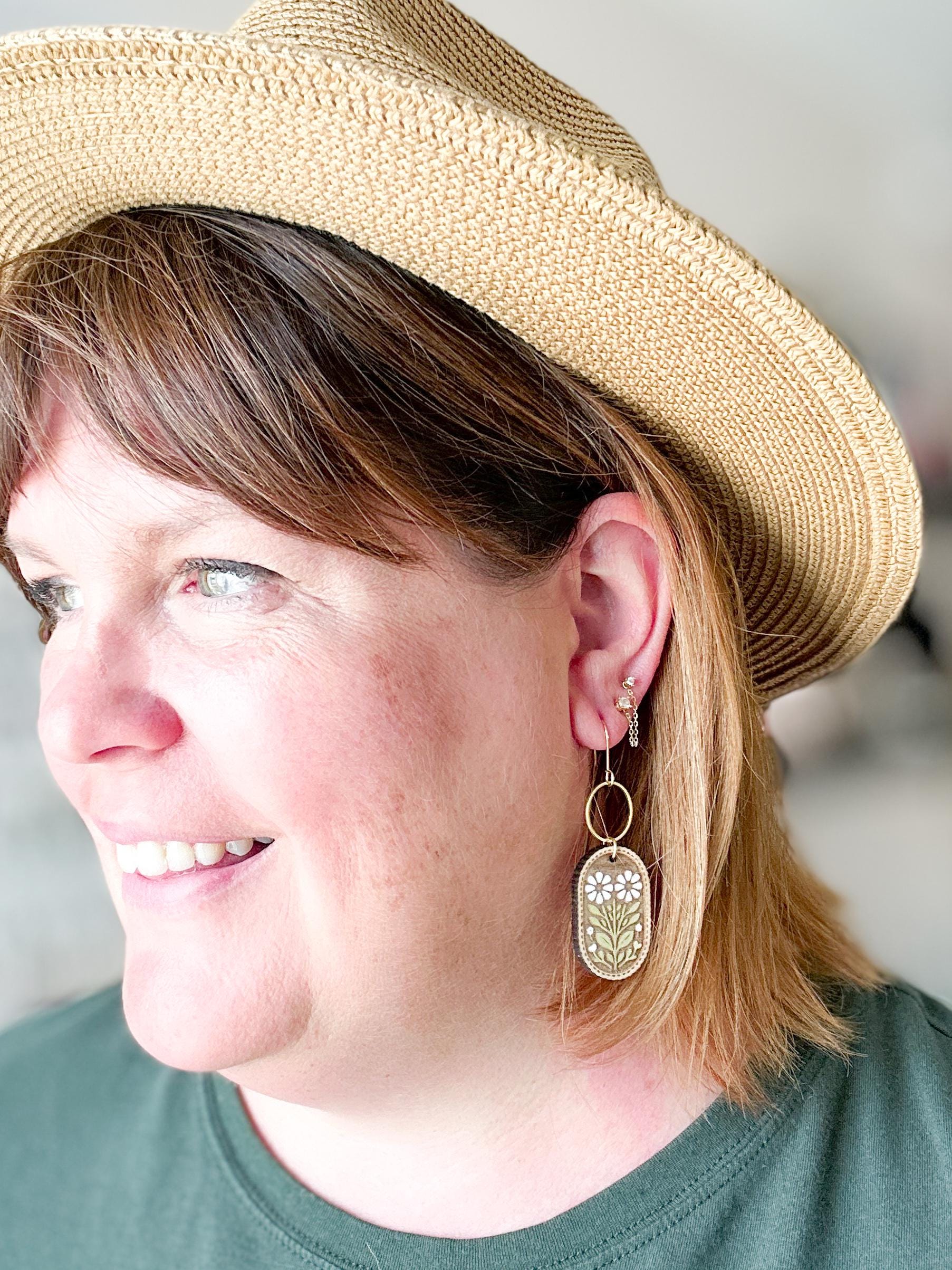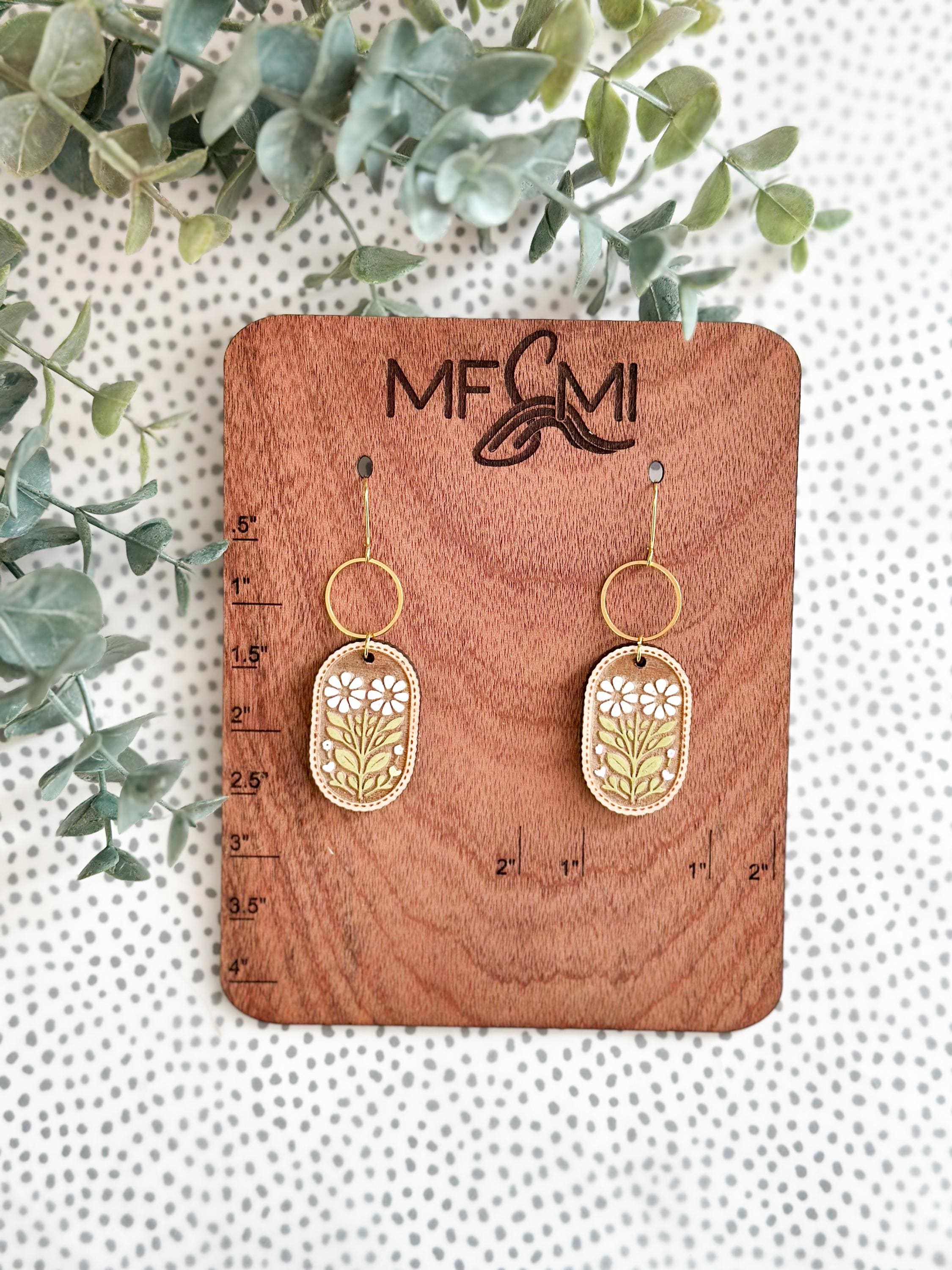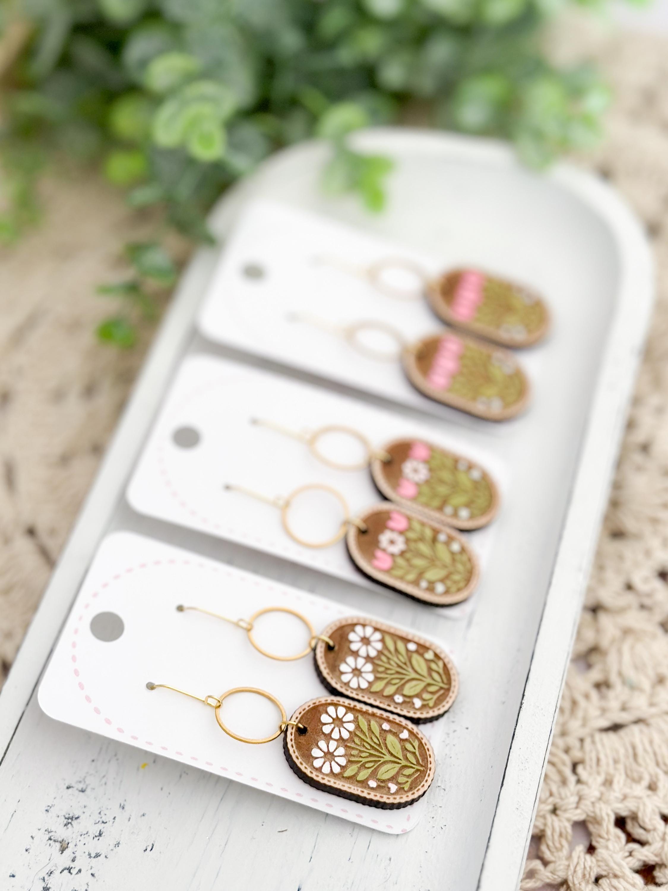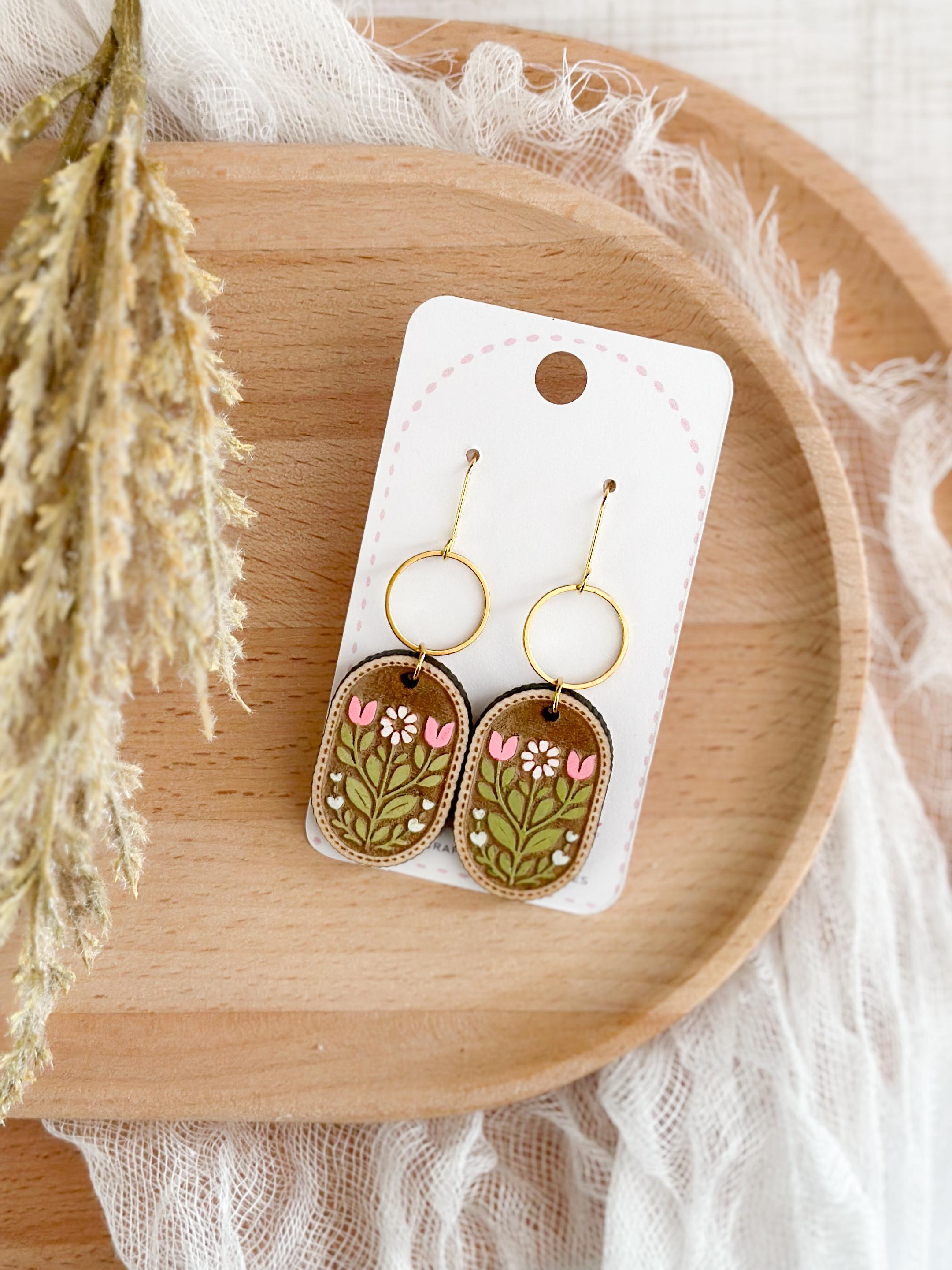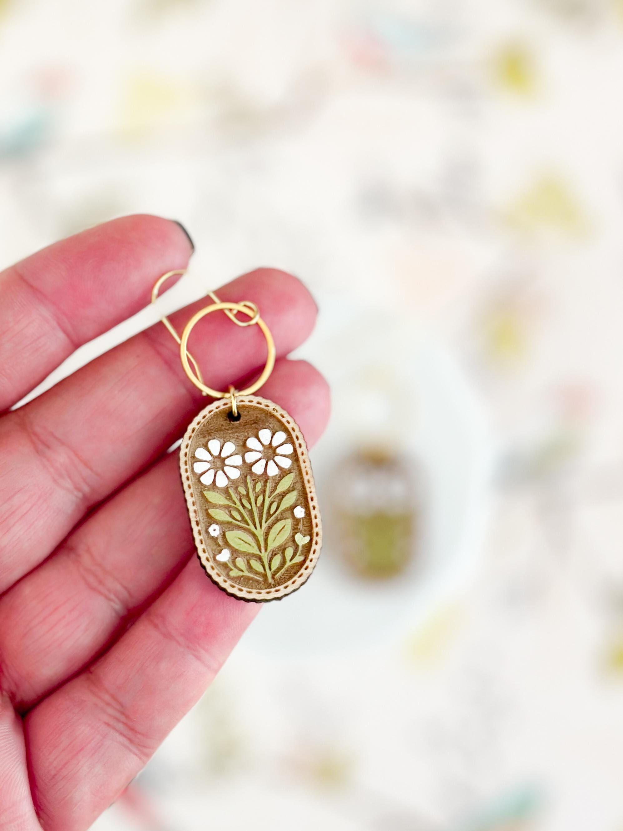 These hand painted wooden earrings feature delicate floral details with a lightweight, easy-to-wear feel. Choose from white daisies, pink tulips, or a mixed floral design, each finished with a gold accent for a polished touch.