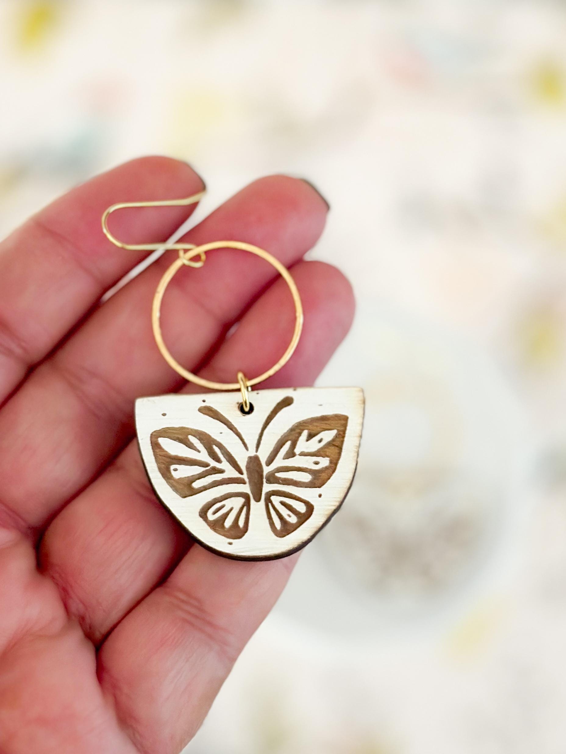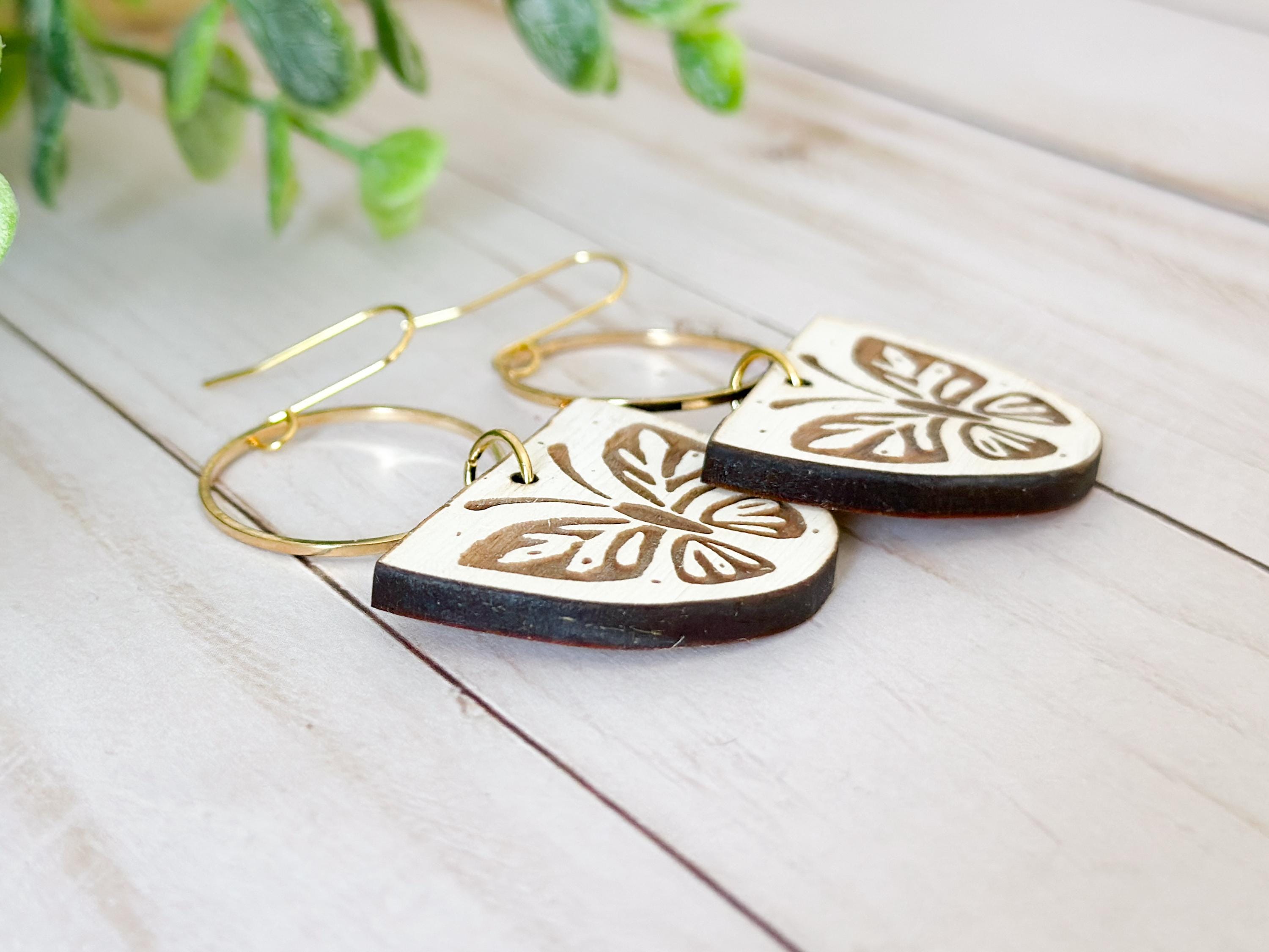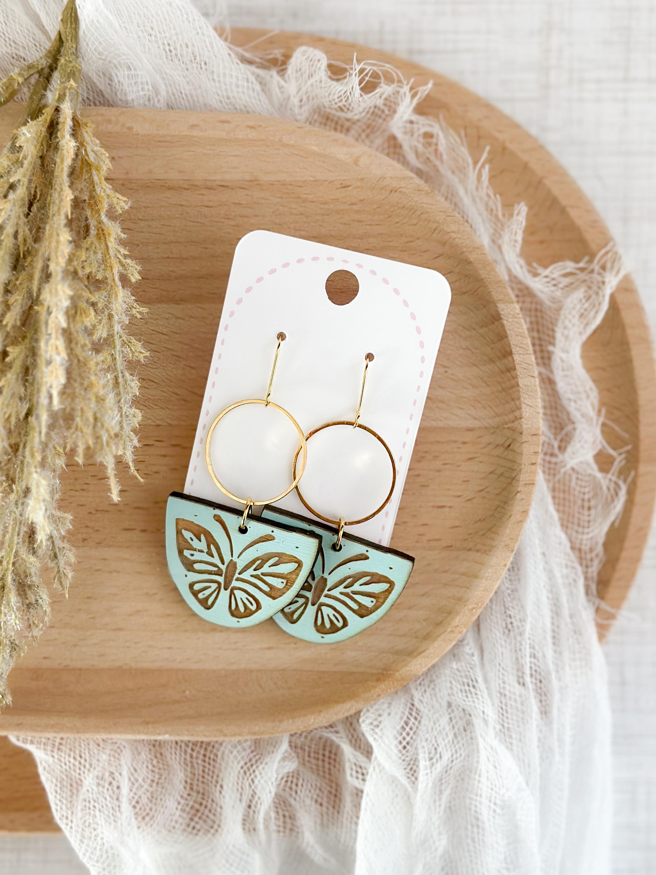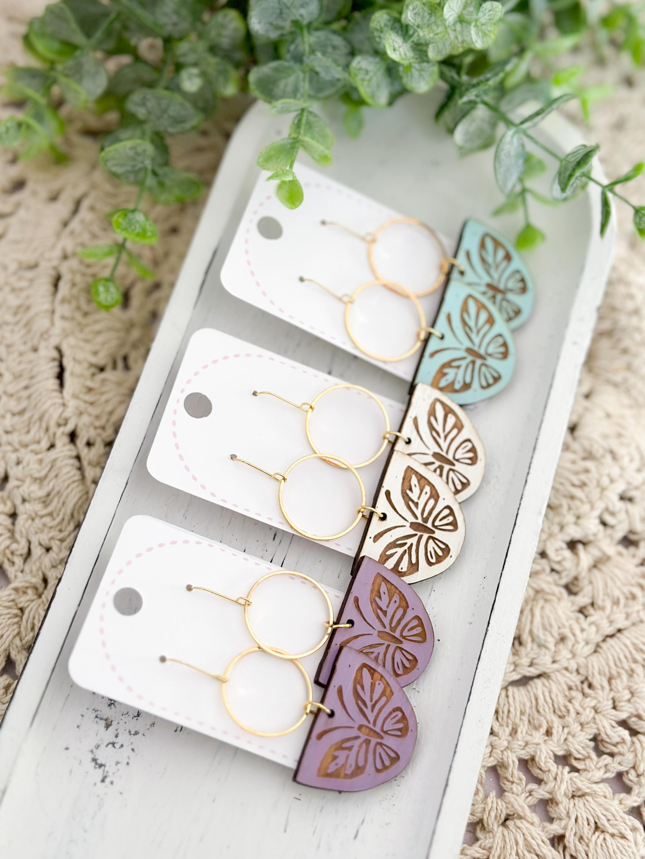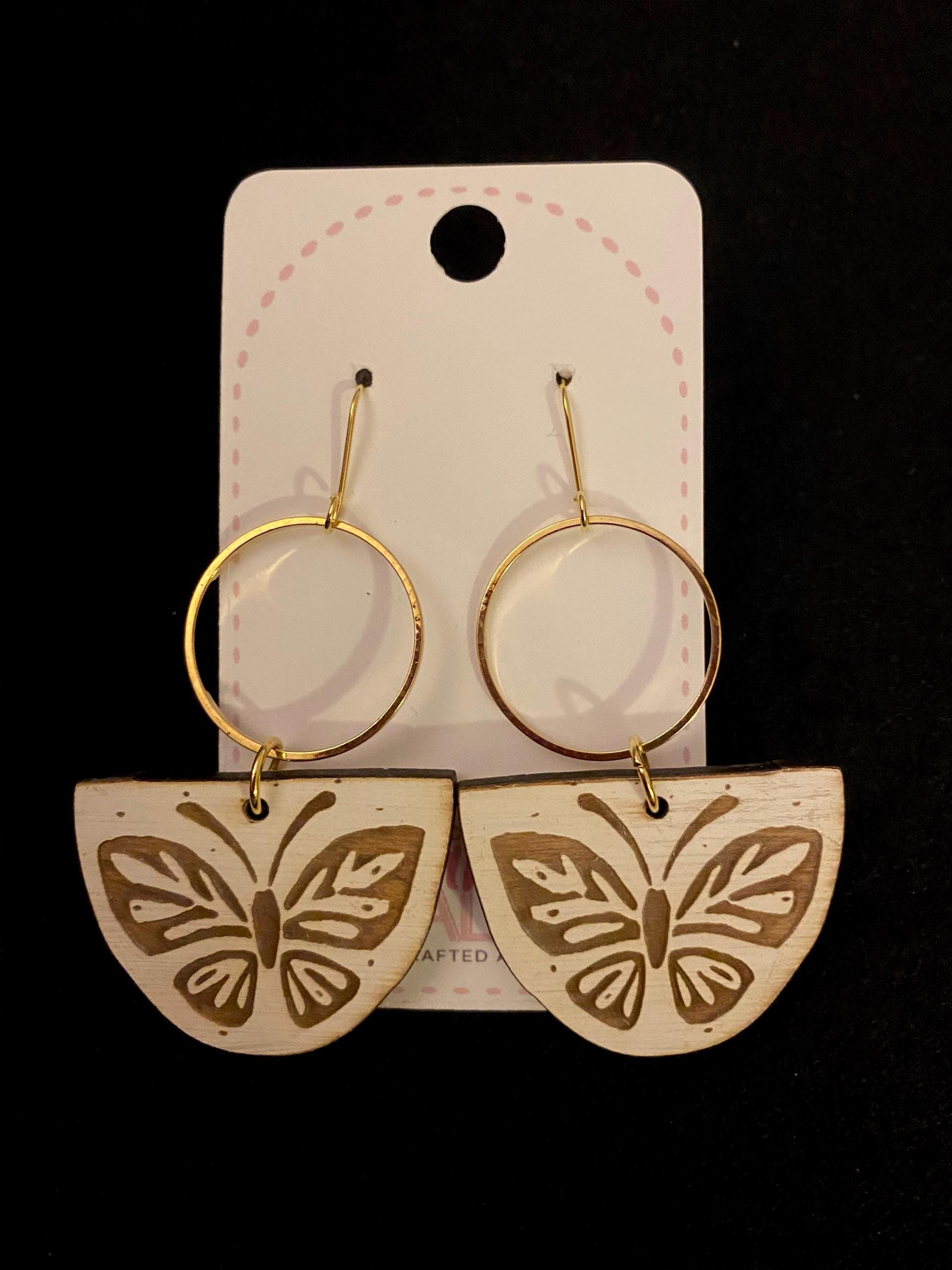These hand painted wooden earrings feature an engraved butterfly design in soft, wearable colors with a lightweight feel. Finished with slim gold ring accents, they create a longer, eye-catching silhouette that still feels easy to wear.