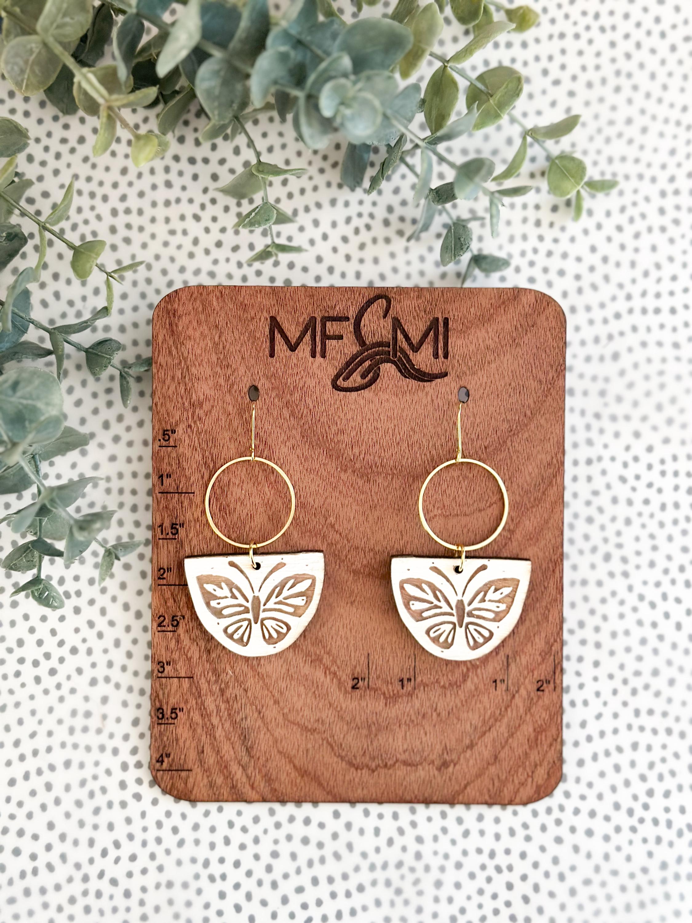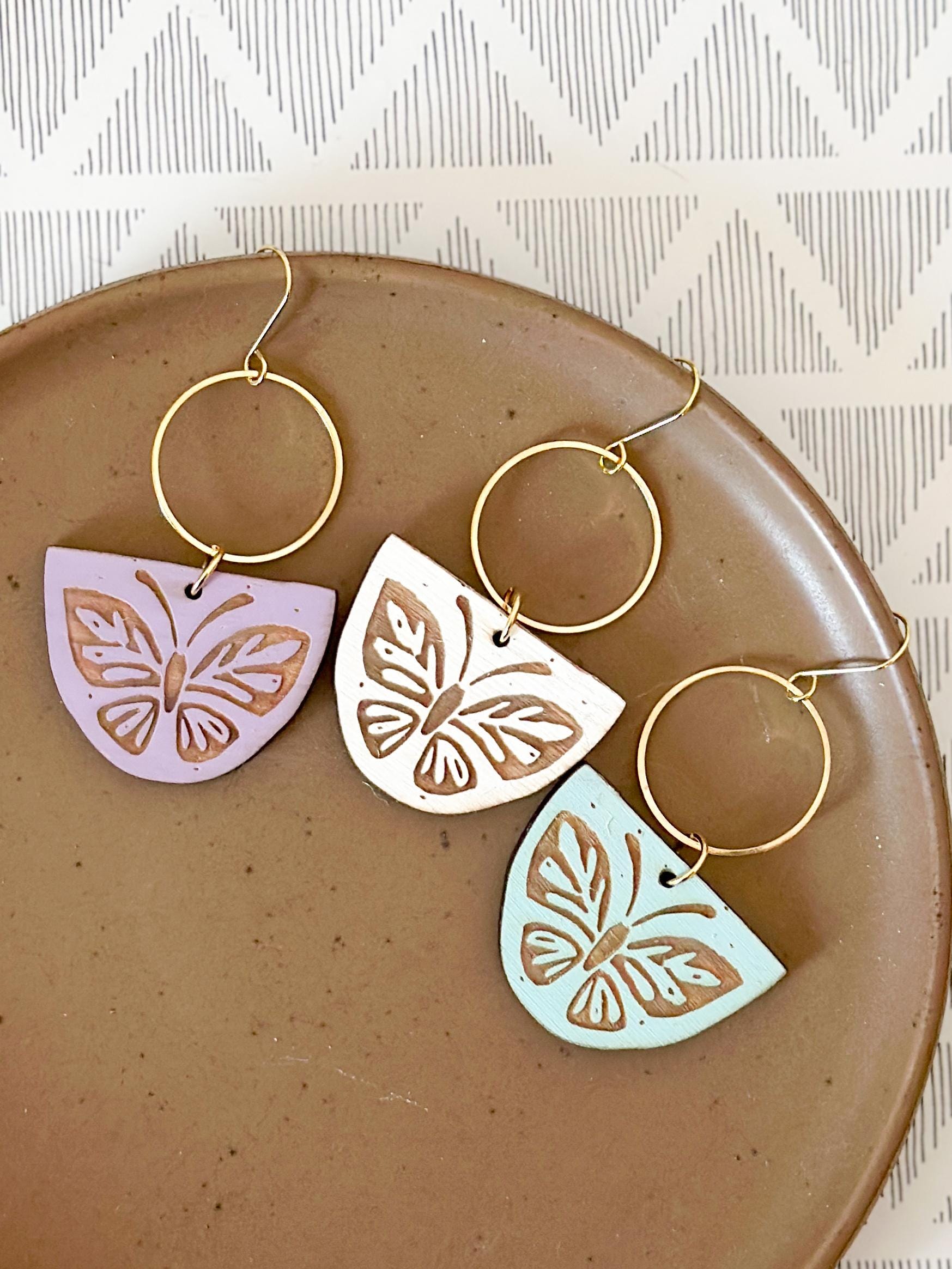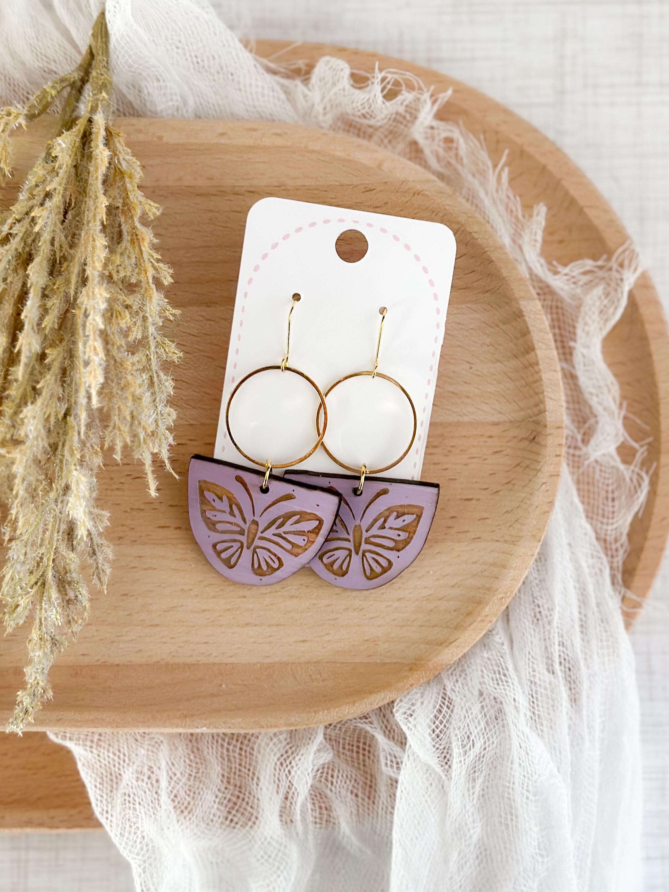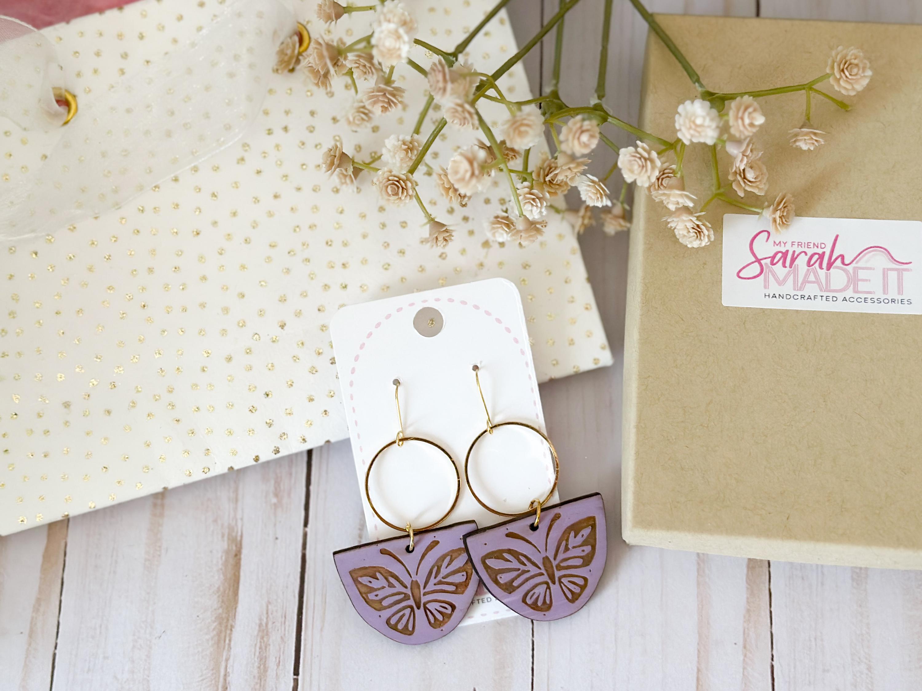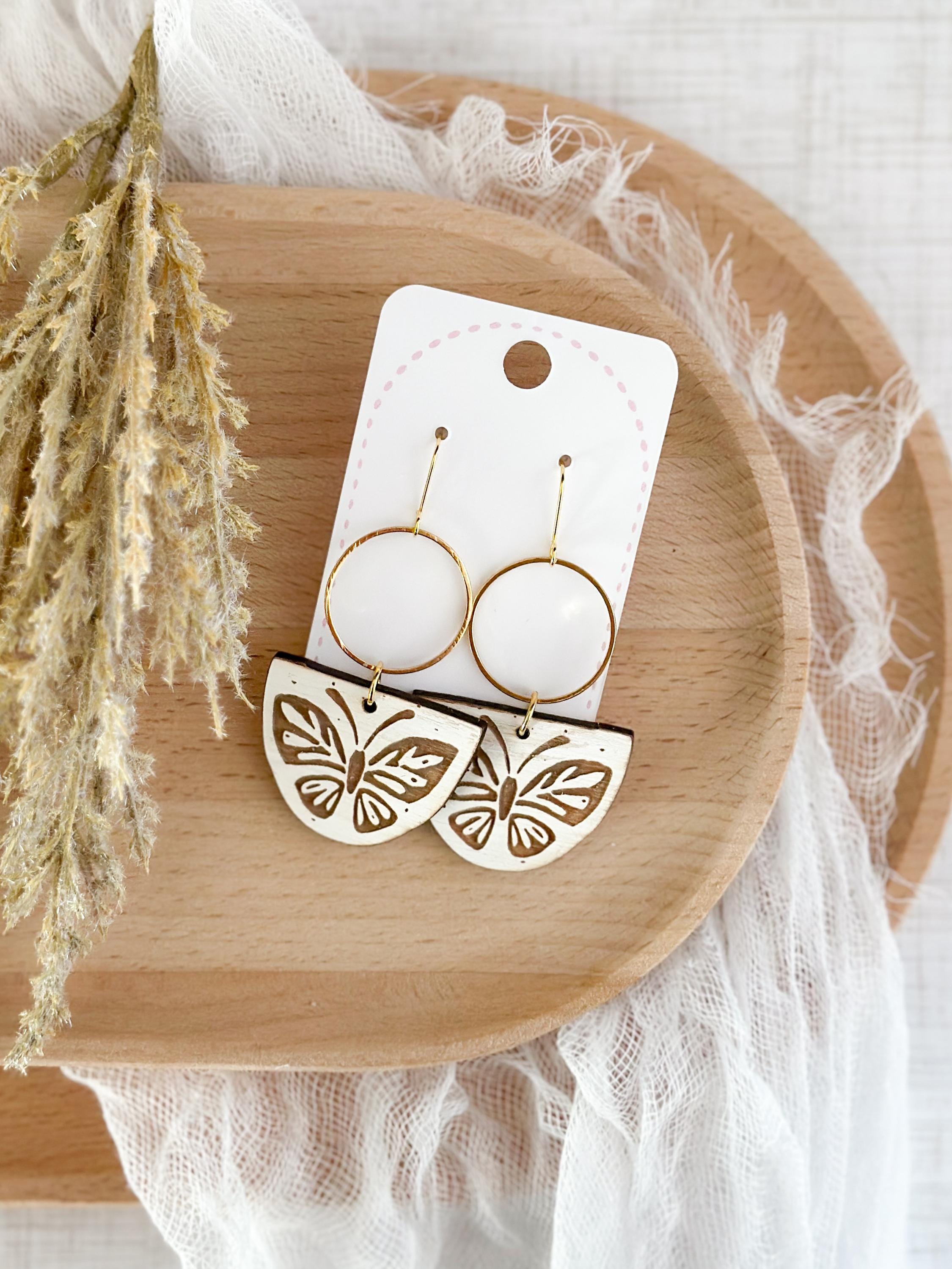 These hand painted wooden earrings feature an engraved butterfly design in soft, wearable colors with a lightweight feel. Finished with slim gold ring accents, they create a longer, eye-catching silhouette that still feels easy to wear.