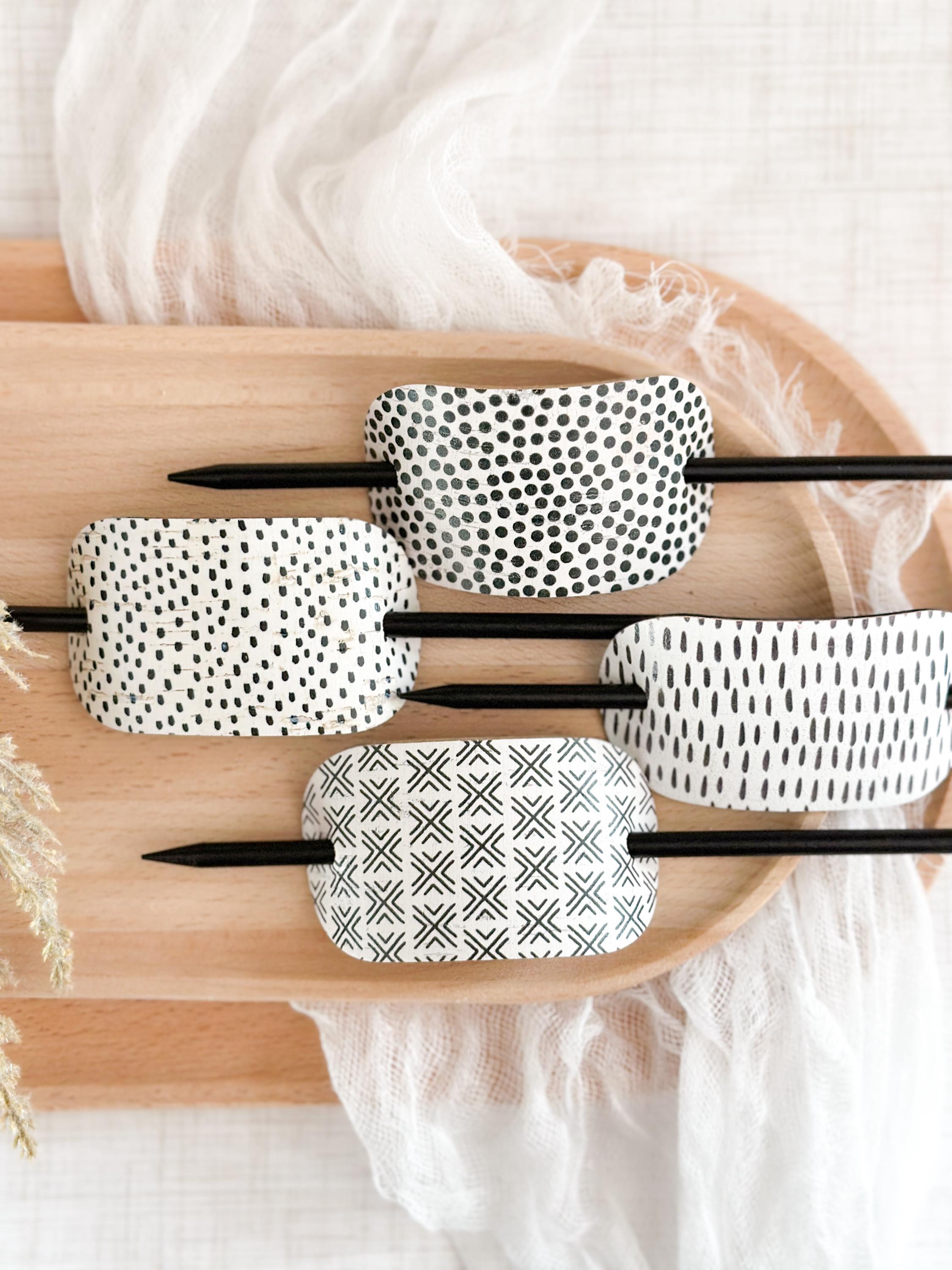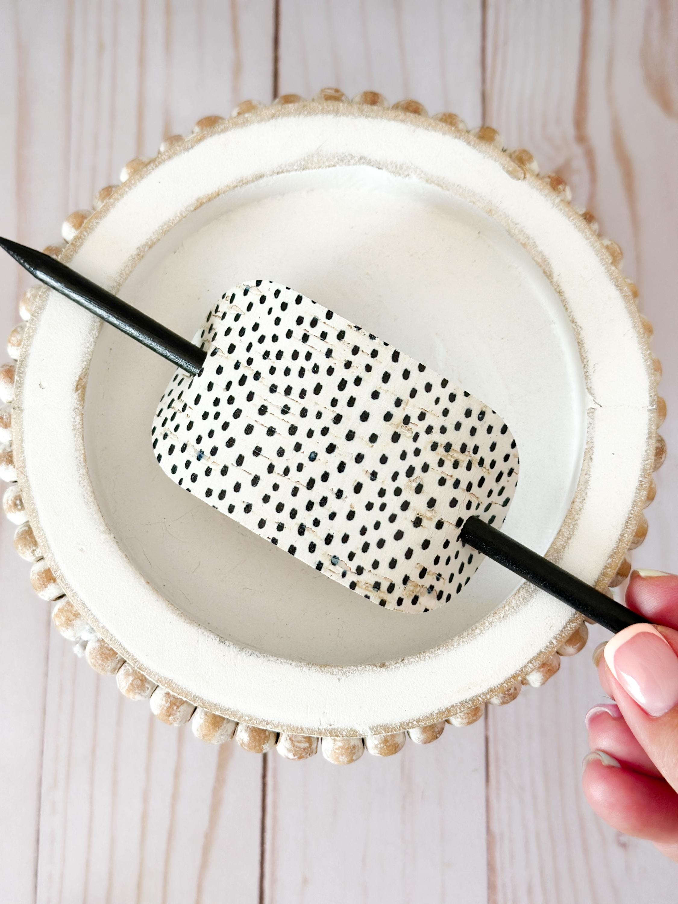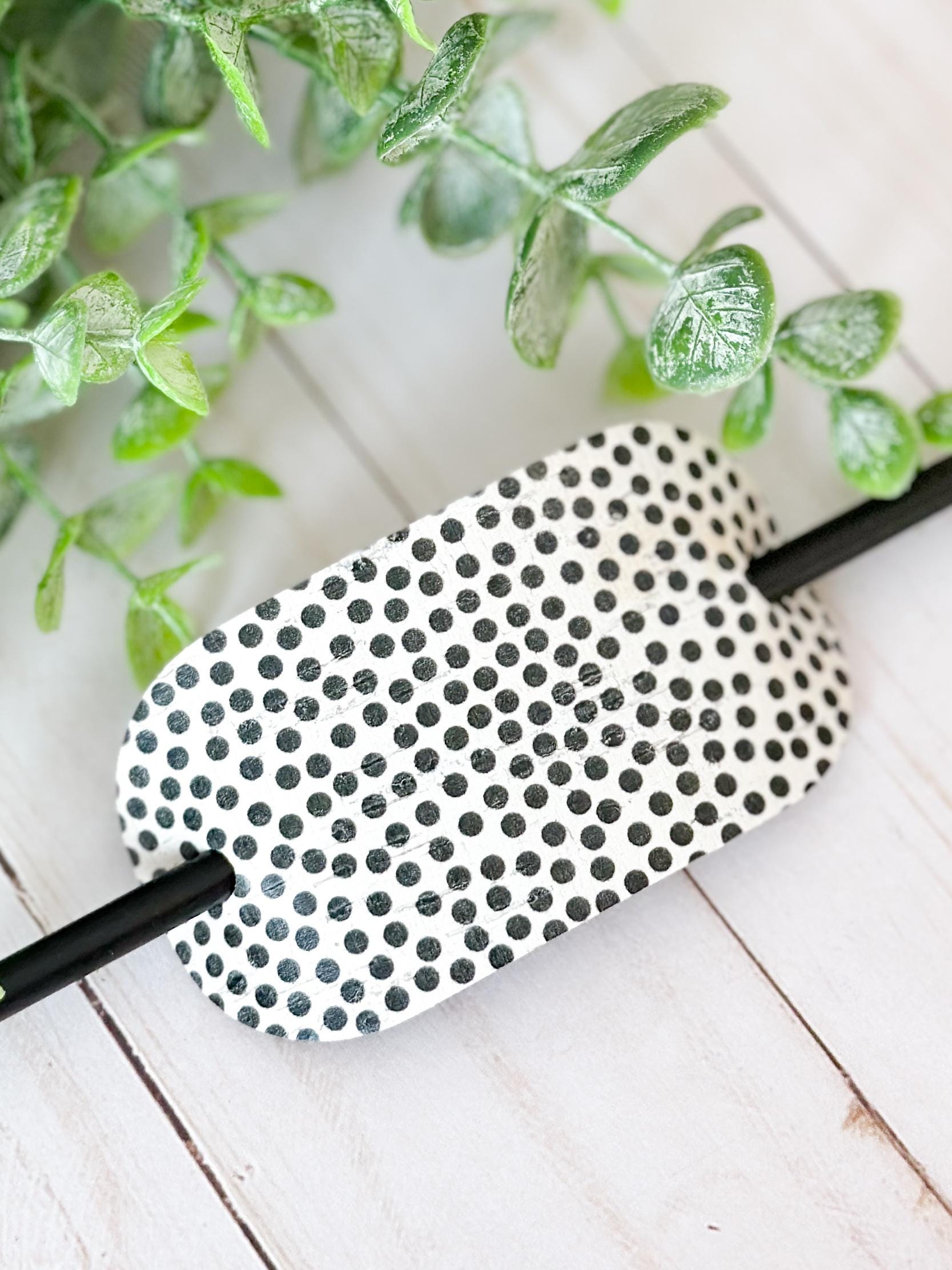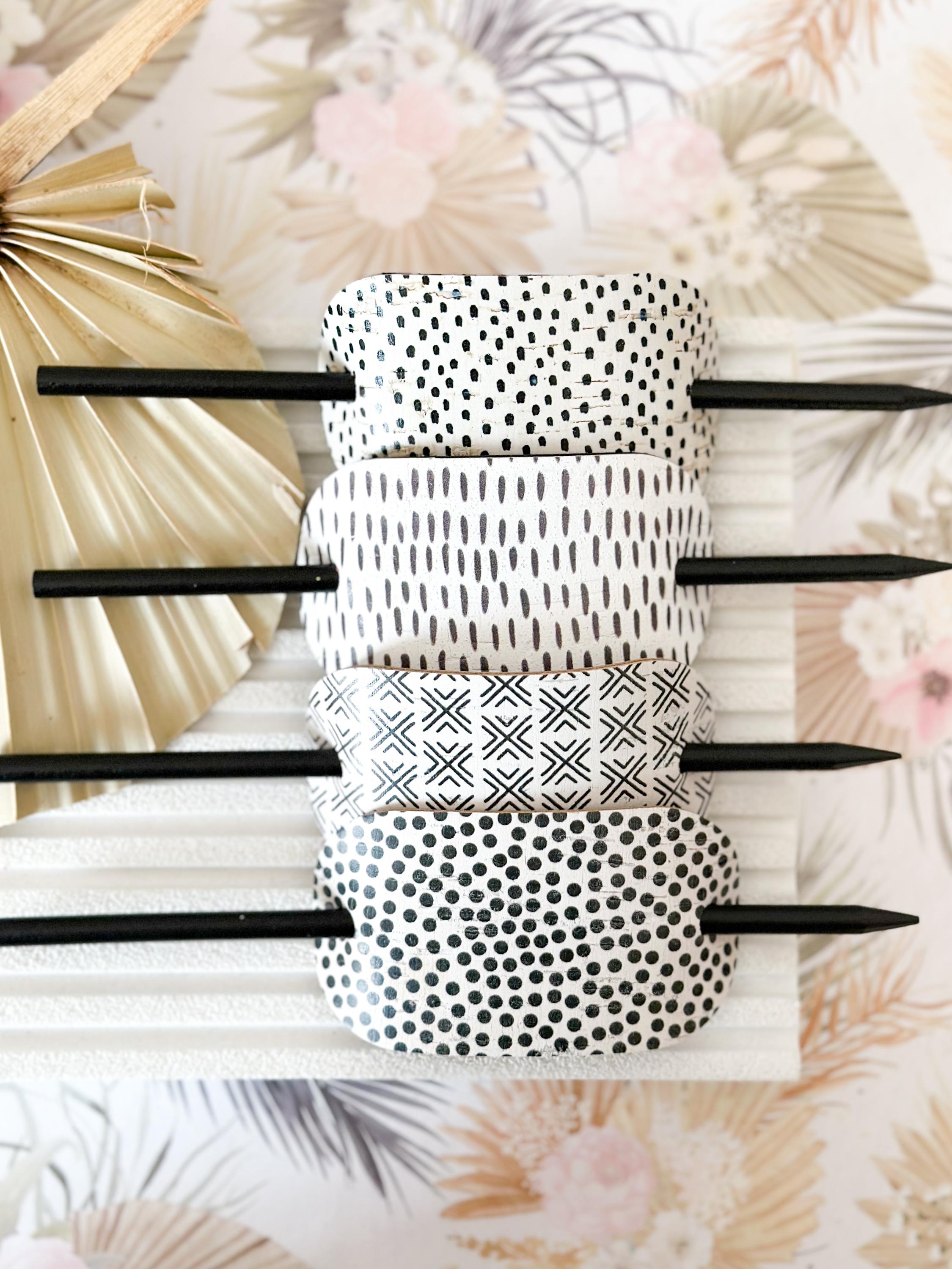 Elevate your ponytail! These cork on leather hair cuffs feature a white background with modern black prints for a clean, easy-to-style look. Designed to wrap around your ponytail or bun, it instantly elevates a simple hairstyle.