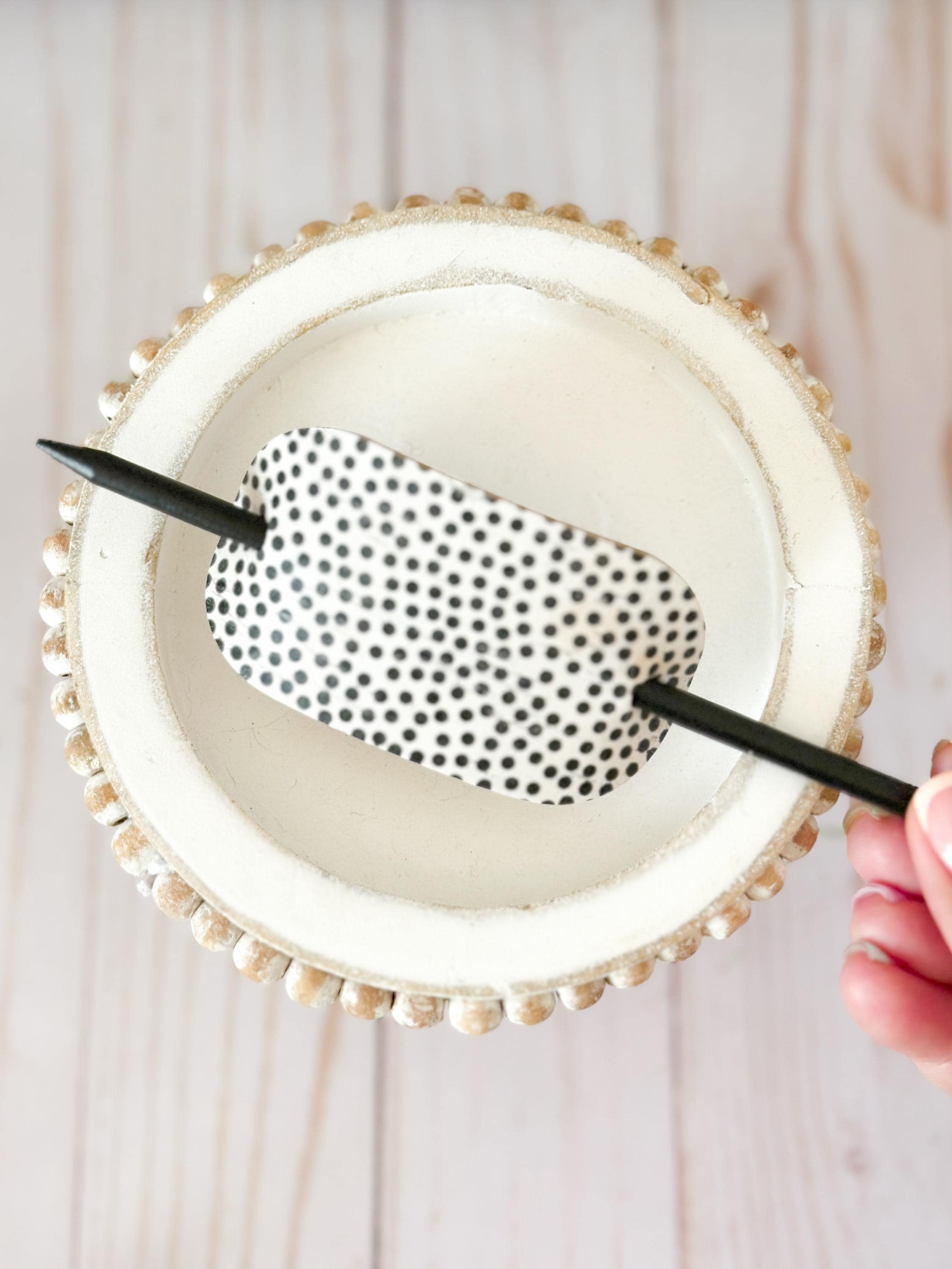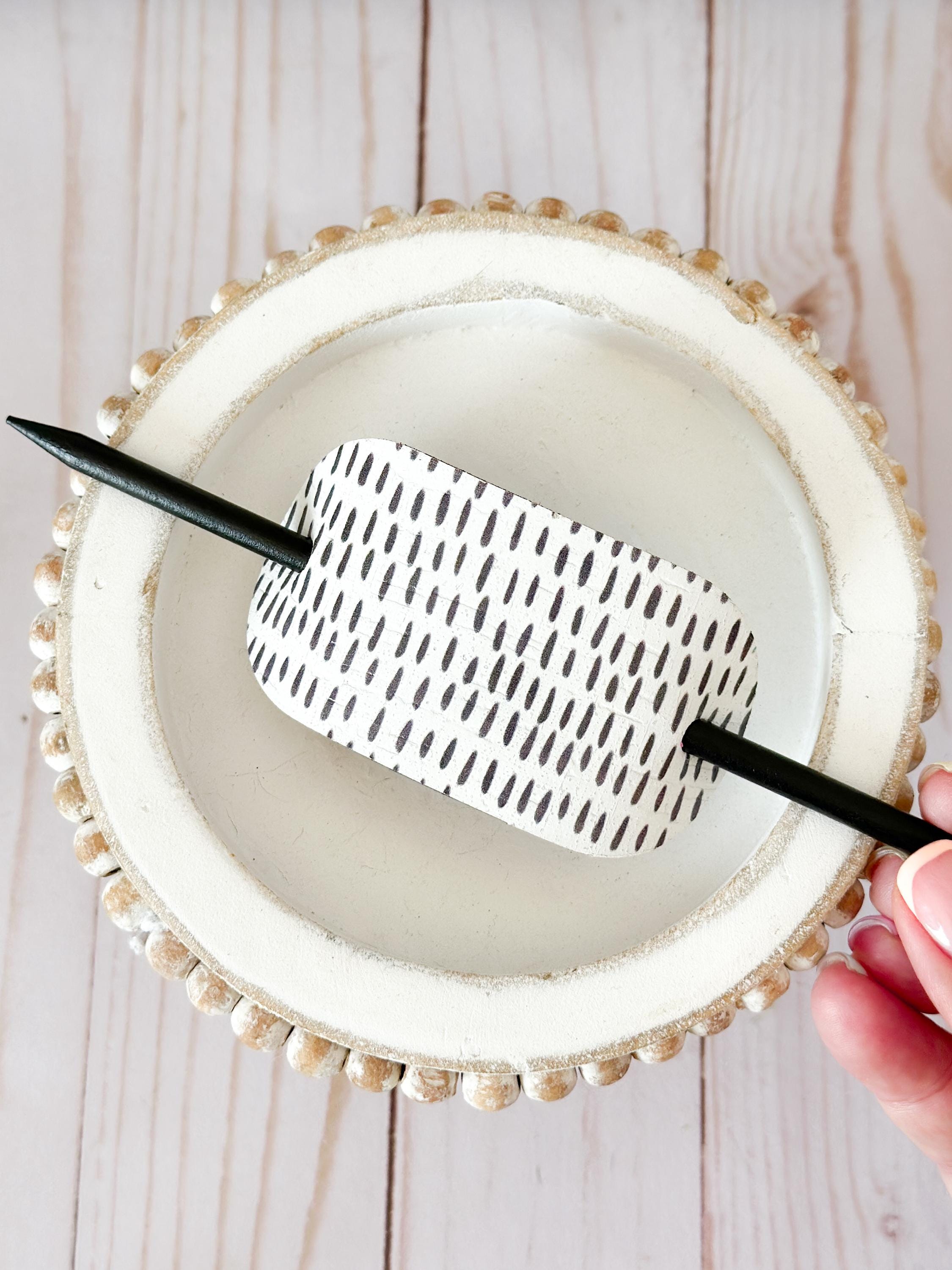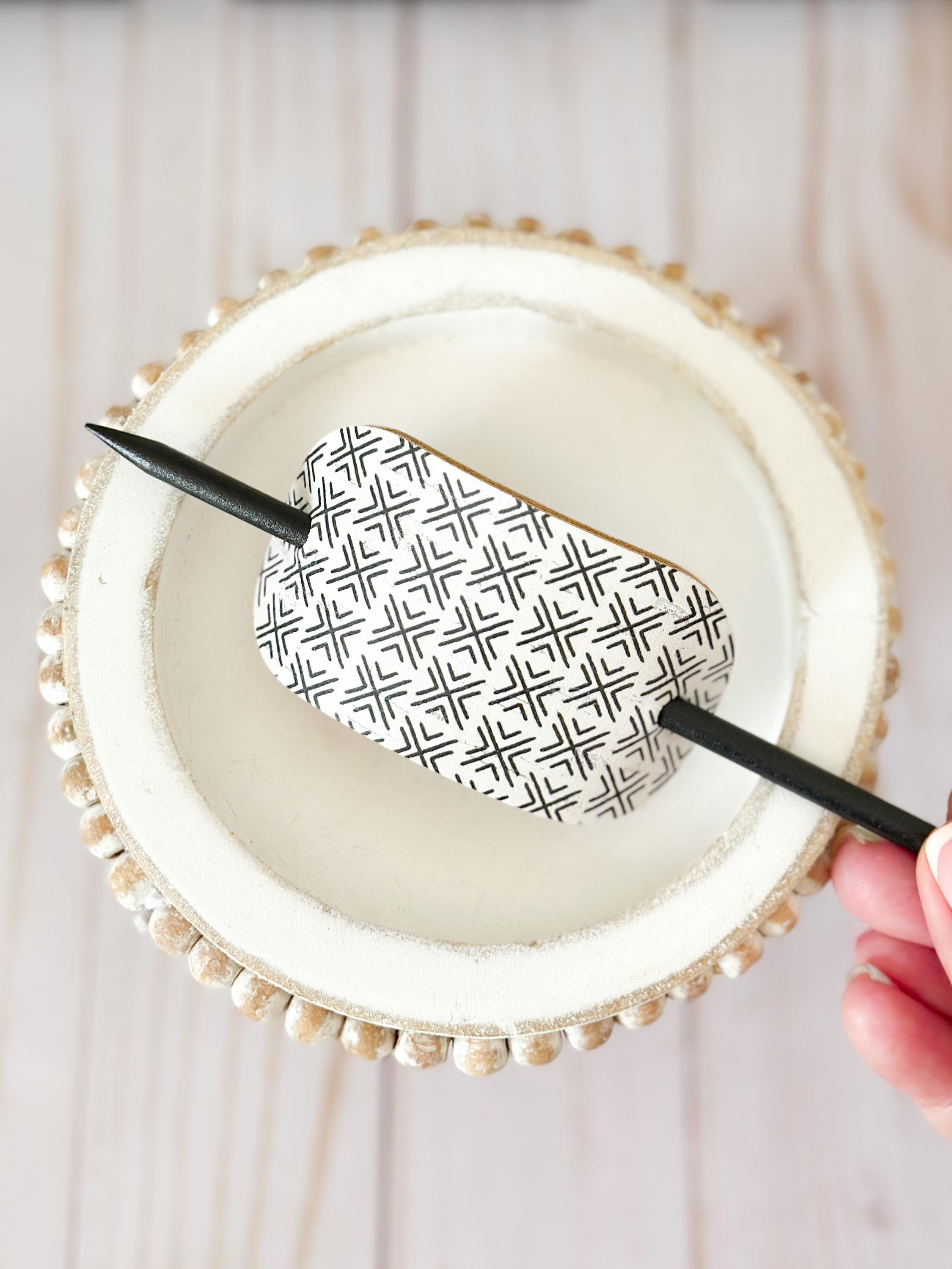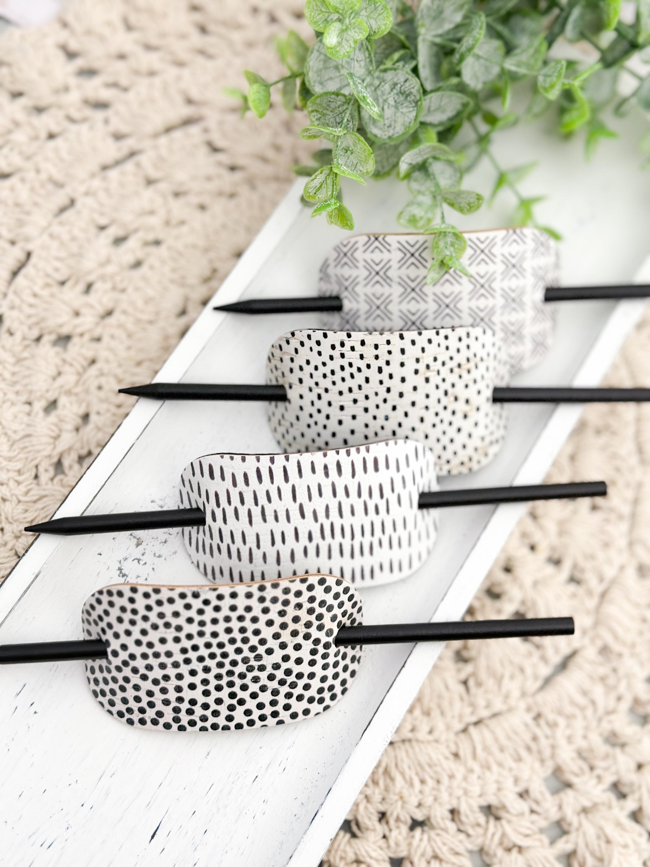 Elevate your ponytail! These cork on leather hair cuffs feature a white background with modern black prints for a clean, easy-to-style look. Designed to wrap around your ponytail or bun, it instantly elevates a simple hairstyle.