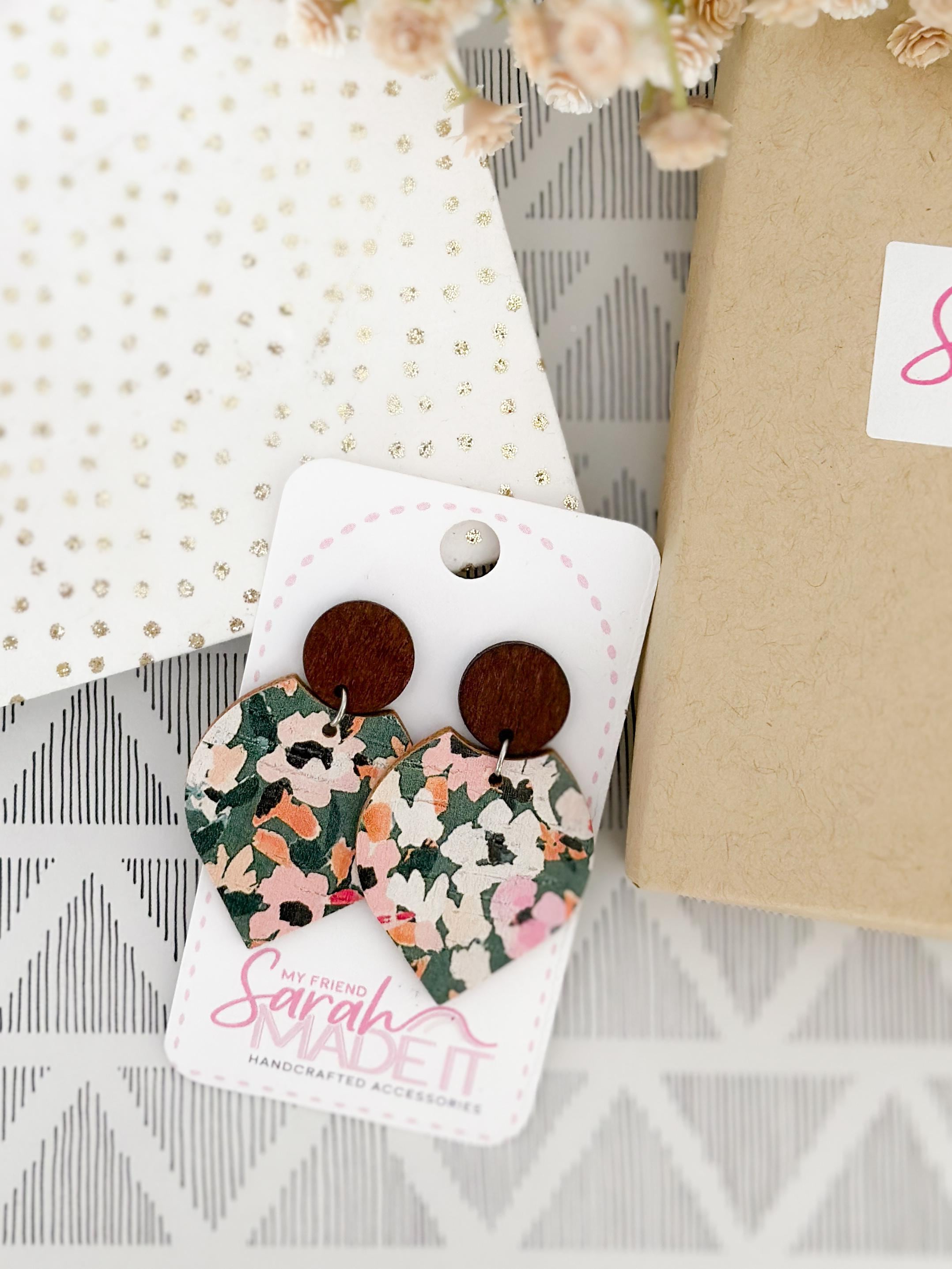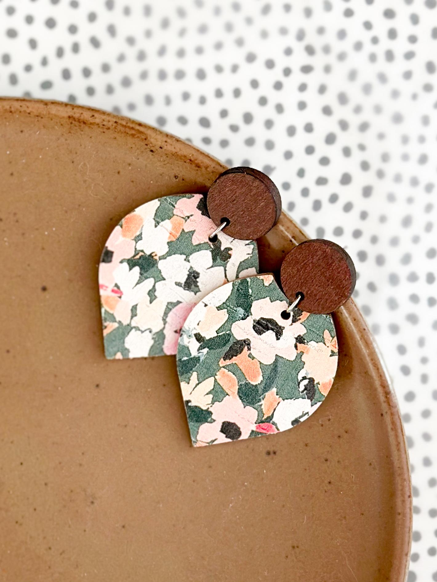 These sweet floral cork earrings feature a pastel wildflower print on green cork & is cut into my signature pointed petal shape and finished with a warm wood accent. The layered cork-on-leather design creates a statement look while staying lightweight and comfortable for all-day wear.