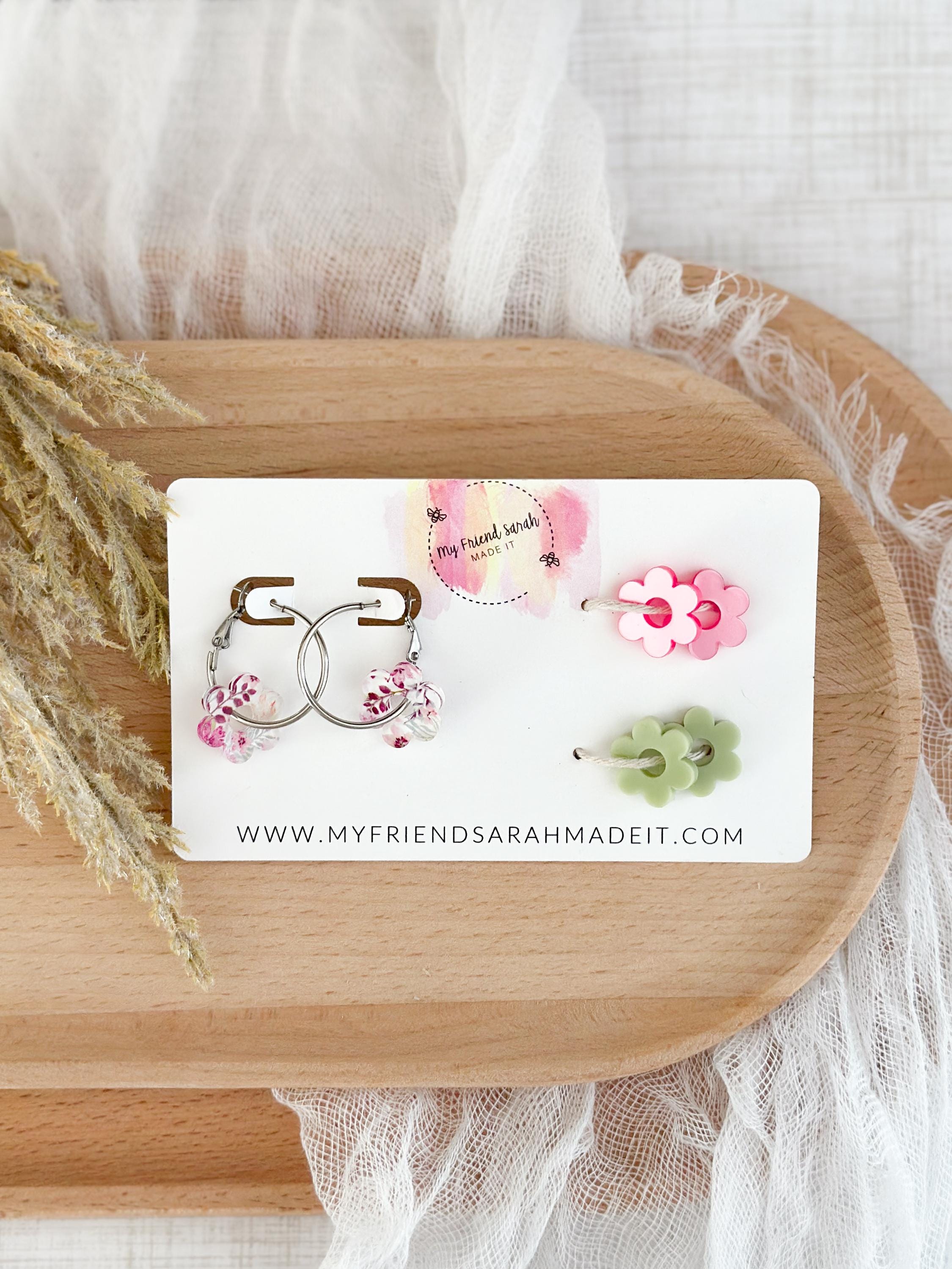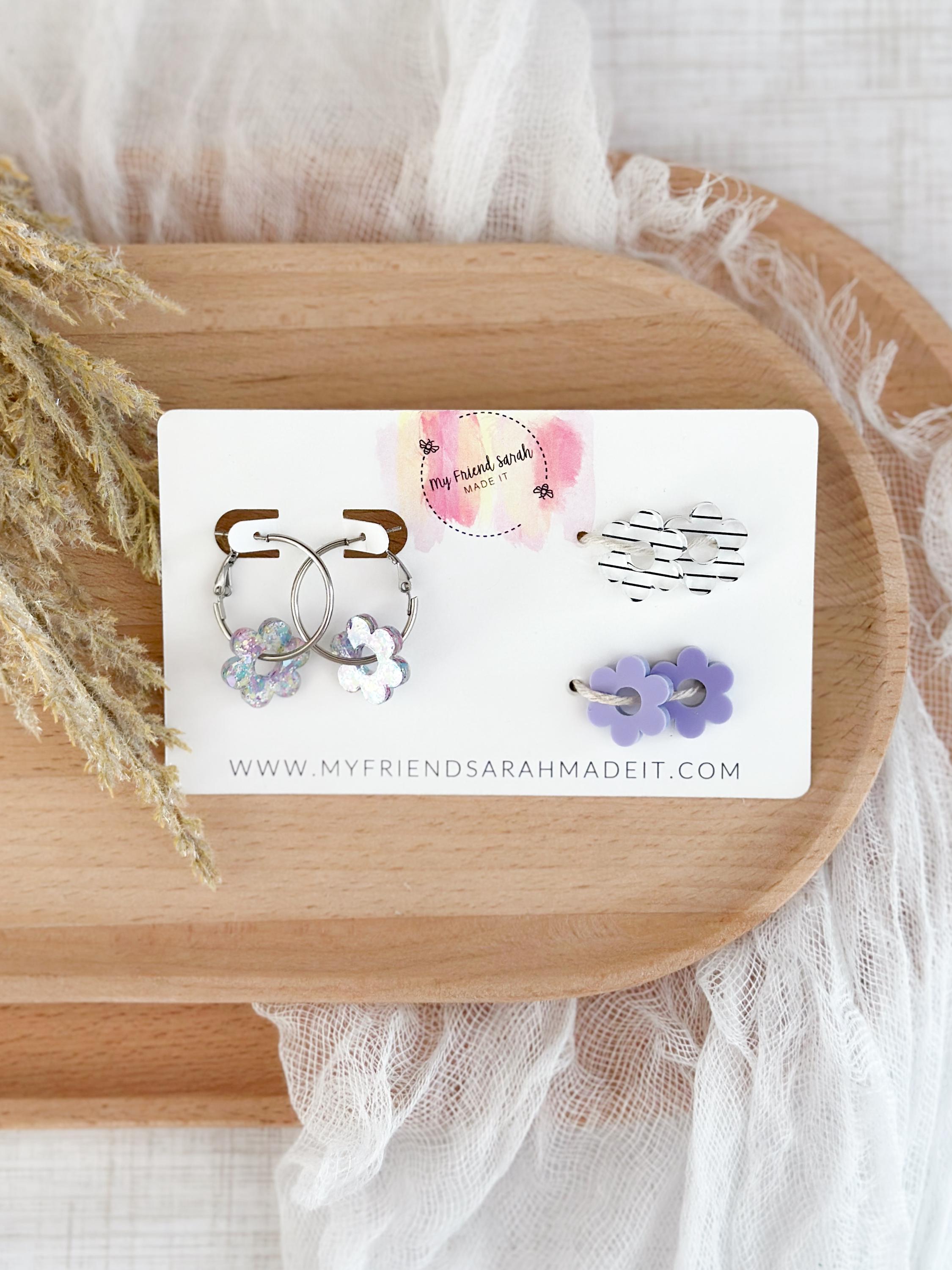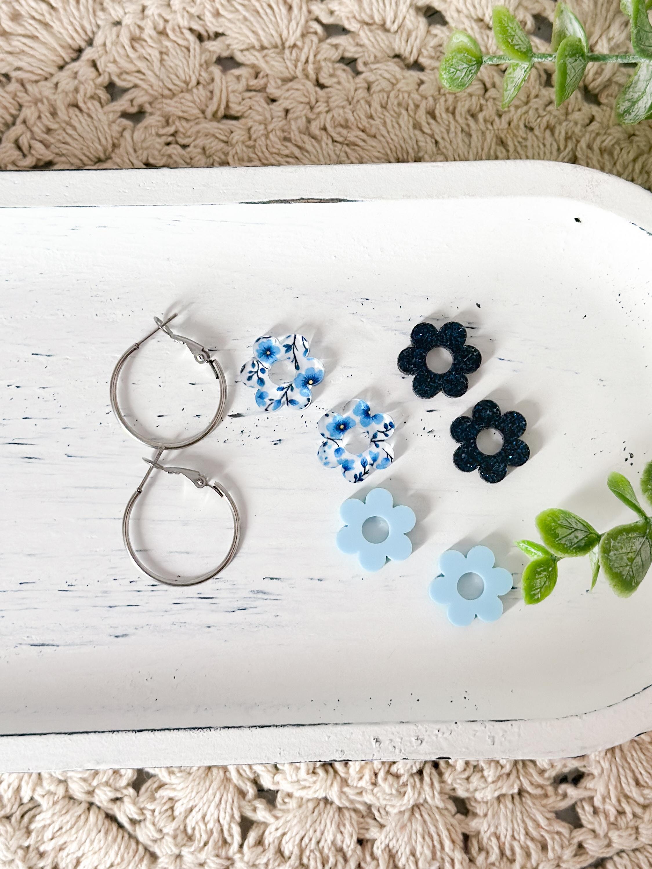 These interchangeable earring sets include one pair of hoops and three acrylic flower charms, giving you multiple looks in one easy set.