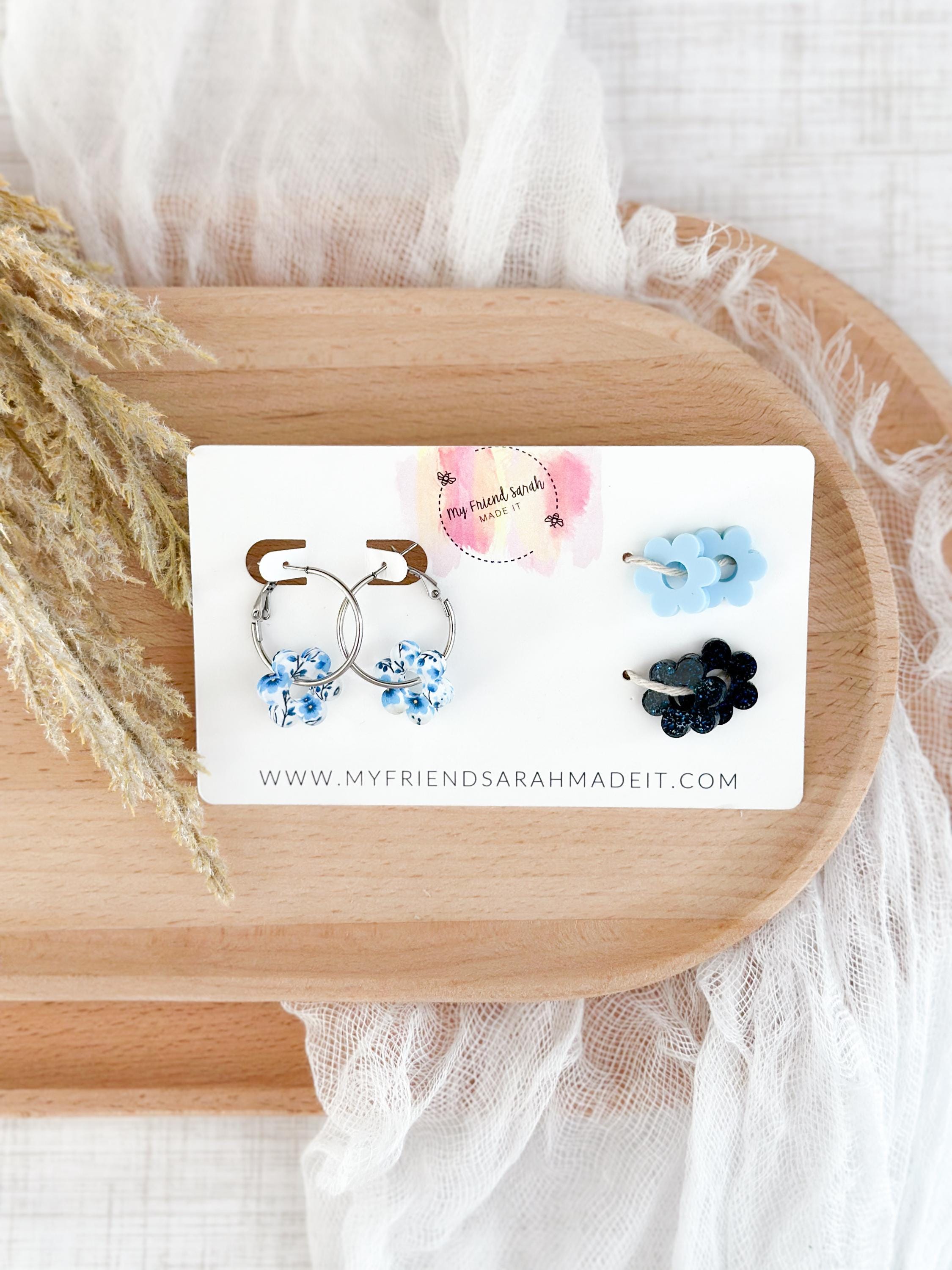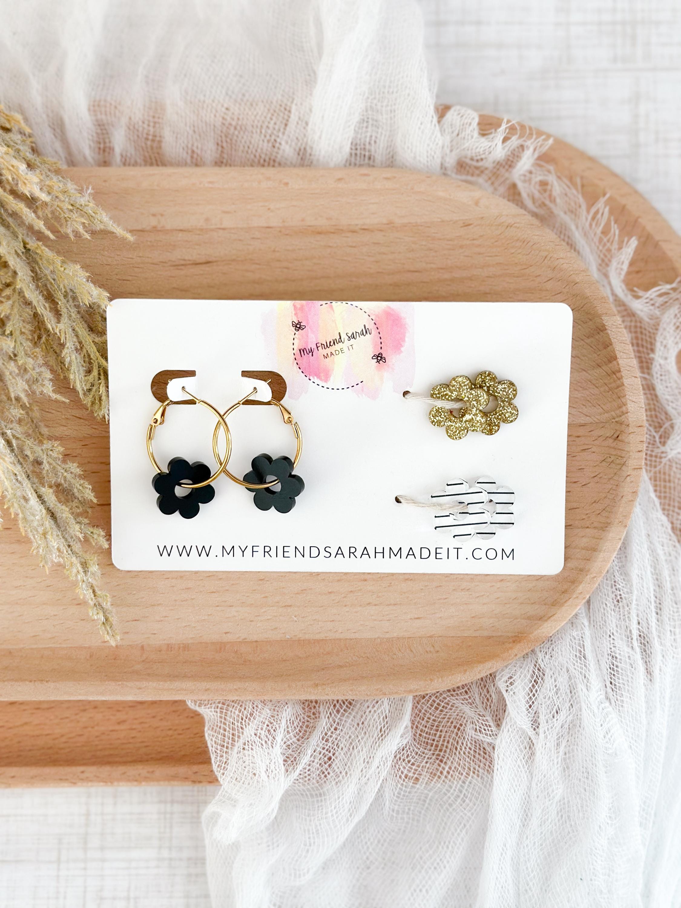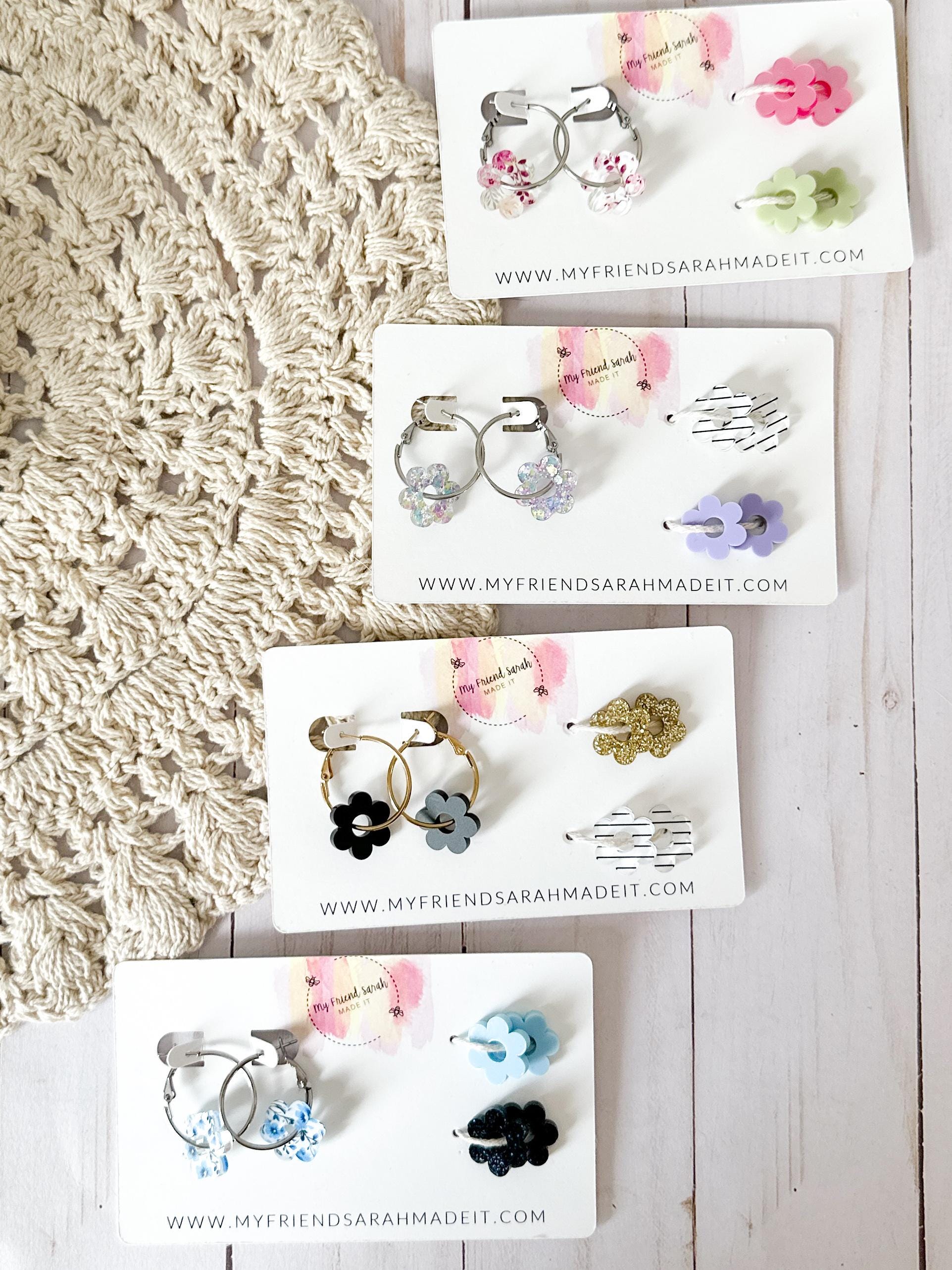 These interchangeable earring sets include one pair of hoops and three acrylic flower charms, giving you multiple looks in one easy set.
